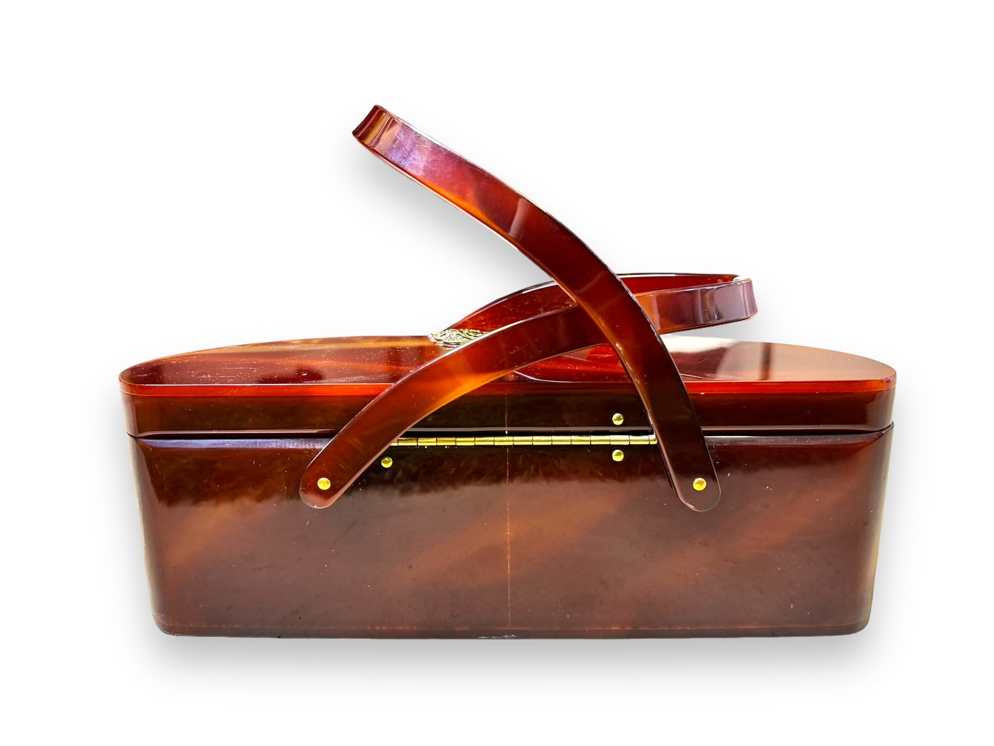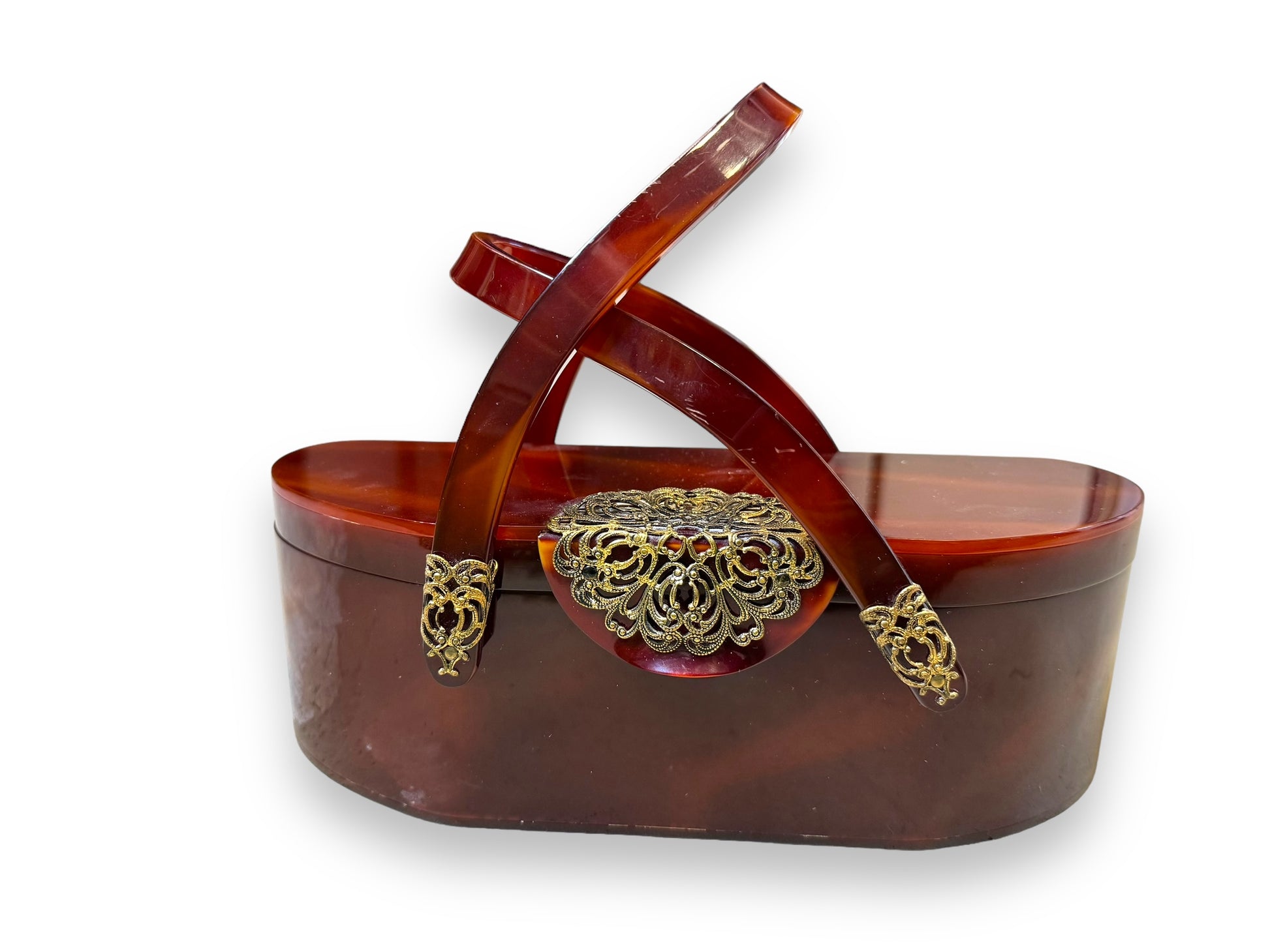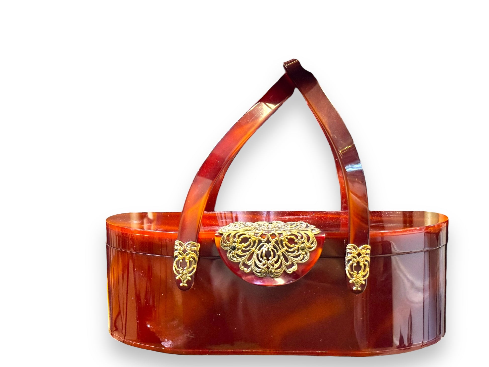This vintage handbag is dripping with coolness and fun, perfect for adding a touch of quirky style to any outfit. The chic lucite material from the 1950s/1960s makes it a unique and stylish addition to your wardrobe. (Add a pop of retro flair to any look!)