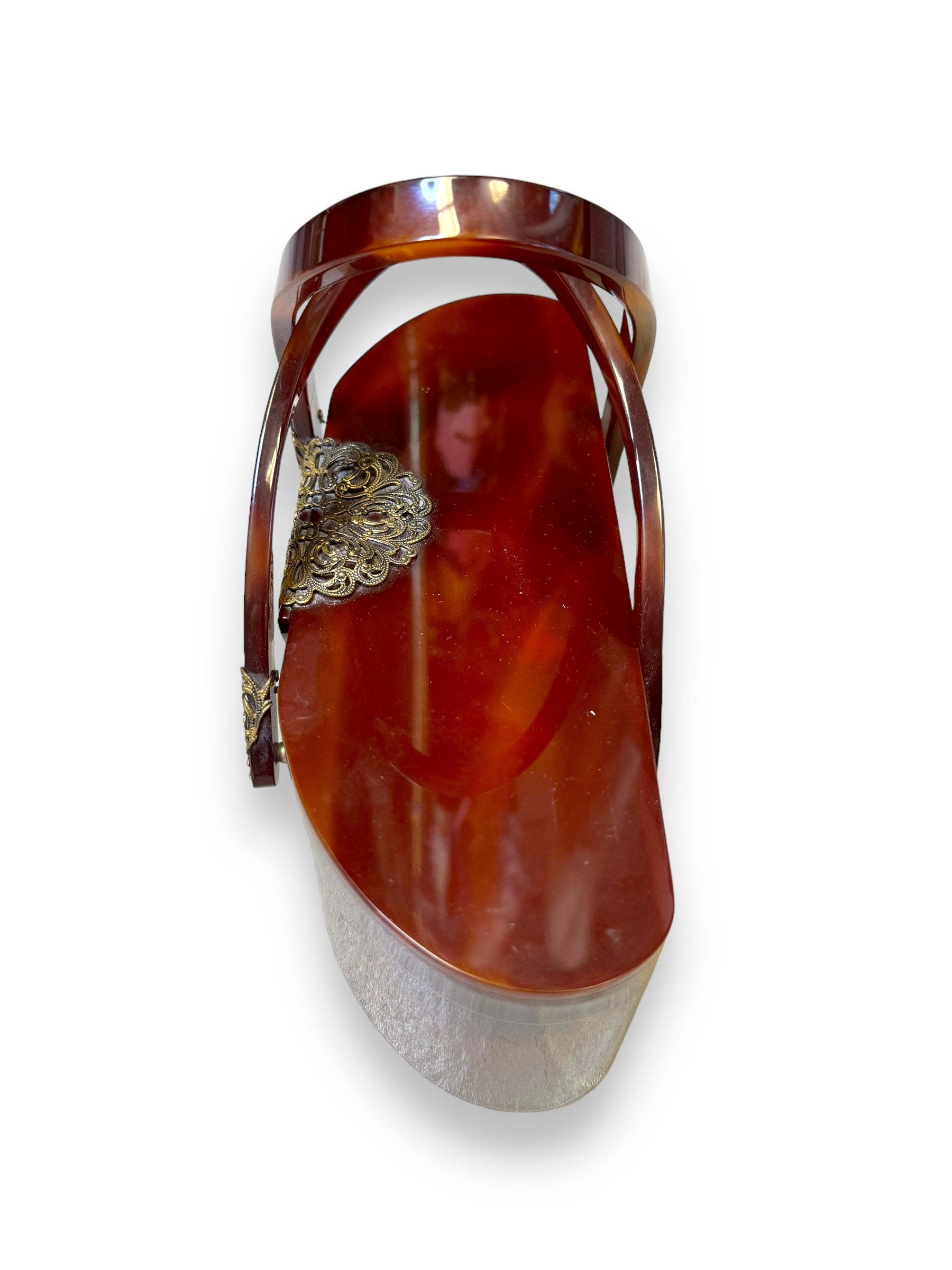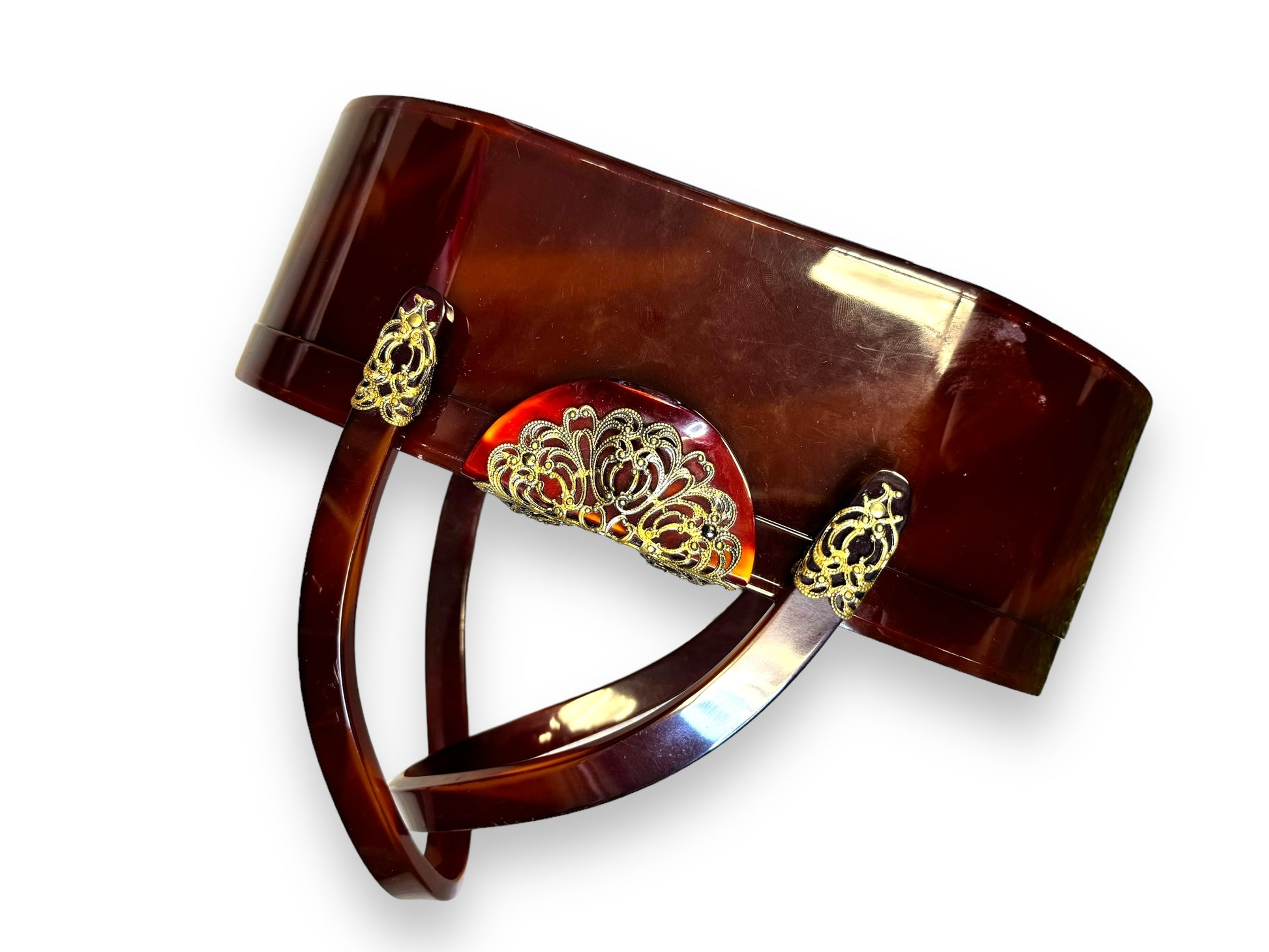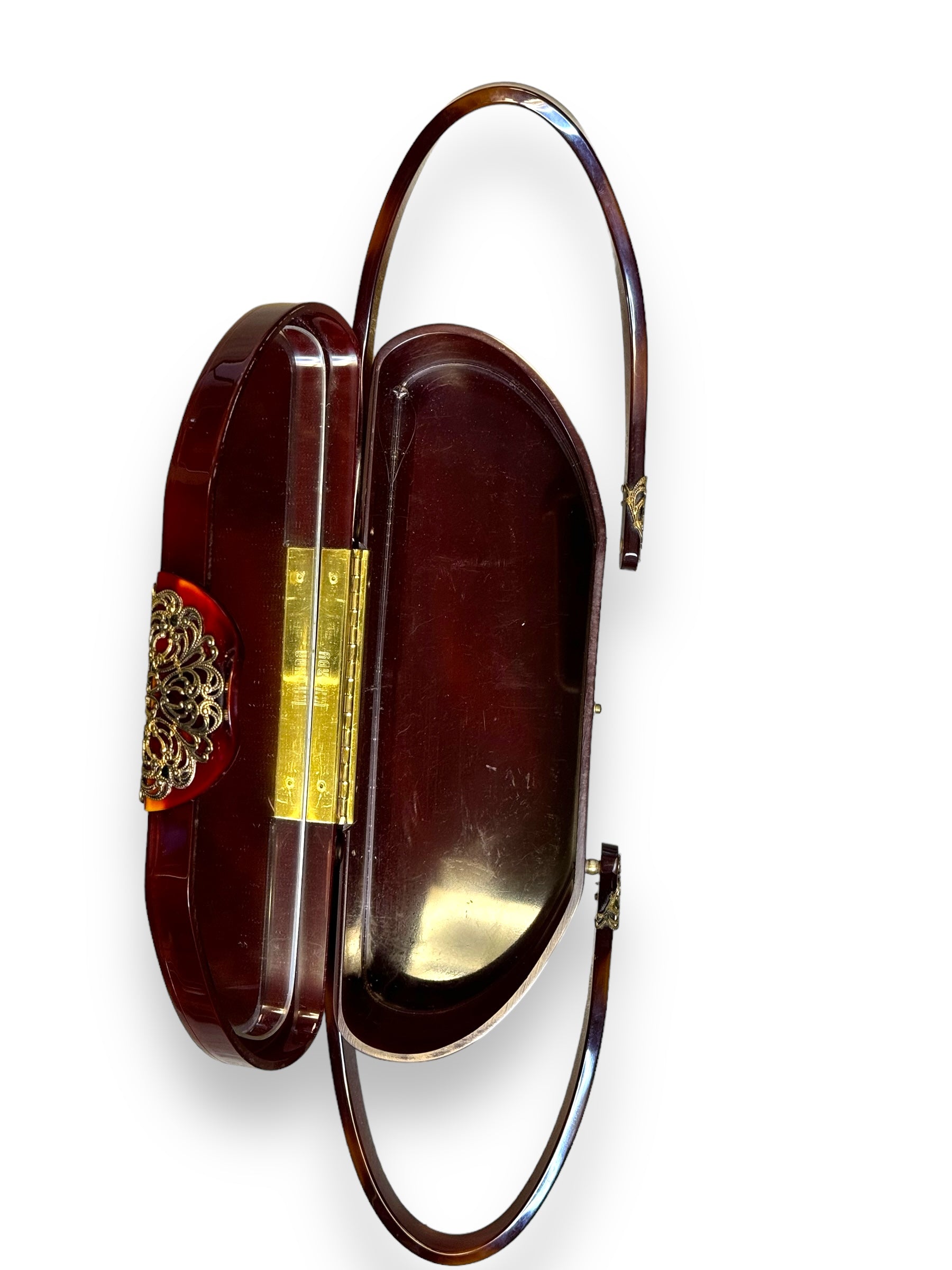 This vintage handbag is dripping with coolness and fun, perfect for adding a touch of quirky style to any outfit. The chic lucite material from the 1950s/1960s makes it a unique and stylish addition to your wardrobe. (Add a pop of retro flair to any look!)