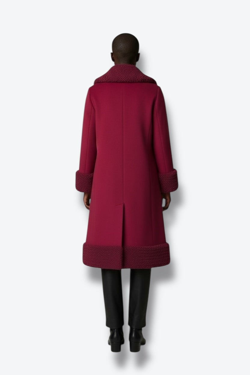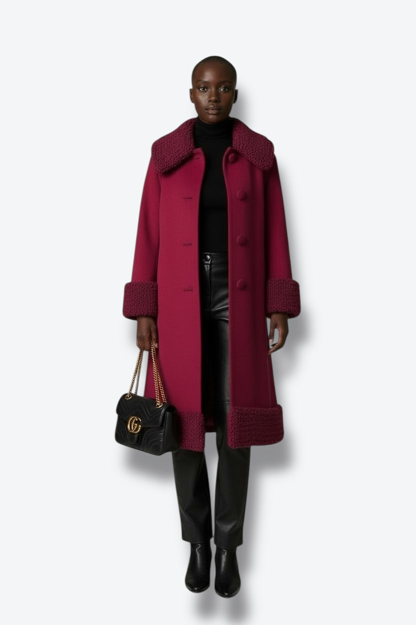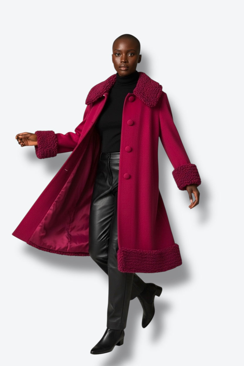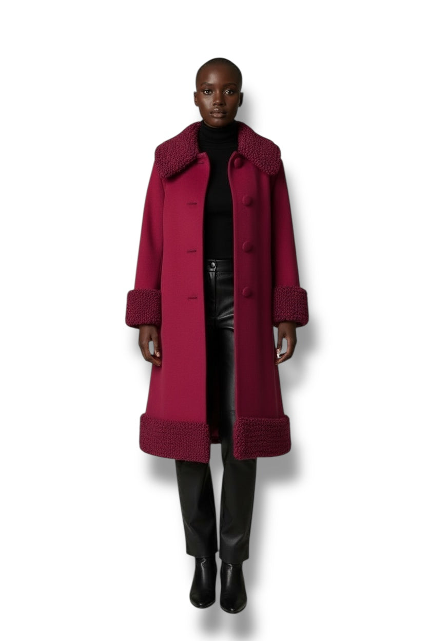 Step into vintage glamour with this 1950s hot pink wool sweater jacket, a true statement piece from fashion’s most feminine era. Designed in a rich magenta-pink wool, this coat features plush textured trim at the collar, cuffs, and hem — giving it that iconic couture-inspired finish. Oversized fabric-covered buttons run down the front, while the structured silhouette creates a dramatic yet elegant line through the body.