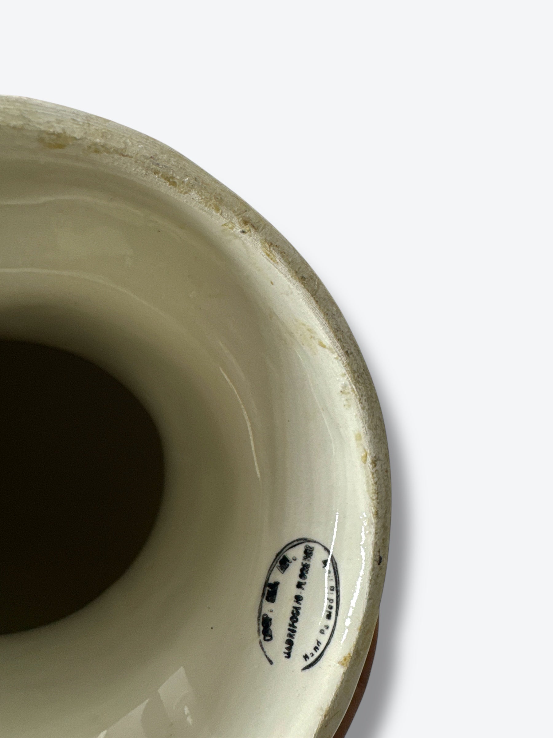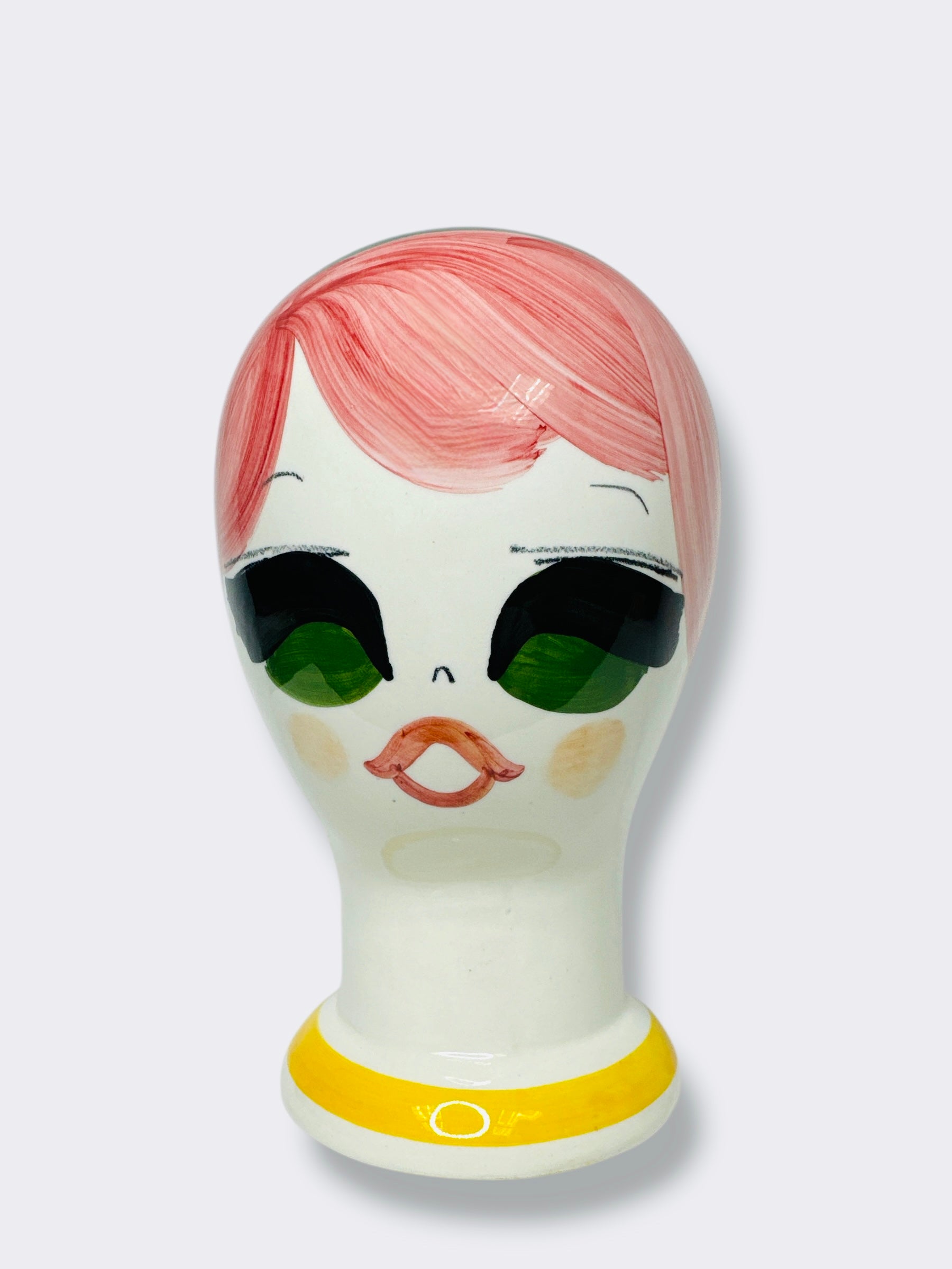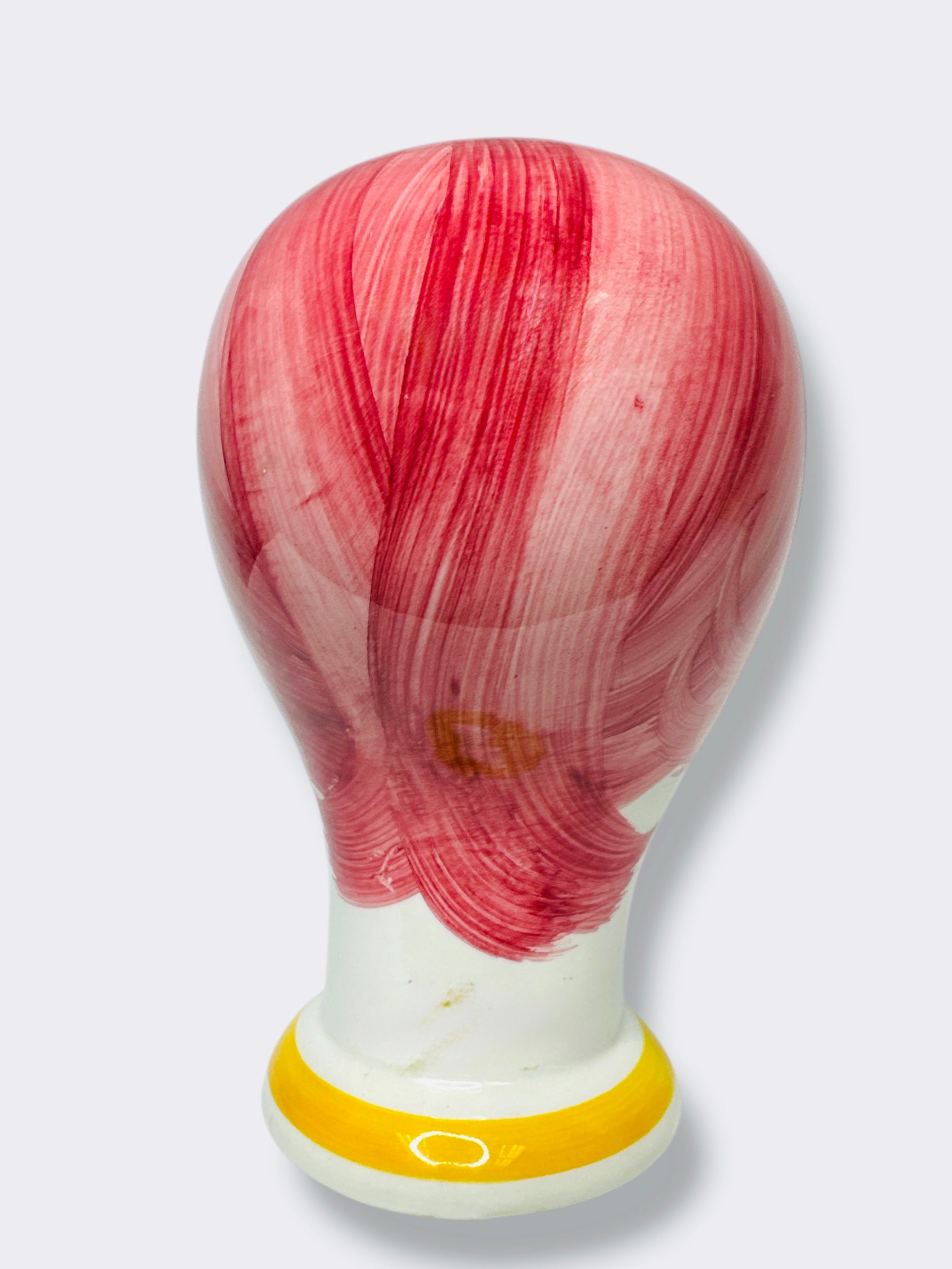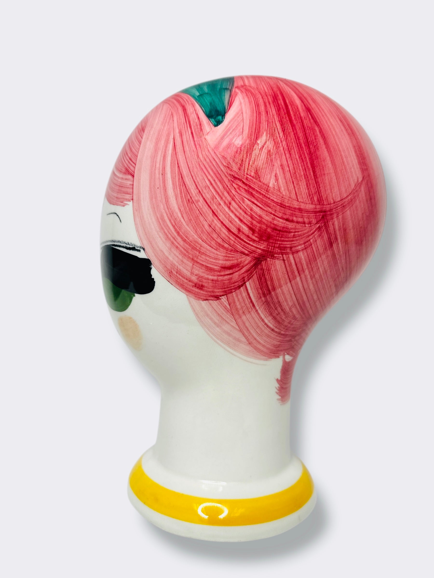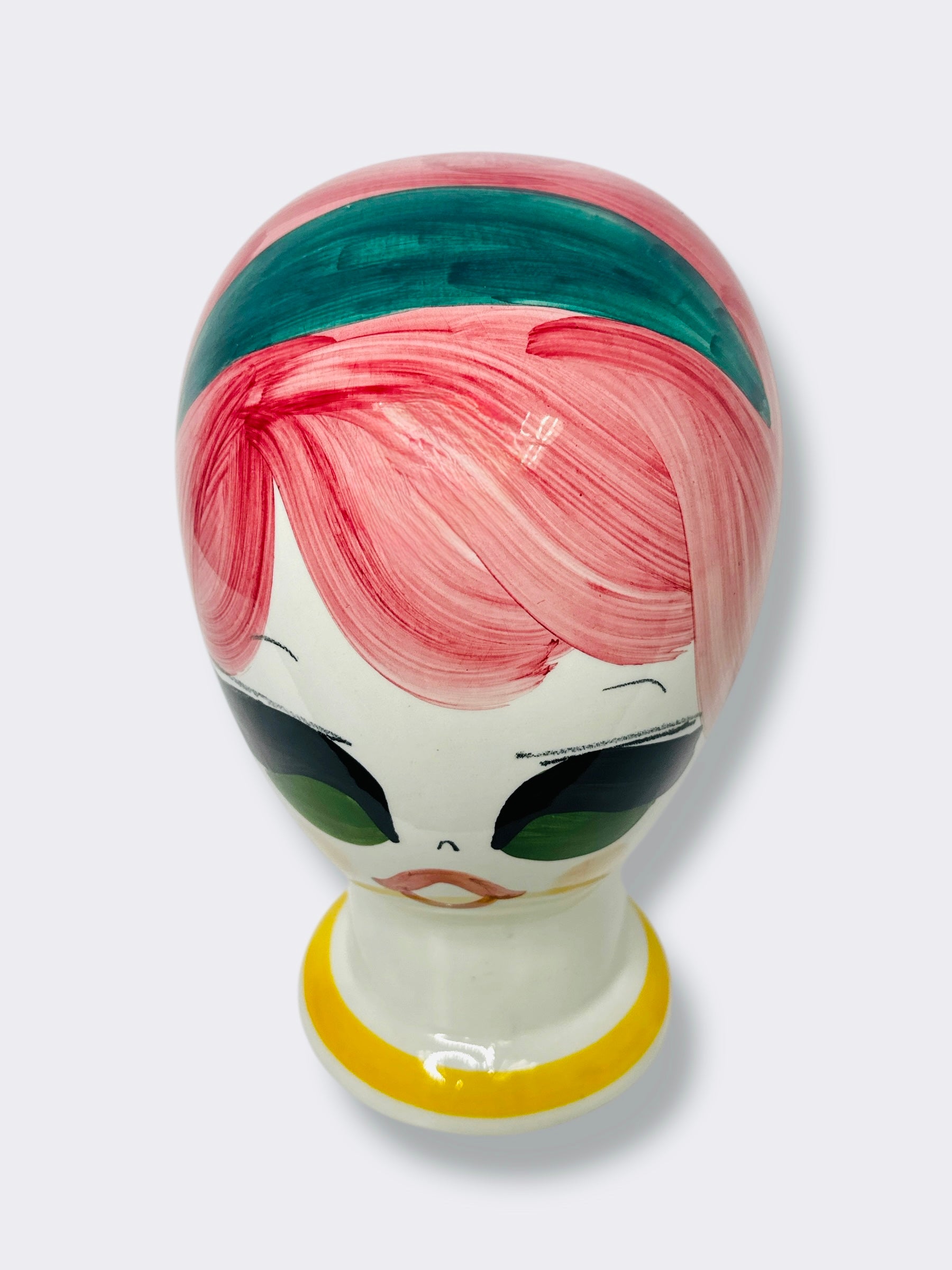 Add a touch of playful charm to your collection with this rare 1960s/70s Rometti Italian Blond Woman Collectable Head. Hand-painted with vivid orange hair, bold green cat-eye eyes, and pouty pink lips, this ceramic vase is both functional and stylish. Its whimsical floral motif and excellent vintage condition make it a perfect statement piece for any vanity or shelf.