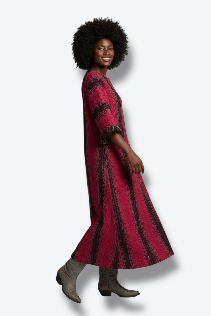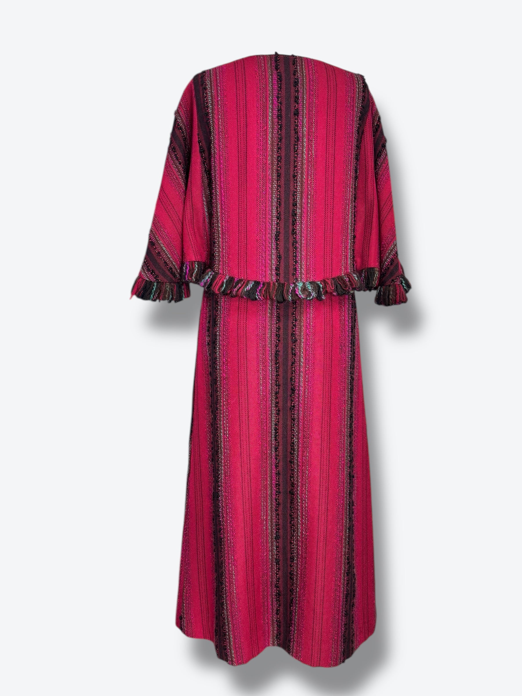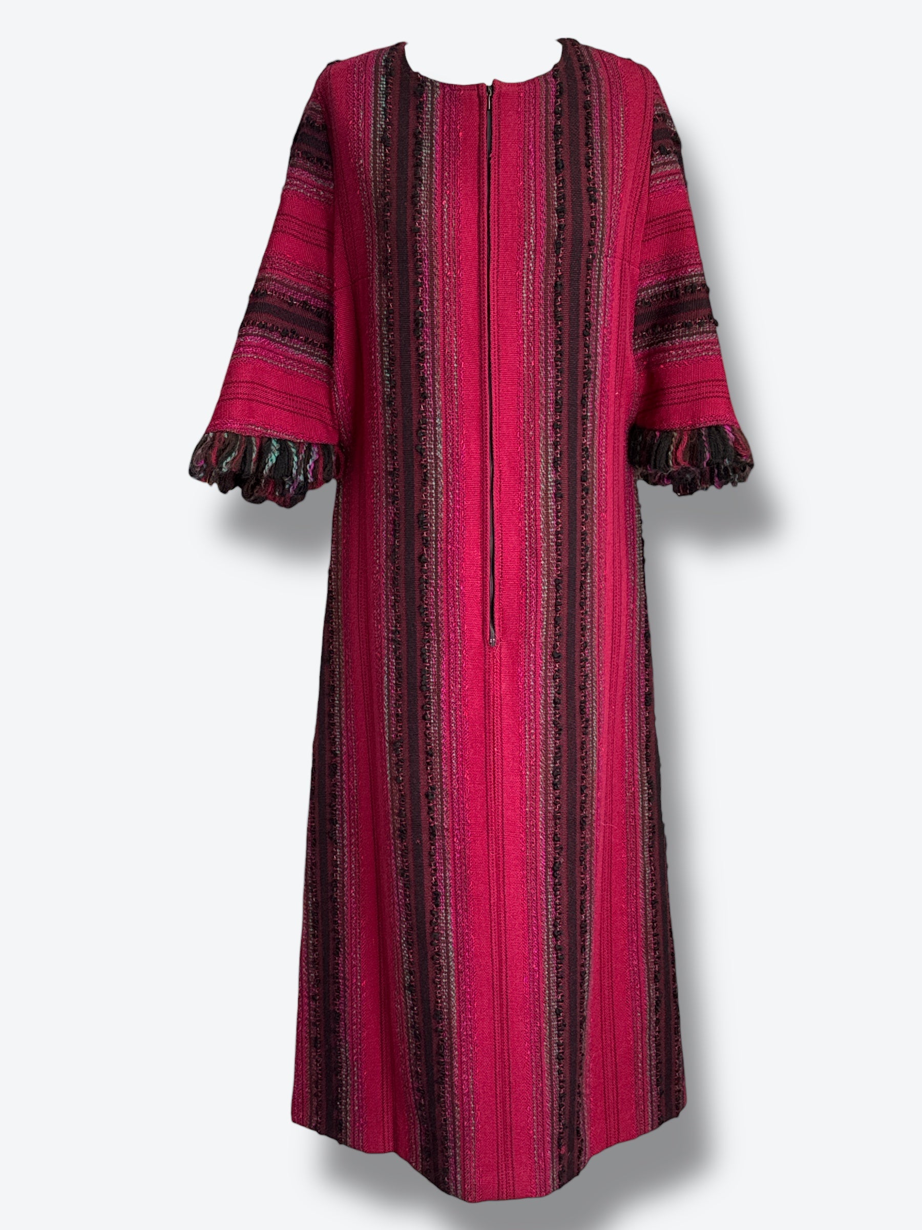A rare vintage statement dress by Arolan Kutomo, crafted in Finland and woven with rich, dimensional vertical striping in saturated raspberry, burgundy, and earthy tones. This beautifully structured maxi silhouette features dramatic bell sleeves with textured trim and a clean, architectural neckline. The handwoven quality and artisanal texture make this a true collector’s piece — elevated, soulful, and deeply special.