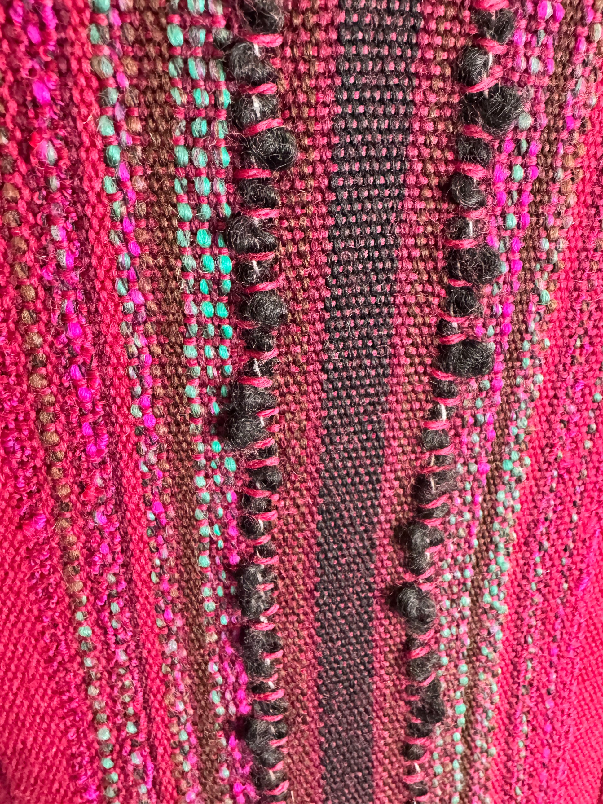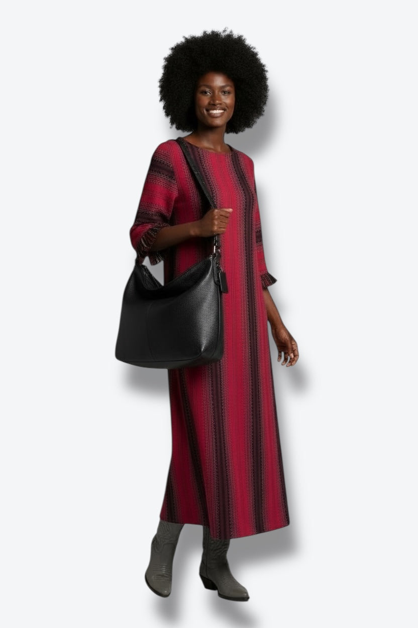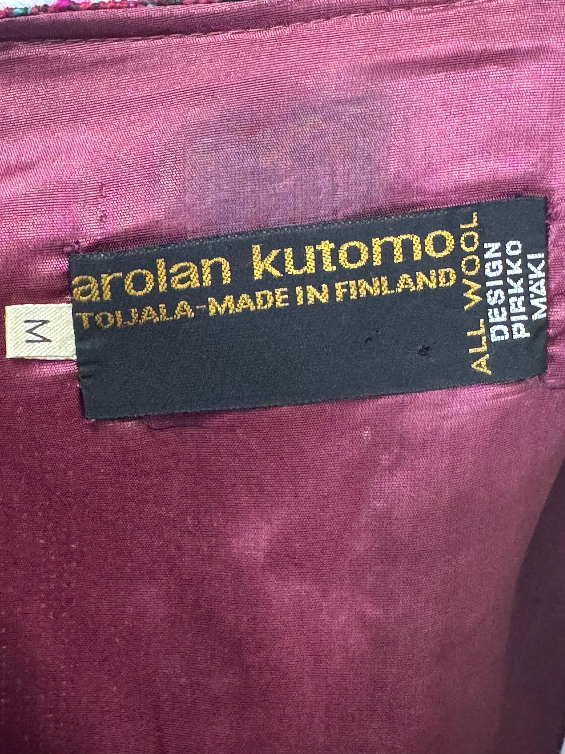 A rare vintage statement dress by Arolan Kutomo, crafted in Finland and woven with rich, dimensional vertical striping in saturated raspberry, burgundy, and earthy tones. This beautifully structured maxi silhouette features dramatic bell sleeves with textured trim and a clean, architectural neckline. The handwoven quality and artisanal texture make this a true collector’s piece — elevated, soulful, and deeply special.