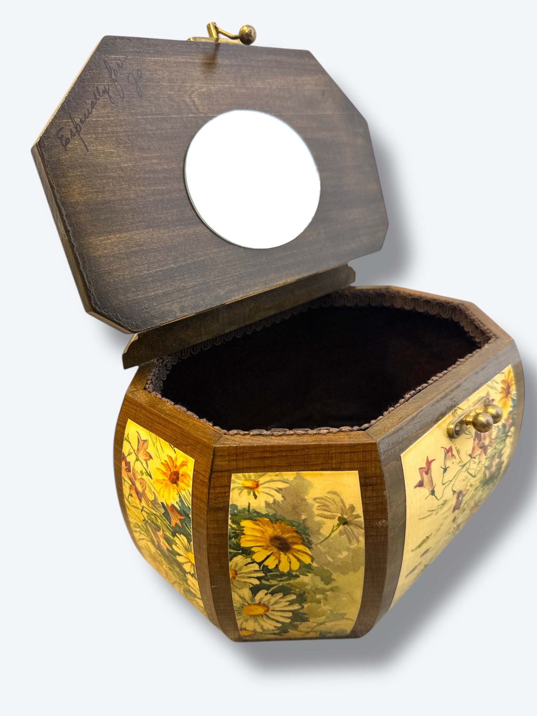 Unleash your vintage vibe with this stunning 1960s decoupage wooden purse. Perfect for carrying your cellphone and adding a pop of playful yellow floral to any outfit.