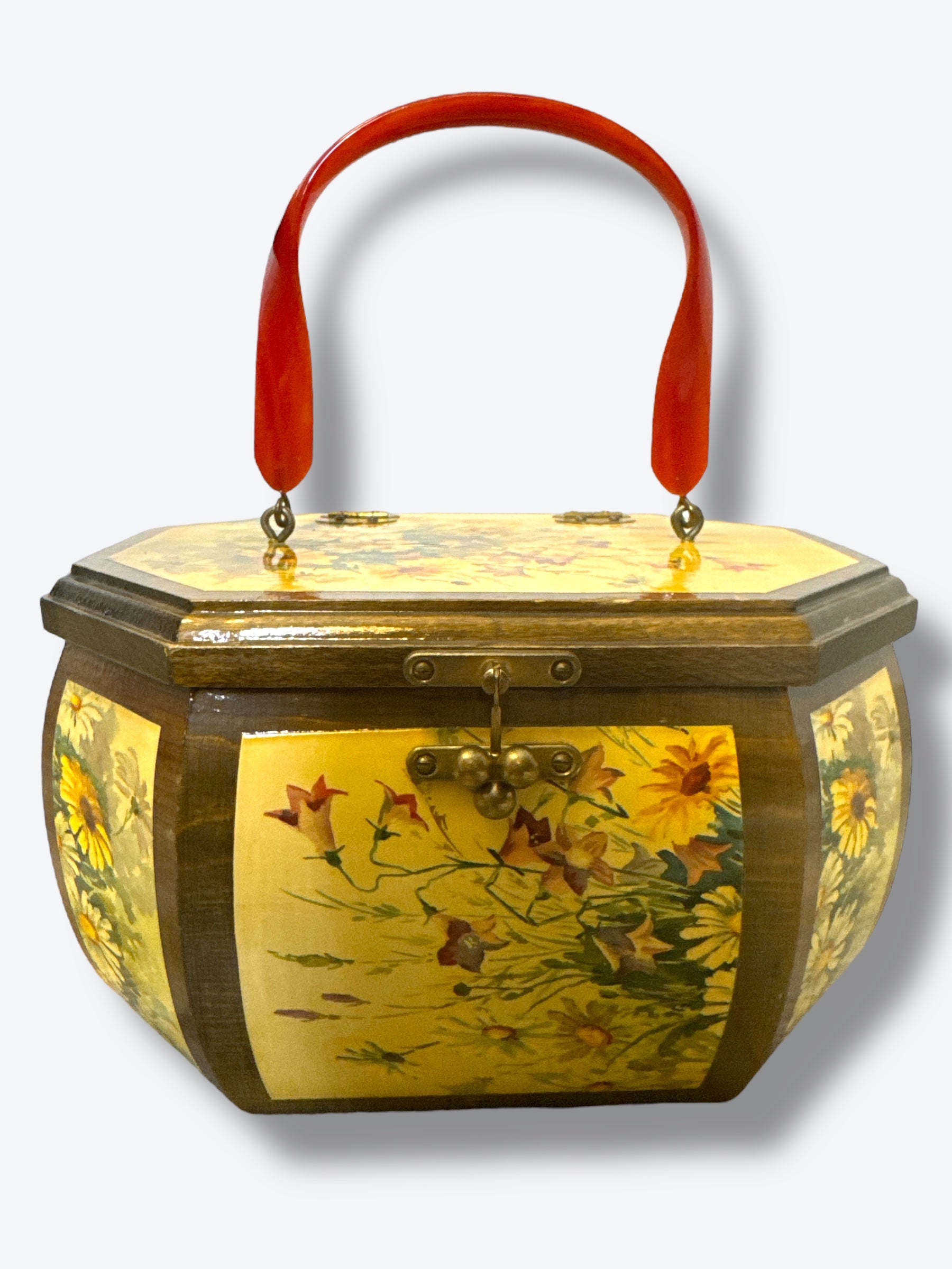 1960s Decoupage Floral Wooden Purse + Bakelite Handle