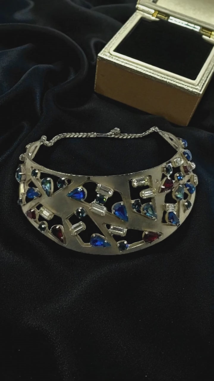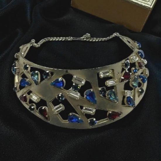 This striking designer collar is a true statement piece, blending bold geometry with dazzling color play. Crafted in a wide openwork design, the collar features angular cut-outs set with an array of richly hued rhinestones. Deep sapphire blue, ruby red, and iridescent stones in teardrop and round cuts are interspersed with baguette-cut clear crystals, creating a dynamic, modernist mosaic effect. The substantial silver-tone frame sits gracefully around the neck, secured by a twisted rope chain clasp for both comfort and edge. This piece embodies mid-century modernist influence with a couture-level execution, making it ideal for collectors and style risk-takers alike.