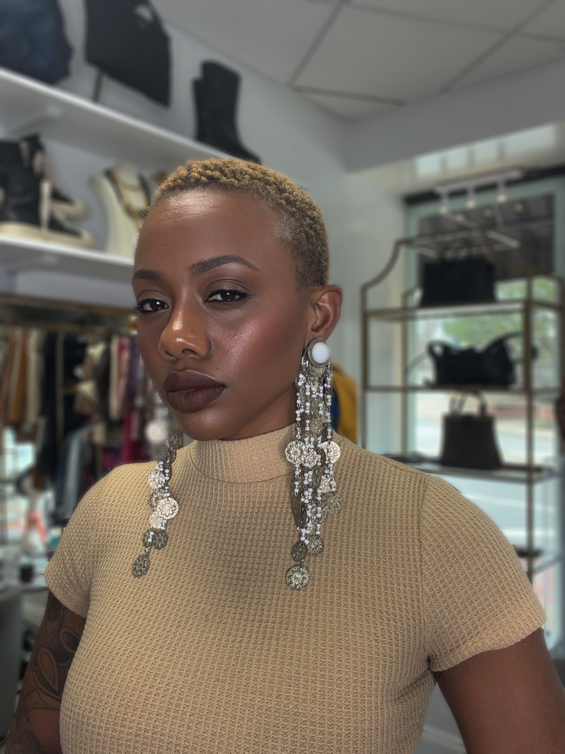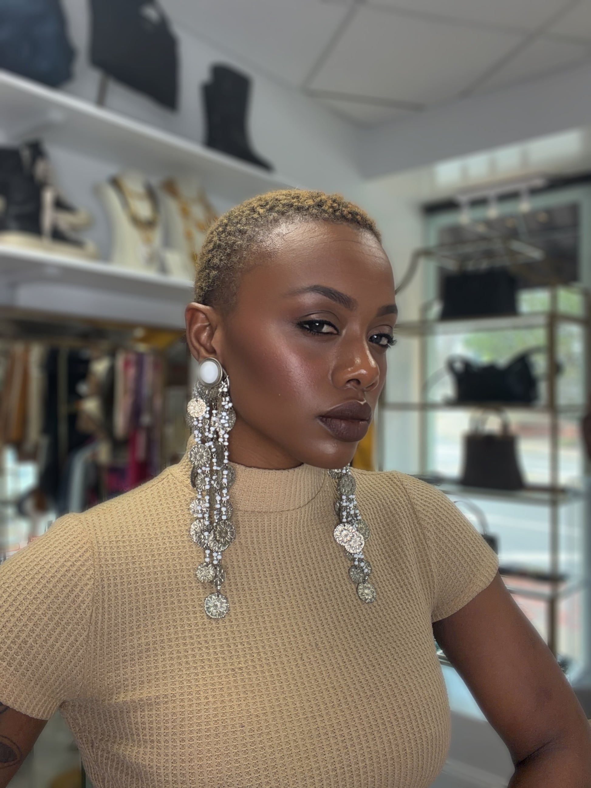 Embodying the spirit of a bygone era, these 1970s/80s Unsigned Hippie Earrings manifest an exquisite juxtaposition of silver coin intricacies and luminescent white beads. The clip-on design offers a seamless elegance, allowing the wearer to embrace an aesthetic steeped in bohemian charm and nostalgic allure, perfect for those who seek to adorn themselves with a piece of artistry.