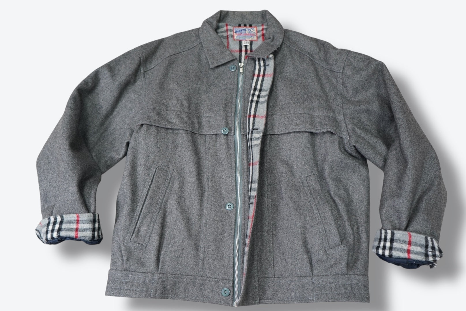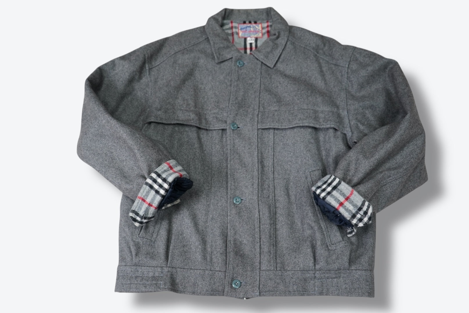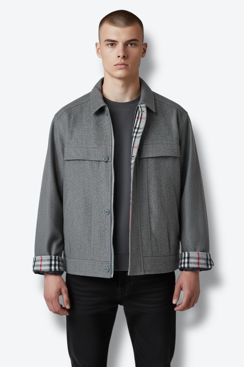 A timeless vintage gray wool jacket with a structured, utilitarian silhouette. Designed with a classic button-front closure, chest seam detailing, and functional side pockets, this piece is elevated by a hidden plaid flannel lining at the cuffs—perfect for styling with a casual roll. Warm yet breathable, it blends rugged workwear energy with refined tailoring, making it an effortless layering essential for cooler seasons.