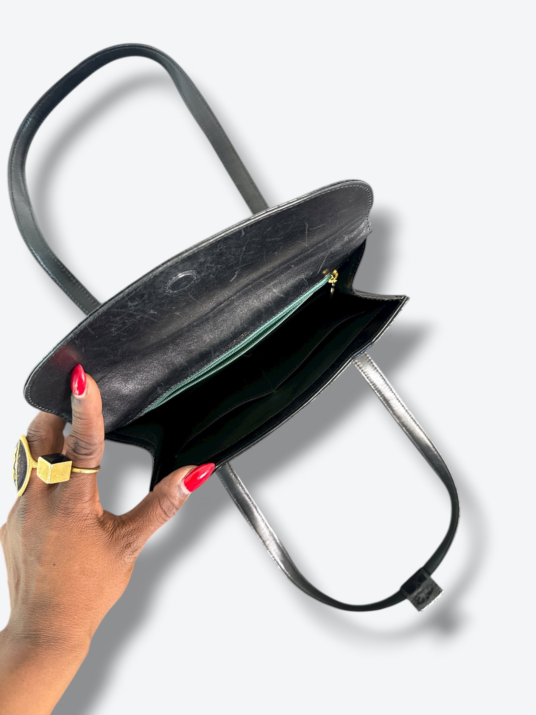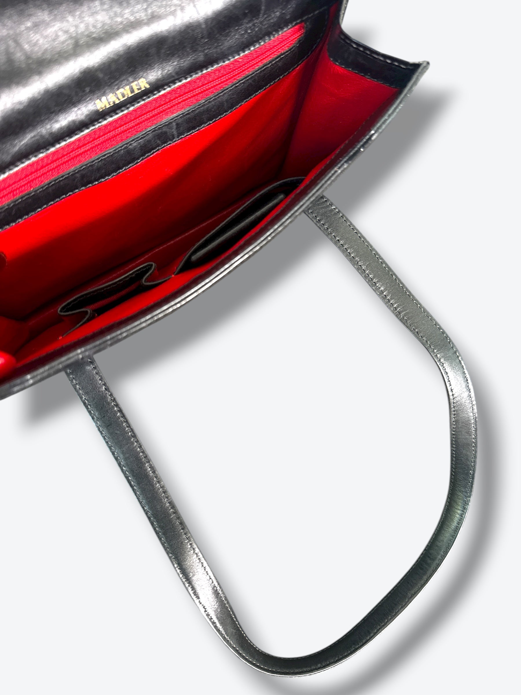 Exude timeless elegance with this rare vintage Madler handbag, crafted in glossy black crocodile-embossed leather. Its structured box silhouette and refined flap closure embody mid-century sophistication, while the double top handles add both style and practicality. The interior reveals a striking pop of color with smooth leather lining (in red or green, depending on the model) and gold-embossed branding, along with organized compartments and a secure zip pocket. A true statement of understated luxury, this bag transitions seamlessly from day polish to evening refinement.