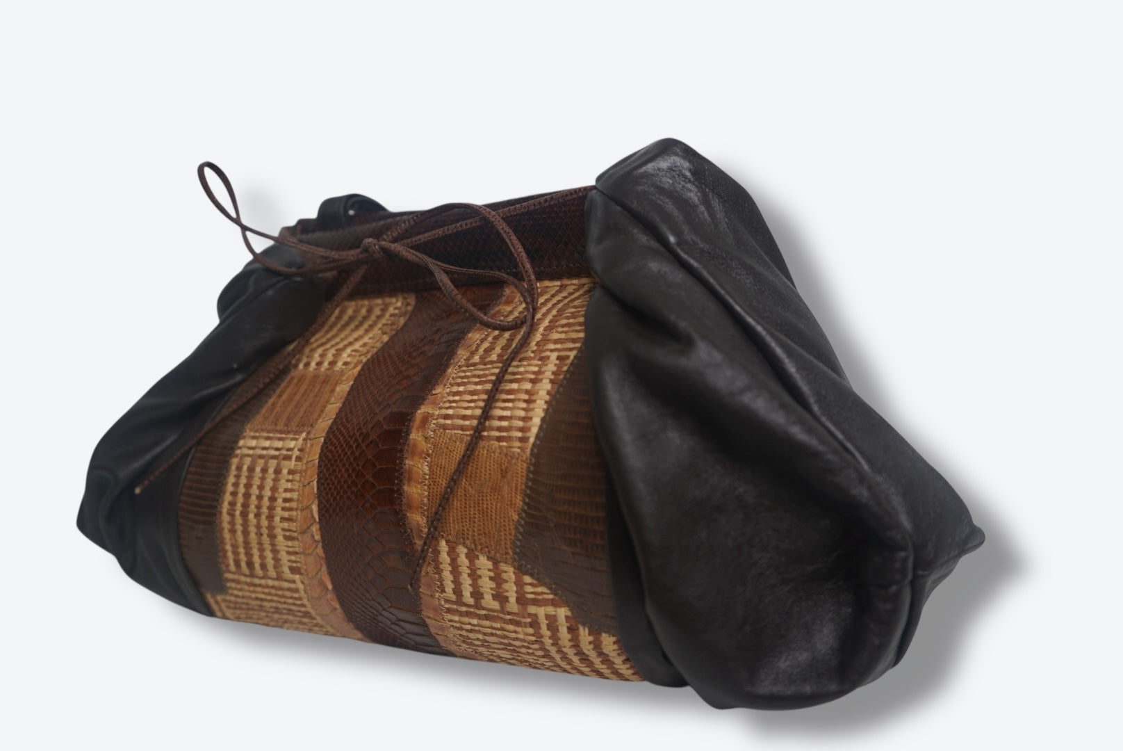 Elevate your style with our 1970s Snakeskin and Leather Shoulder Bag. The chic drawstring design features a cool snakeskin and leather combination, perfect for pre-fall and spring fashion. Take your look to the next level with this exclusive and sophisticated accessory.