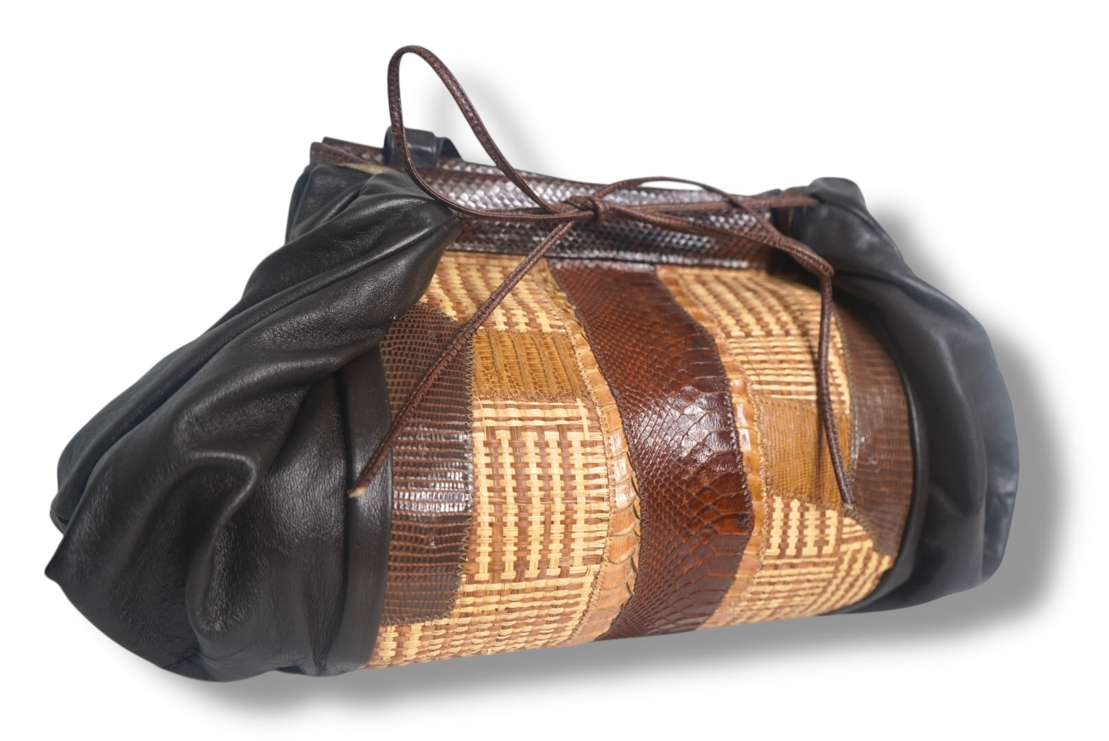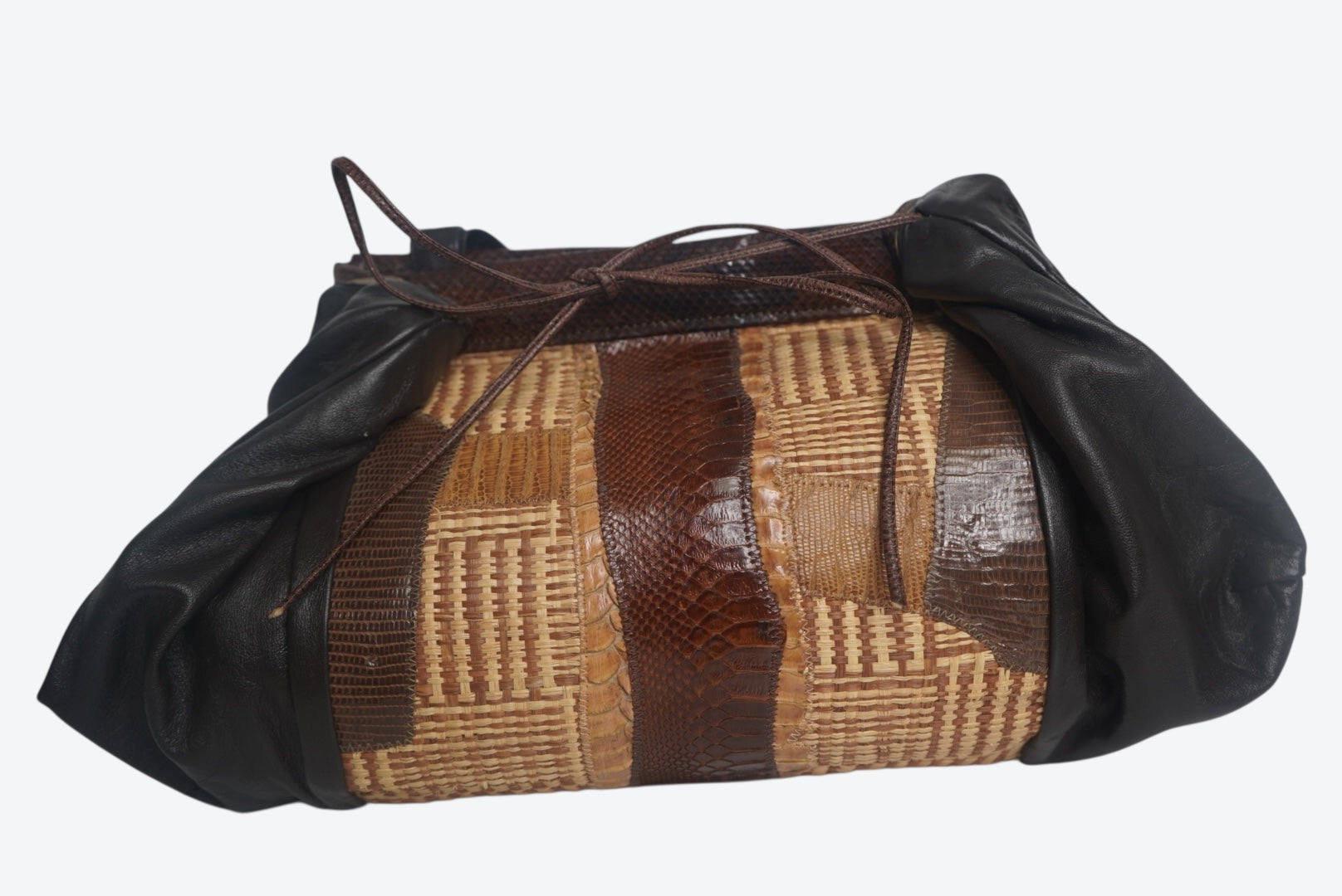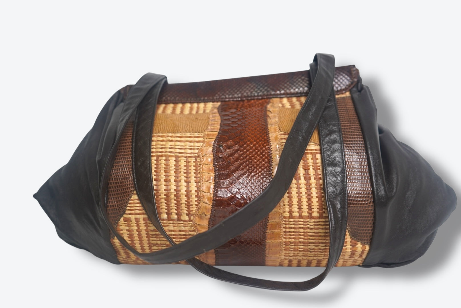 1970s Snakeskin /Raffia Mixed Media Leather Shoulder Bag