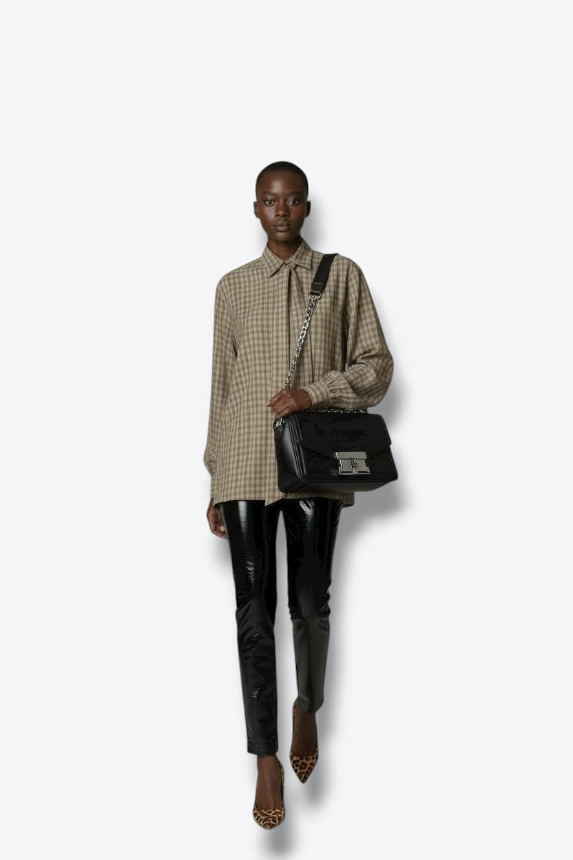 A timeless camel-and-black check blouse by Weathervane featuring a relaxed silhouette, pointed collar, and soft drape in lightweight polyester. The label “Made in British Crown Colony of Hong Kong” marks its vintage authenticity and craftsmanship. The fabric has a subtle crepe texture, adding movement and structure that makes it ideal for layering or tucking into high-waisted pieces.