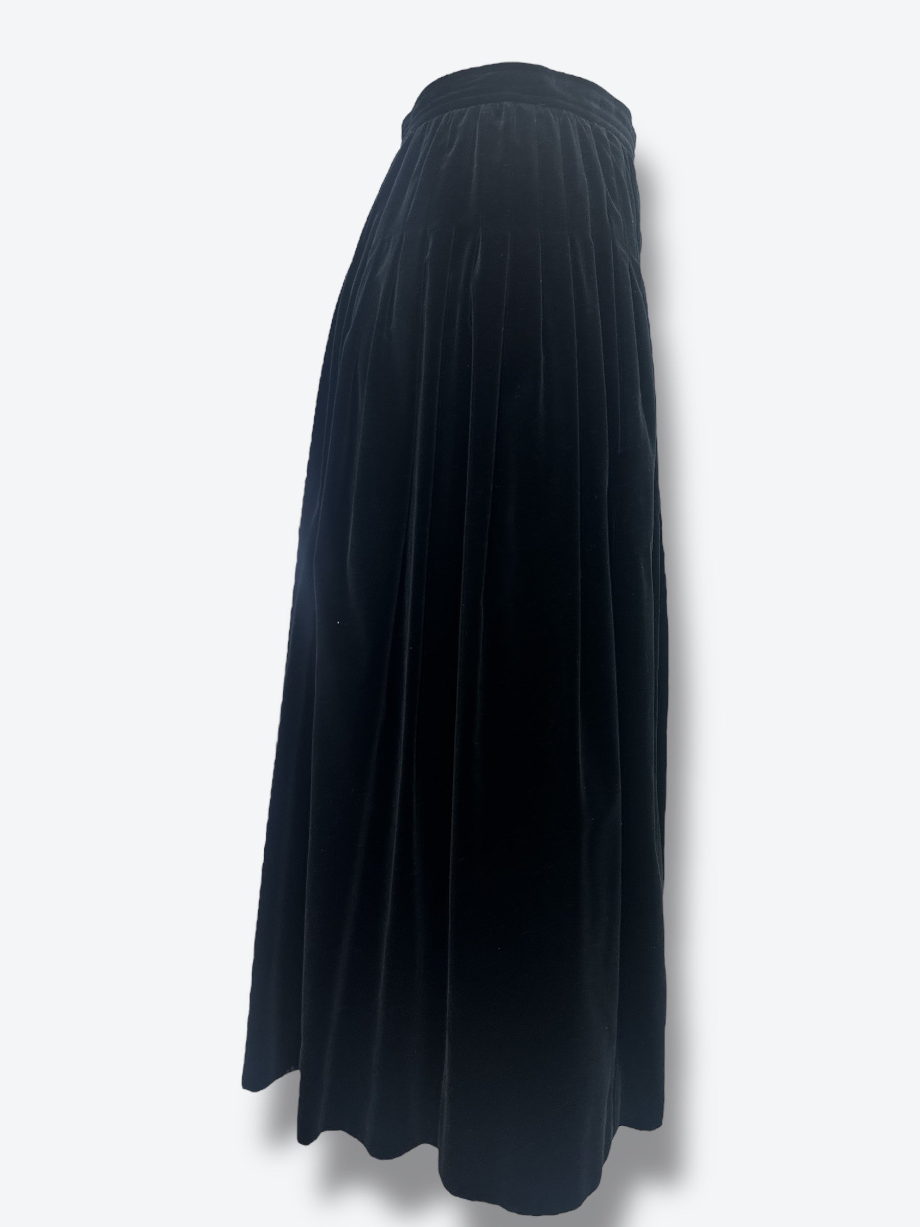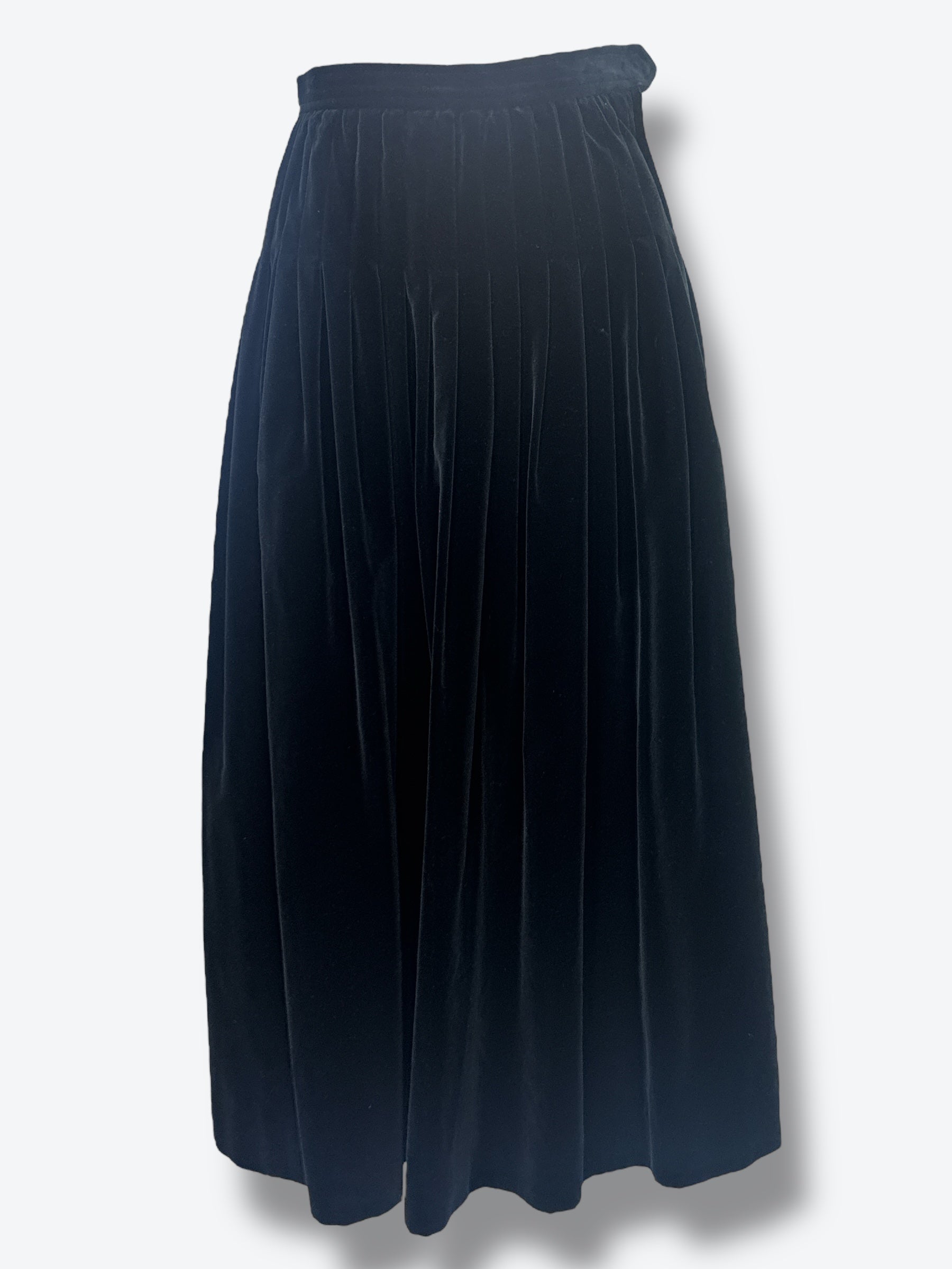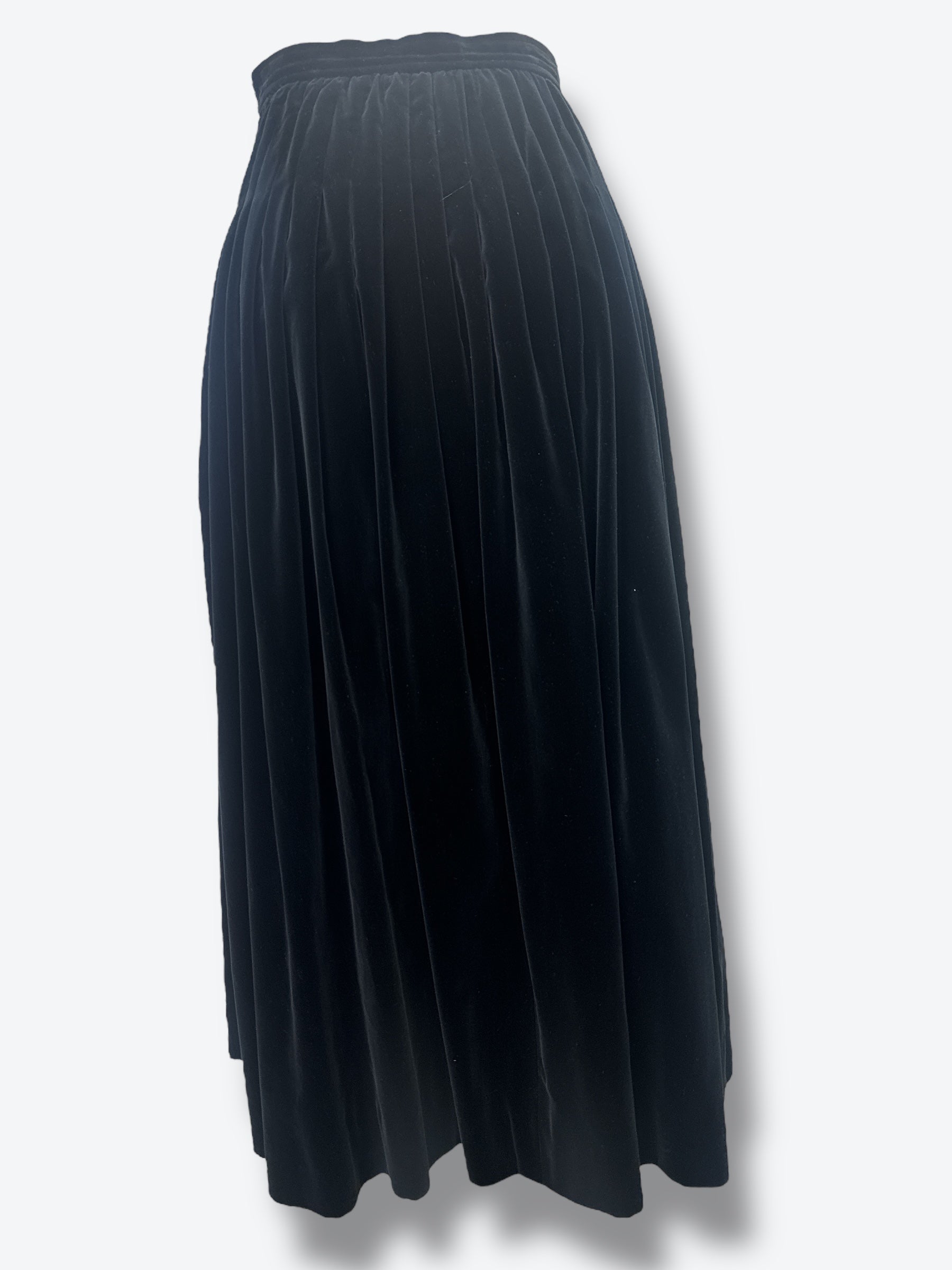 Elevate your wardrobe with this timeless black velvet pleated skirt. Designed with an A-line silhouette, this piece offers effortless elegance and graceful movement. The plush velvet fabric catches the light with a subtle sheen, while the finely pressed pleats add texture and flow. Sitting high on the waist, it creates a flattering shape that pairs beautifully with everything from a crisp blouse to a cozy knit. Perfect for both day-to-night styling and special occasions, this skirt is a versatile staple for any season.