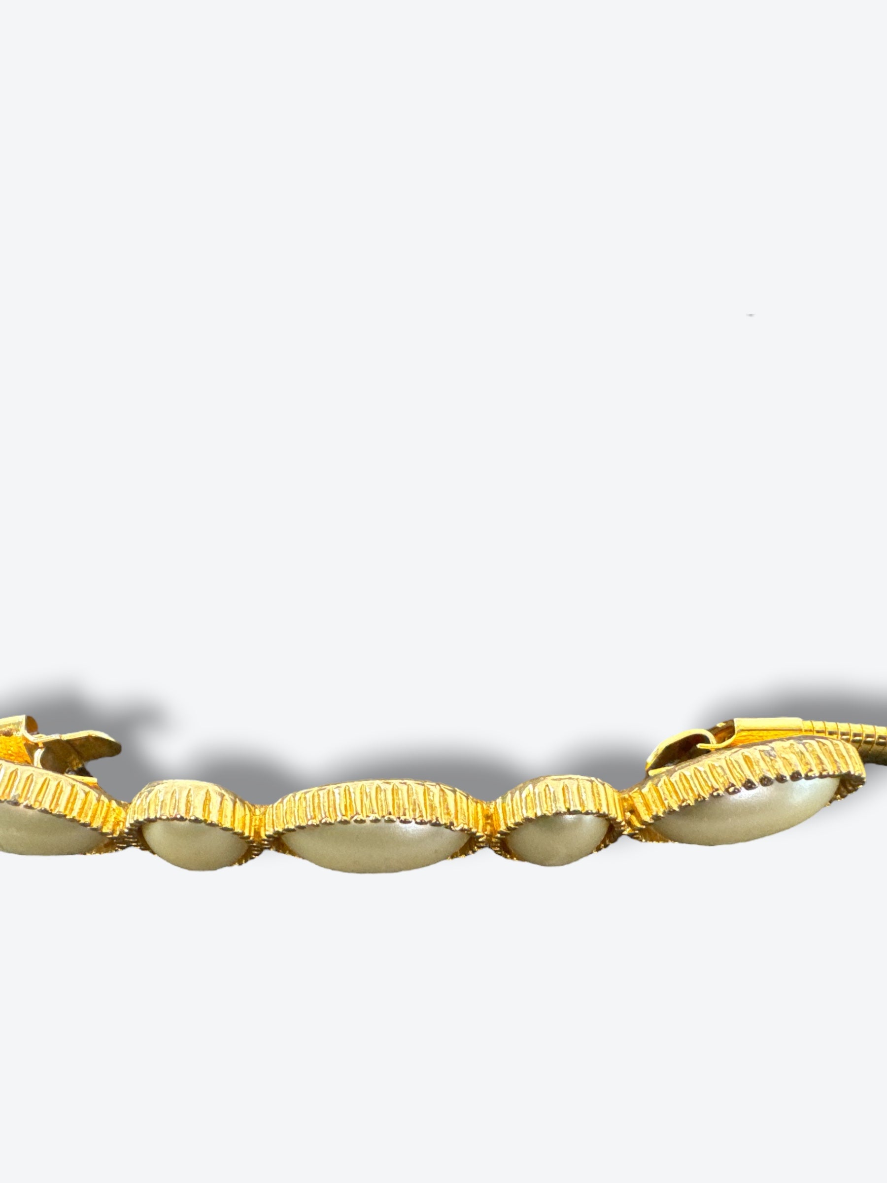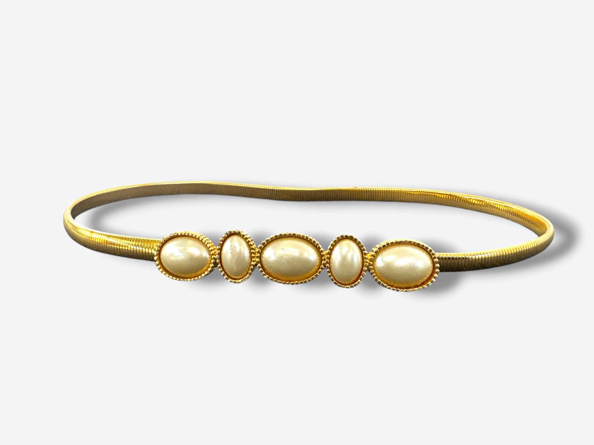 Step into timeless glamour with this vintage Accessocraft NYC statement belt, crafted in the 1970s–1980s. Designed with a flexible gold-tone snake chain, the centerpiece features five luminous faux pearl cabochons set in ornate textured bezels. Known for their bold and theatrical costume jewelry, Accessocraft pieces are highly collectible and were often featured in film and high-fashion styling.