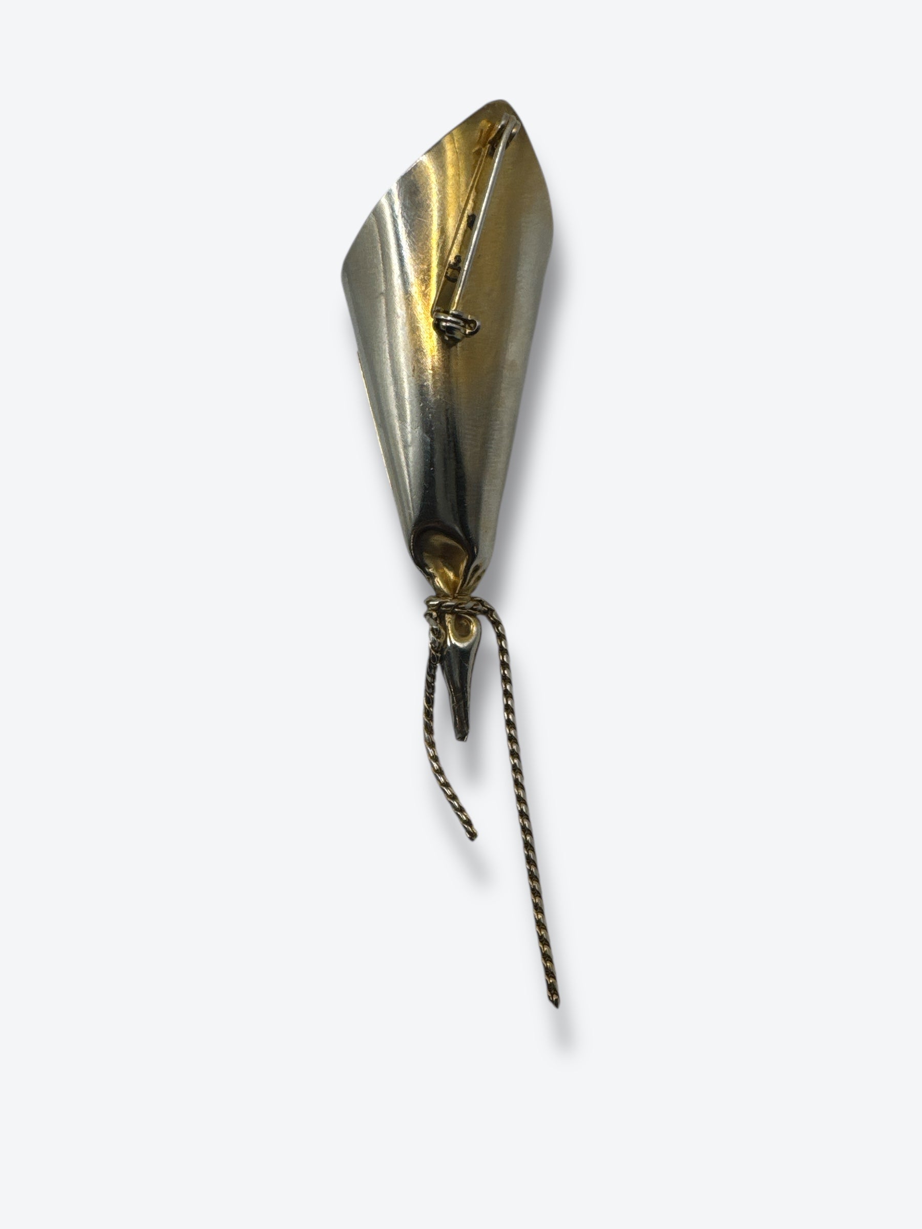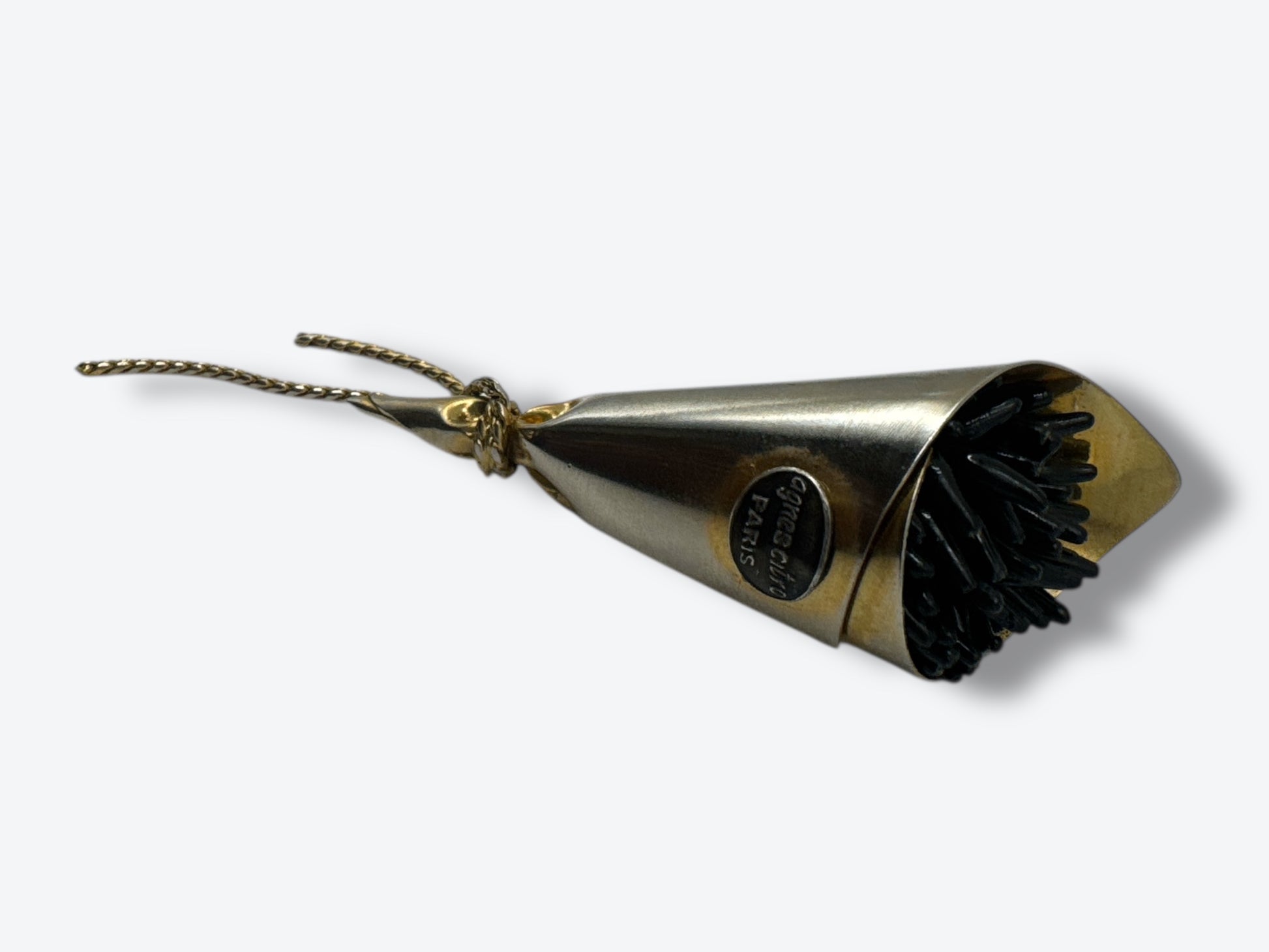 This Agnès Chiro Paris brooch from the 1980s embodies sculptural elegance and French sophistication. Designed in the shape of a wrapped bouquet, the piece is crafted from brushed gold-tone metal with intricate black resin stems that peek from the top — a poetic nod to Parisian artistry. The tied cord detail adds movement and realism, while the brand’s signature plaque confirms its heritage craftsmanship. This brooch captures the era’s refined minimalism with a couture twist.