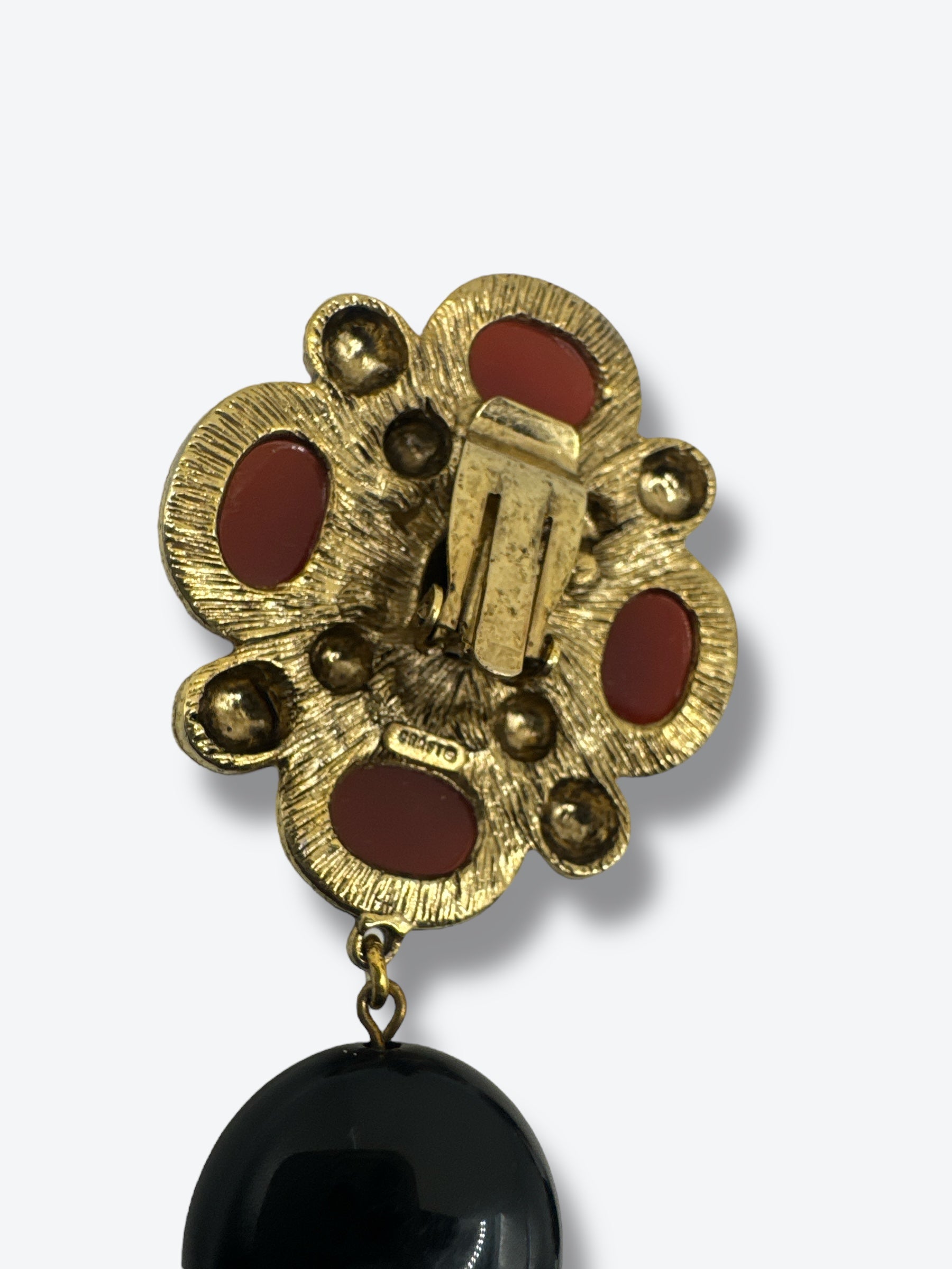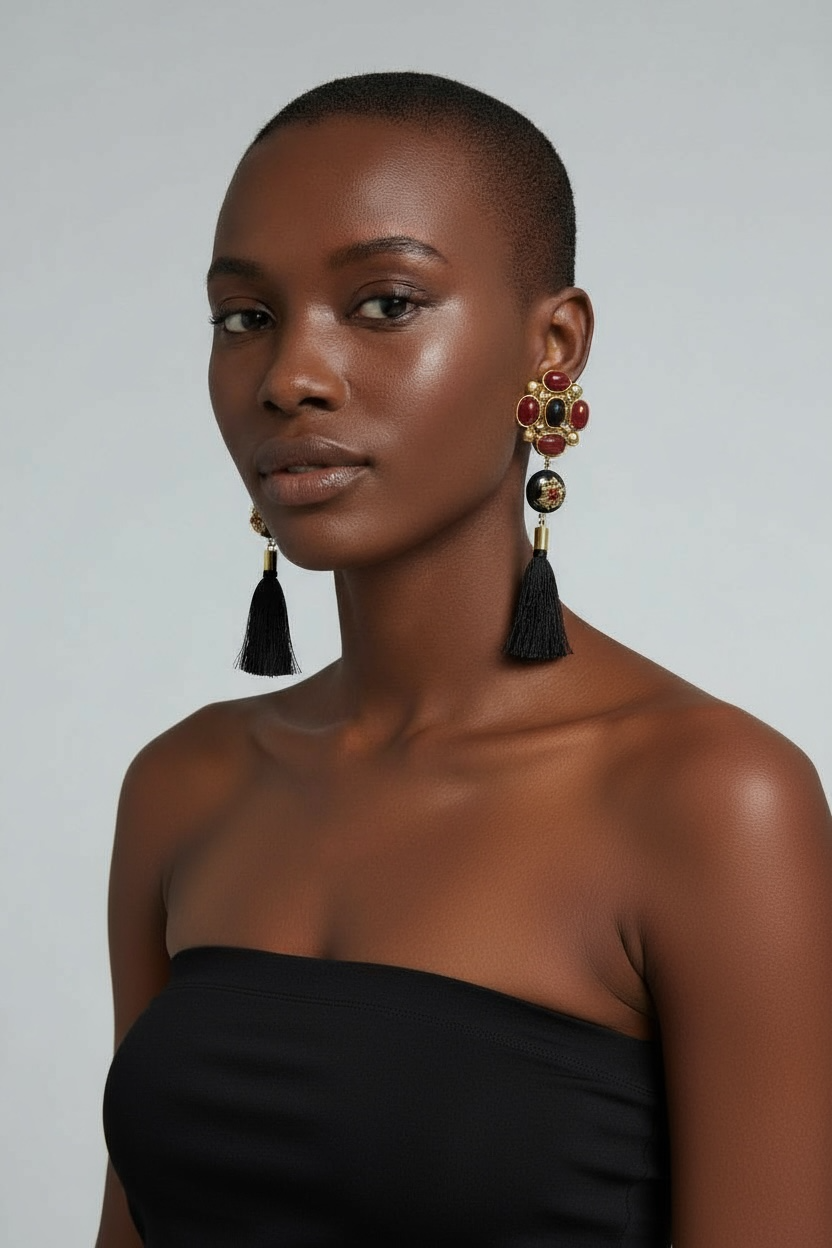 Bold, dramatic, and full of character — these 1980s artisan-crafted earrings are a stunning display of handcrafted detail. Featuring deep red and black cabochons set in gilded gold-tone metal, each earring cascades into an ornate baroque-style medallion finished with black silk tassels. The mix of textures — from polished stones to soft fringe — captures the essence of vintage glamour with a modern artistic flair. Lightweight and designed to make an impact, these earrings are wearable works of art that embody the spirit of creative self-expression.