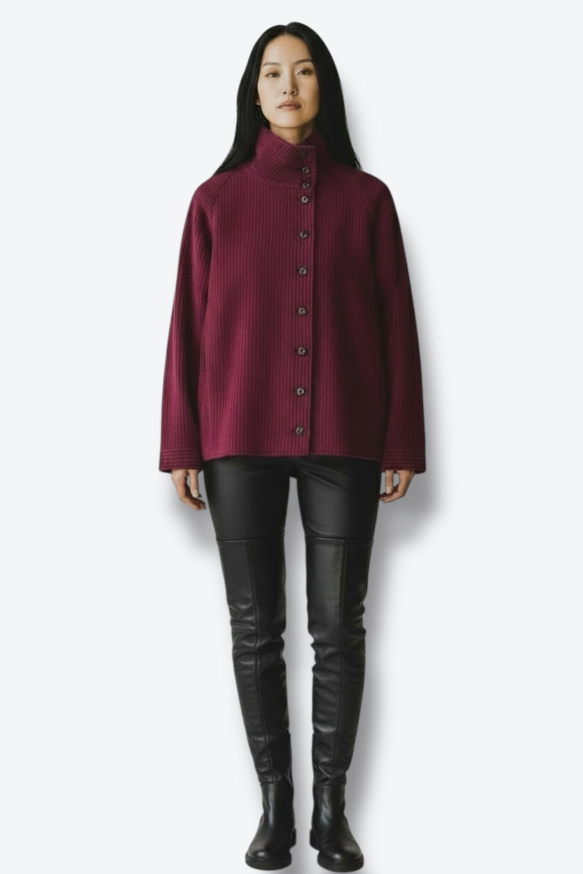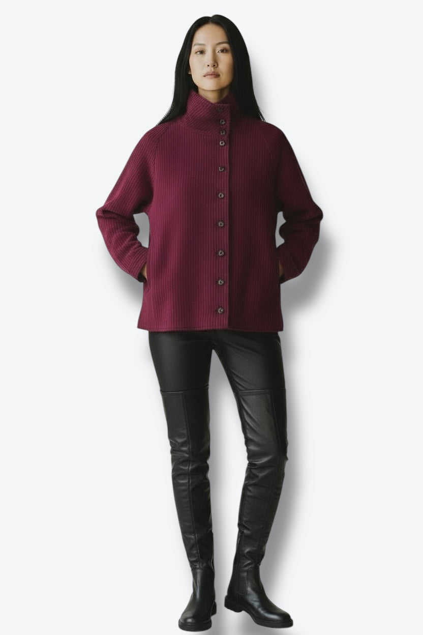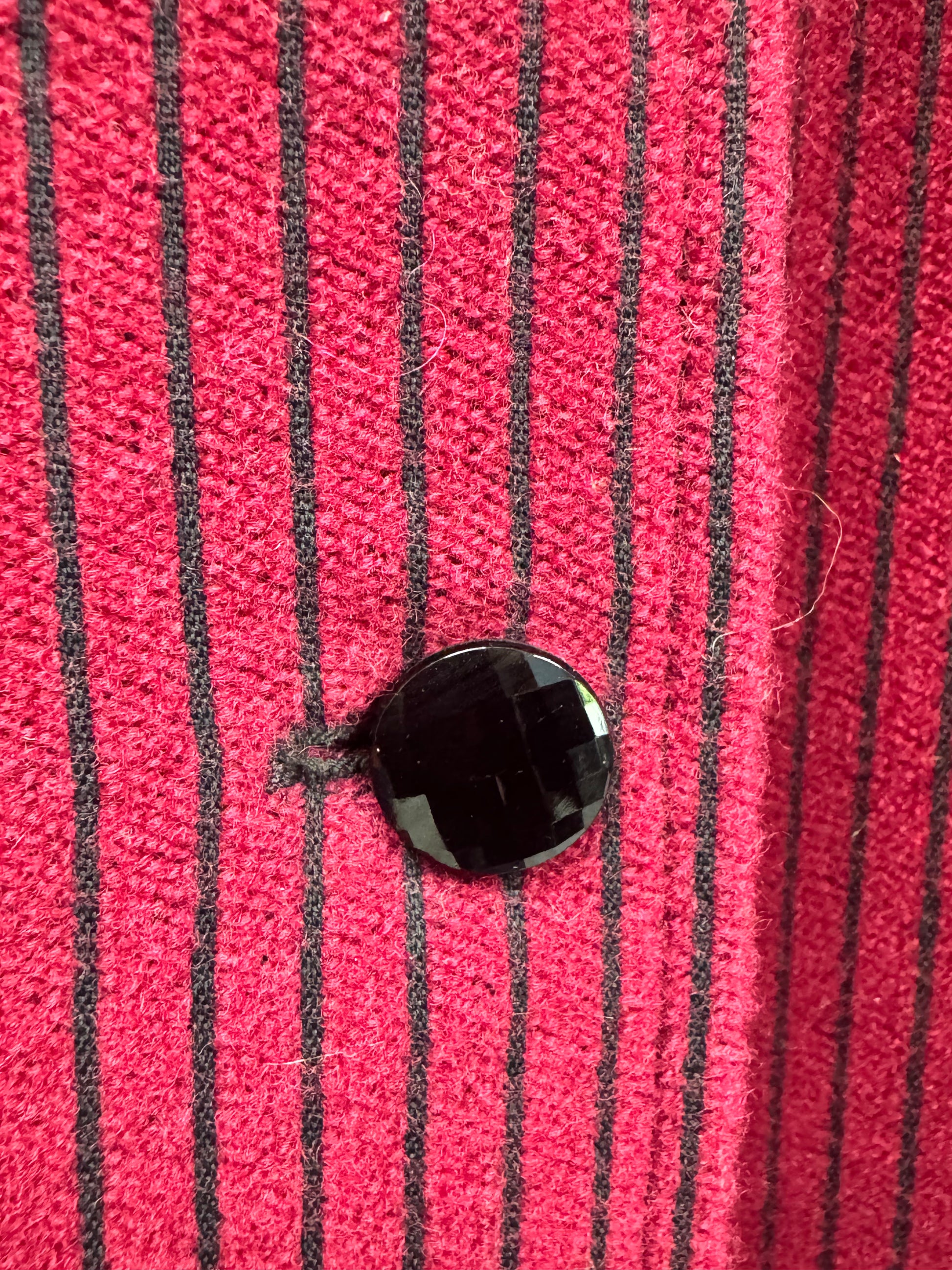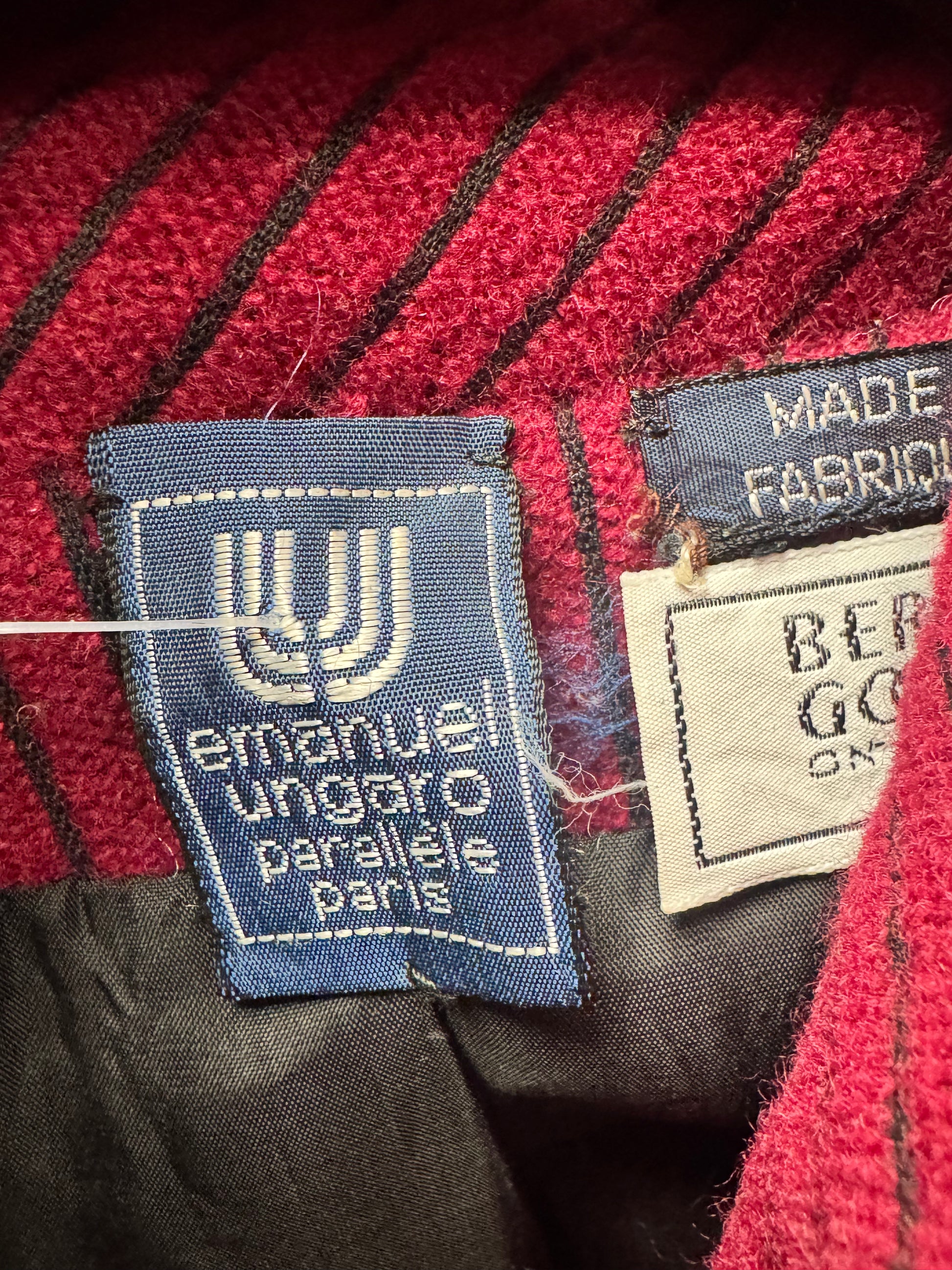 This vintage Emanuel Ungaro Parallèle Paris jacket from the 1980s captures the house’s signature balance of sophistication and structure. Crafted in a deep merlot wool blend with a subtle ribbed texture, it features a high funnel neck, button-front closure, and a slightly boxy silhouette that drapes effortlessly over the frame. The design’s architectural precision and saturated hue are hallmarks of Ungaro’s refined tailoring era, offering both warmth and understated glamour.