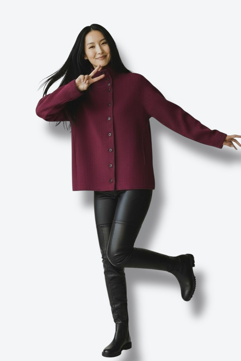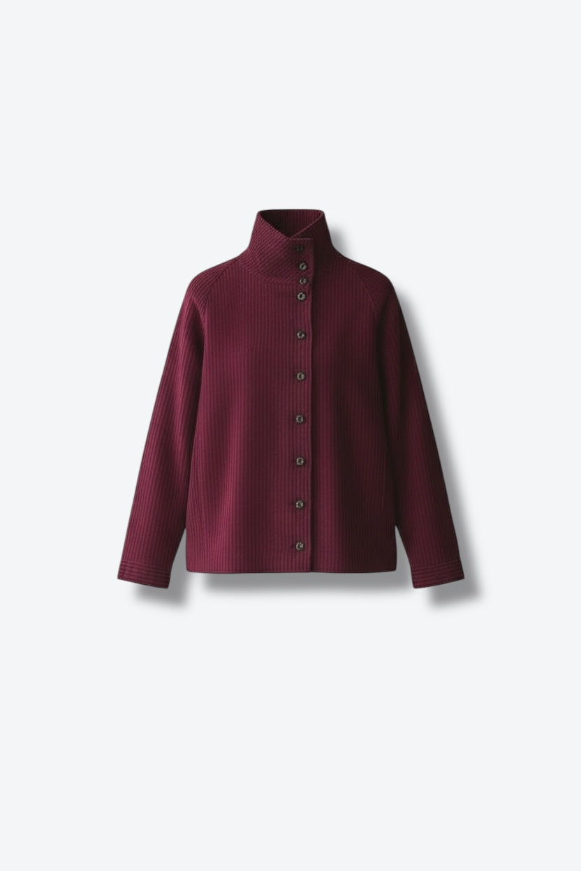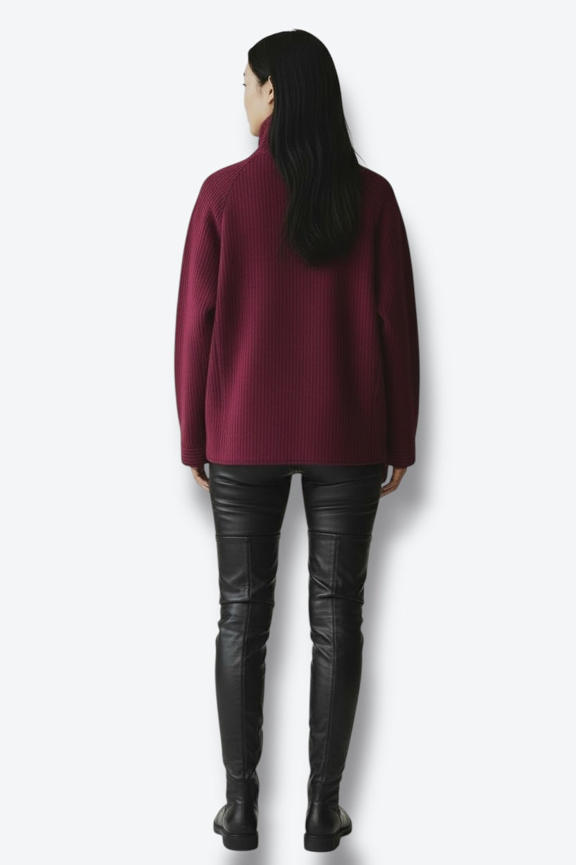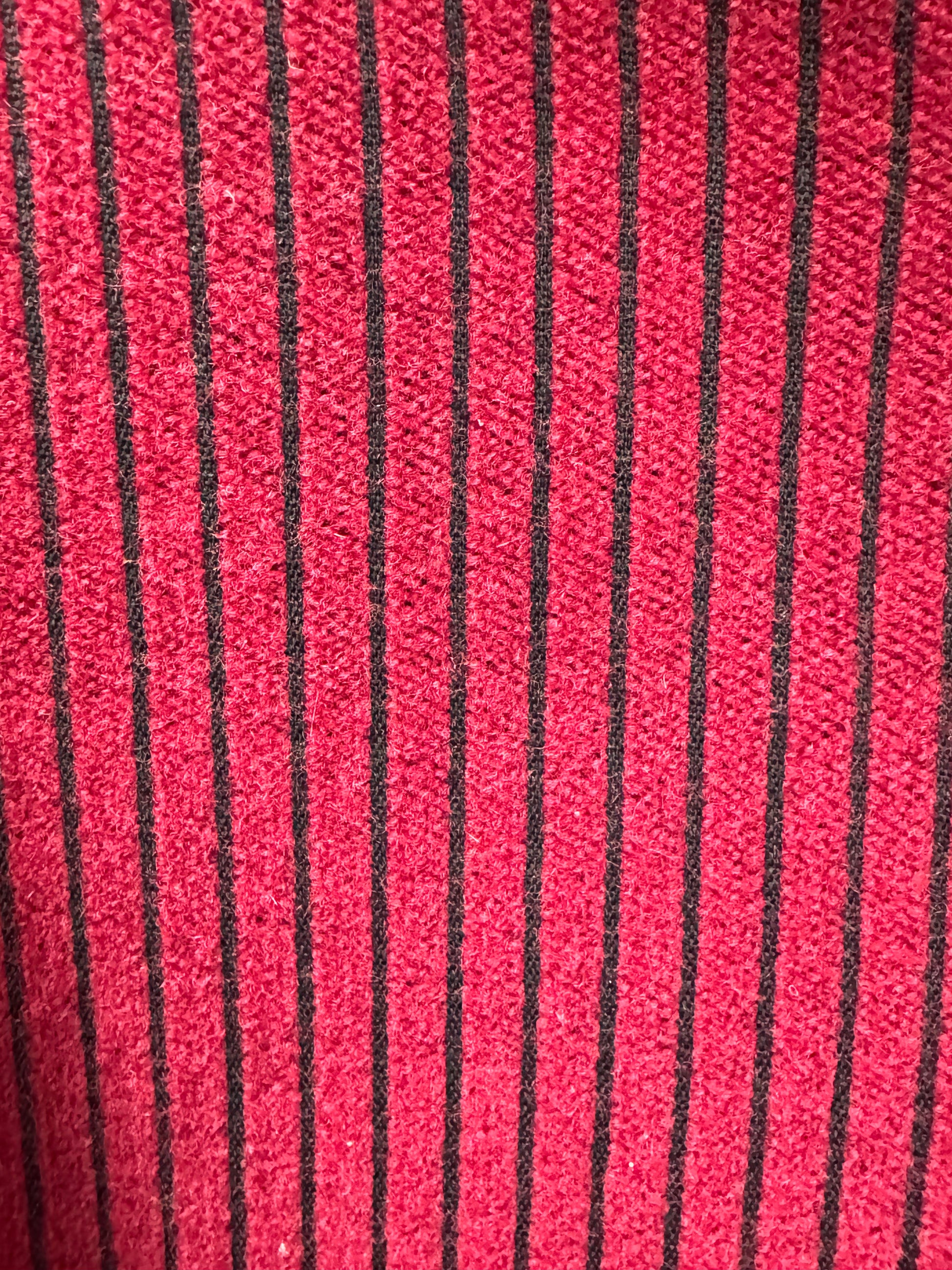 This vintage Emanuel Ungaro Parallèle Paris jacket from the 1980s captures the house’s signature balance of sophistication and structure. Crafted in a deep merlot wool blend with a subtle ribbed texture, it features a high funnel neck, button-front closure, and a slightly boxy silhouette that drapes effortlessly over the frame. The design’s architectural precision and saturated hue are hallmarks of Ungaro’s refined tailoring era, offering both warmth and understated glamour.
