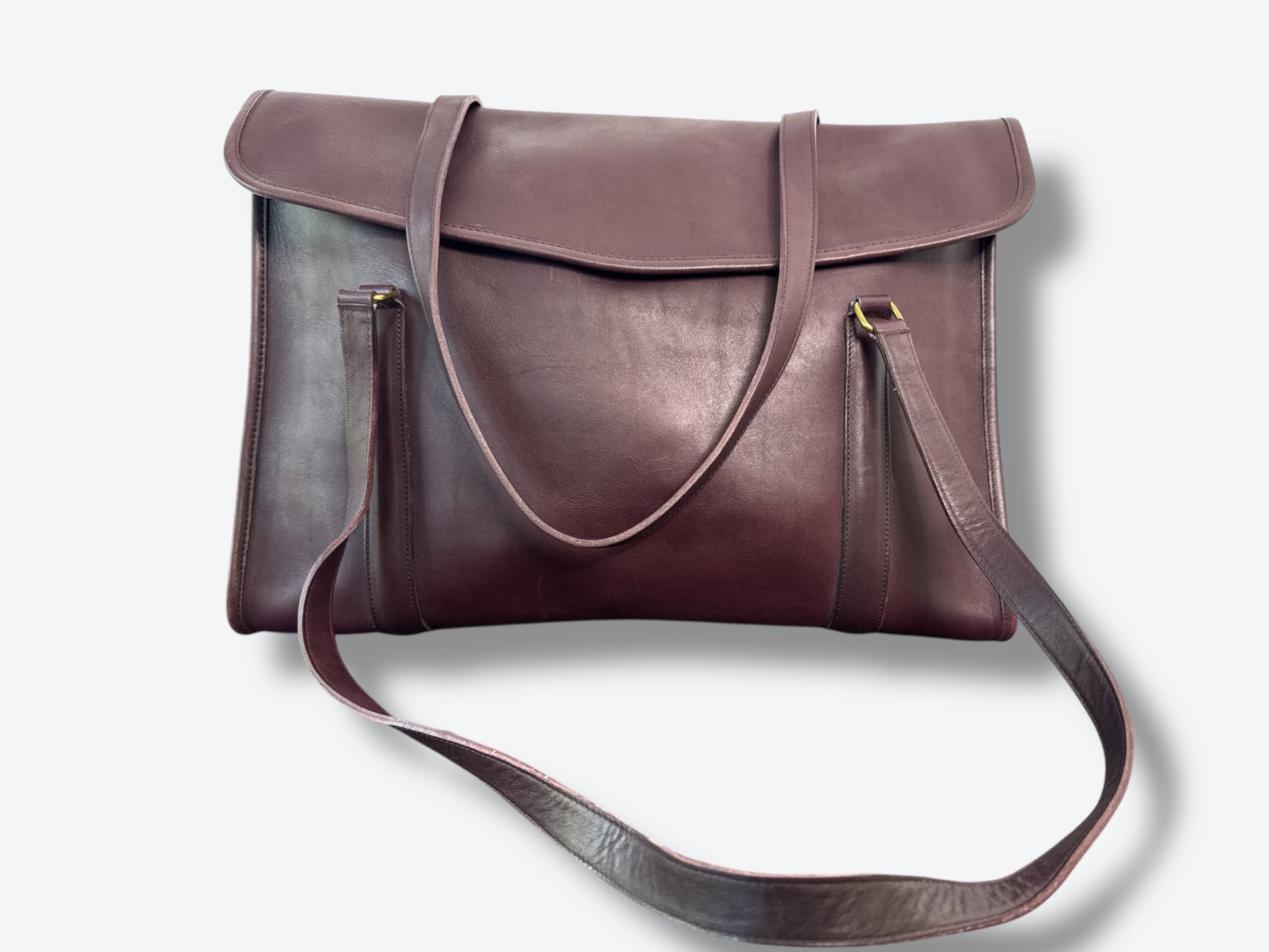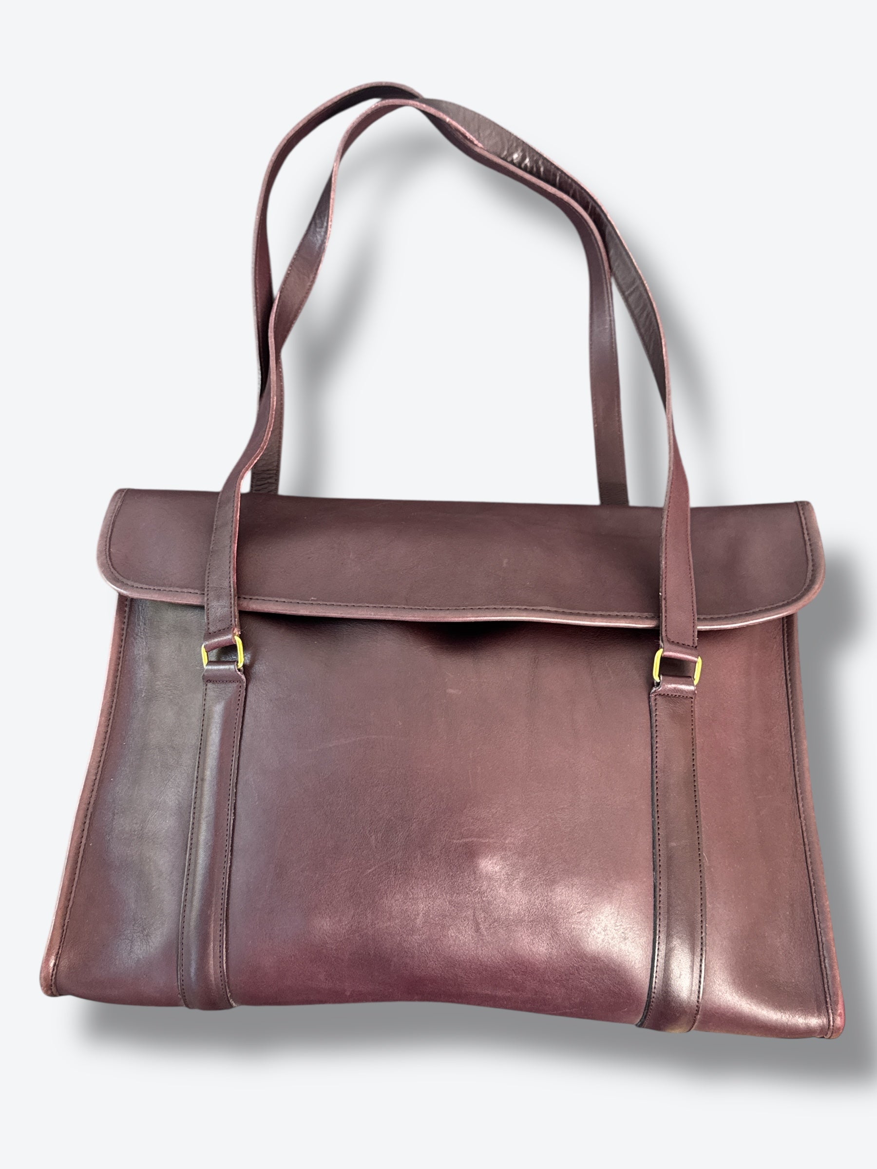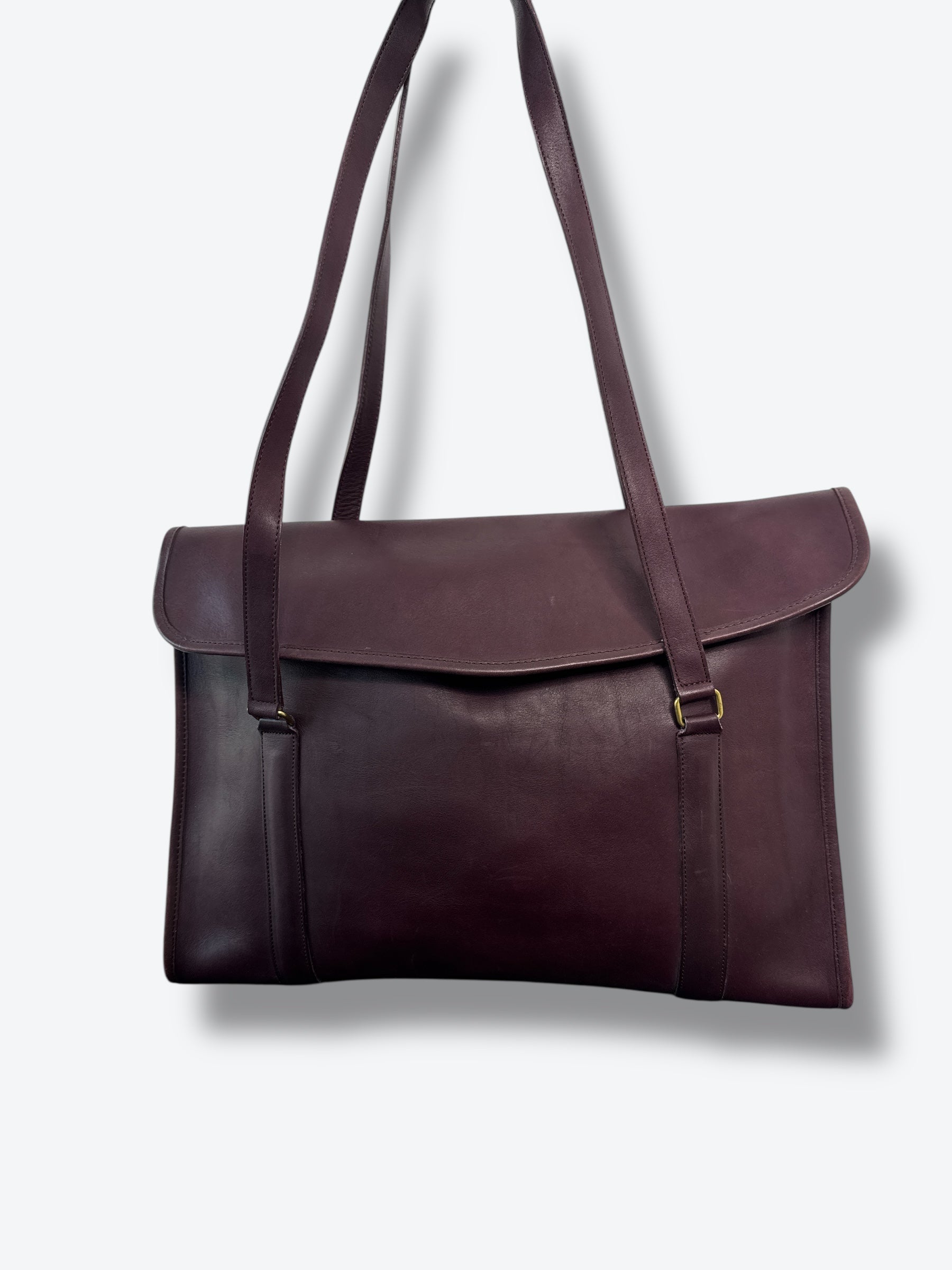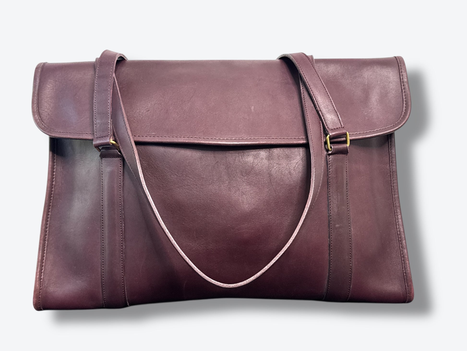 Elevate your everyday with this vintage Coach Slim Brief Tote, style No. 8623, crafted in the late 1970s–1980s in New York City. Made from Coach’s signature glove-tanned leather in a rich oxblood hue, this structured silhouette was designed with both function and refinement in mind. The flap-over closure, dual shoulder straps, and minimal brass hardware highlight the brand’s heritage of clean, understated design. Roomy enough for work essentials, travel documents, or even a slim laptop, this is a timeless piece that transitions seamlessly from office to off-duty.