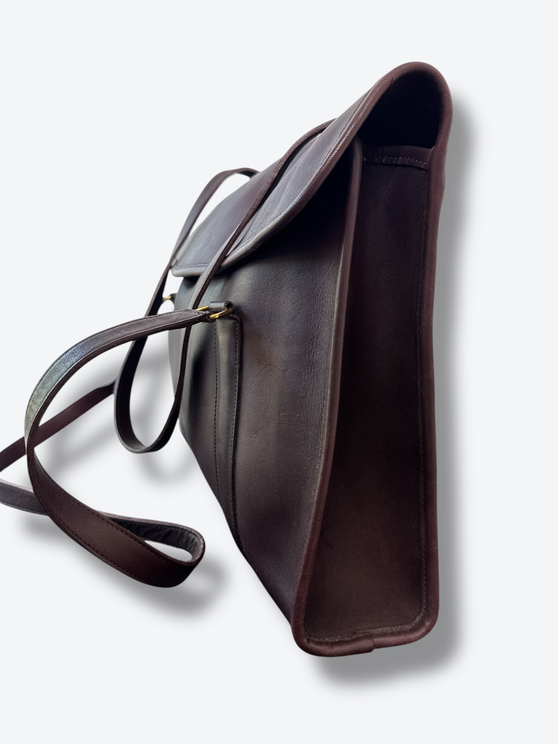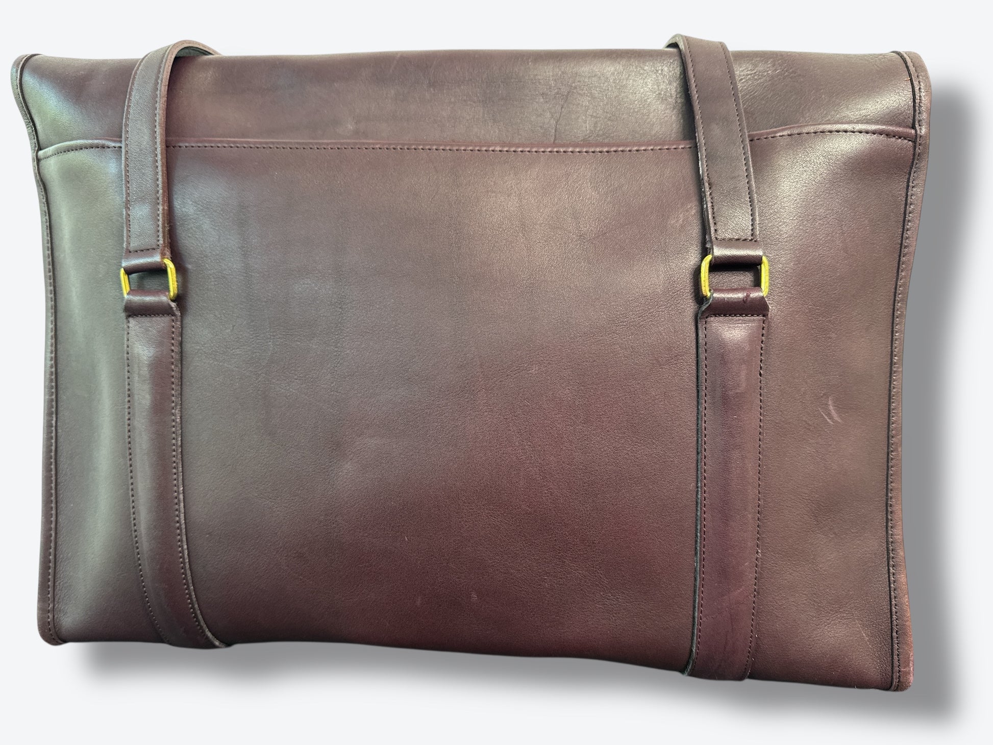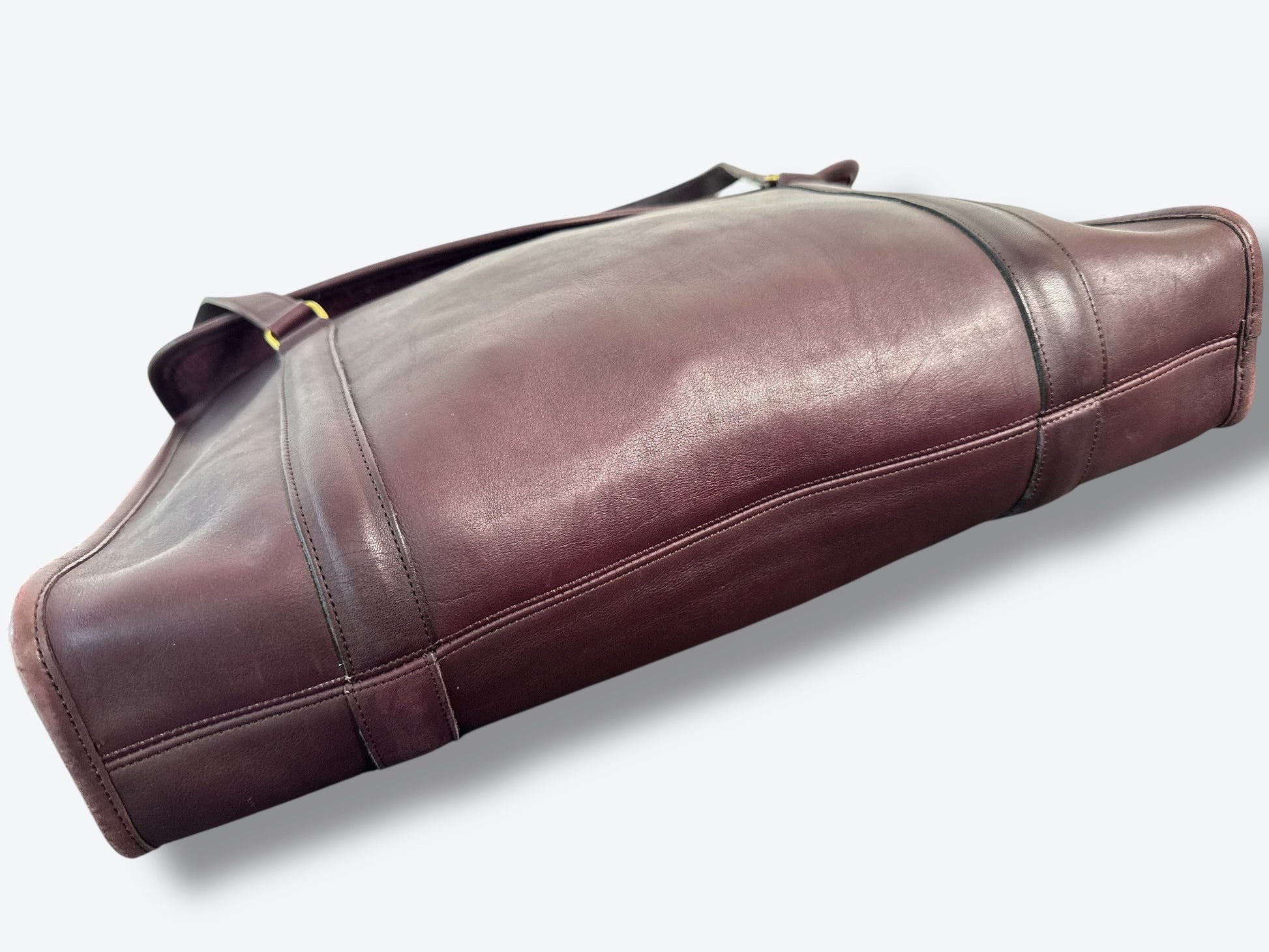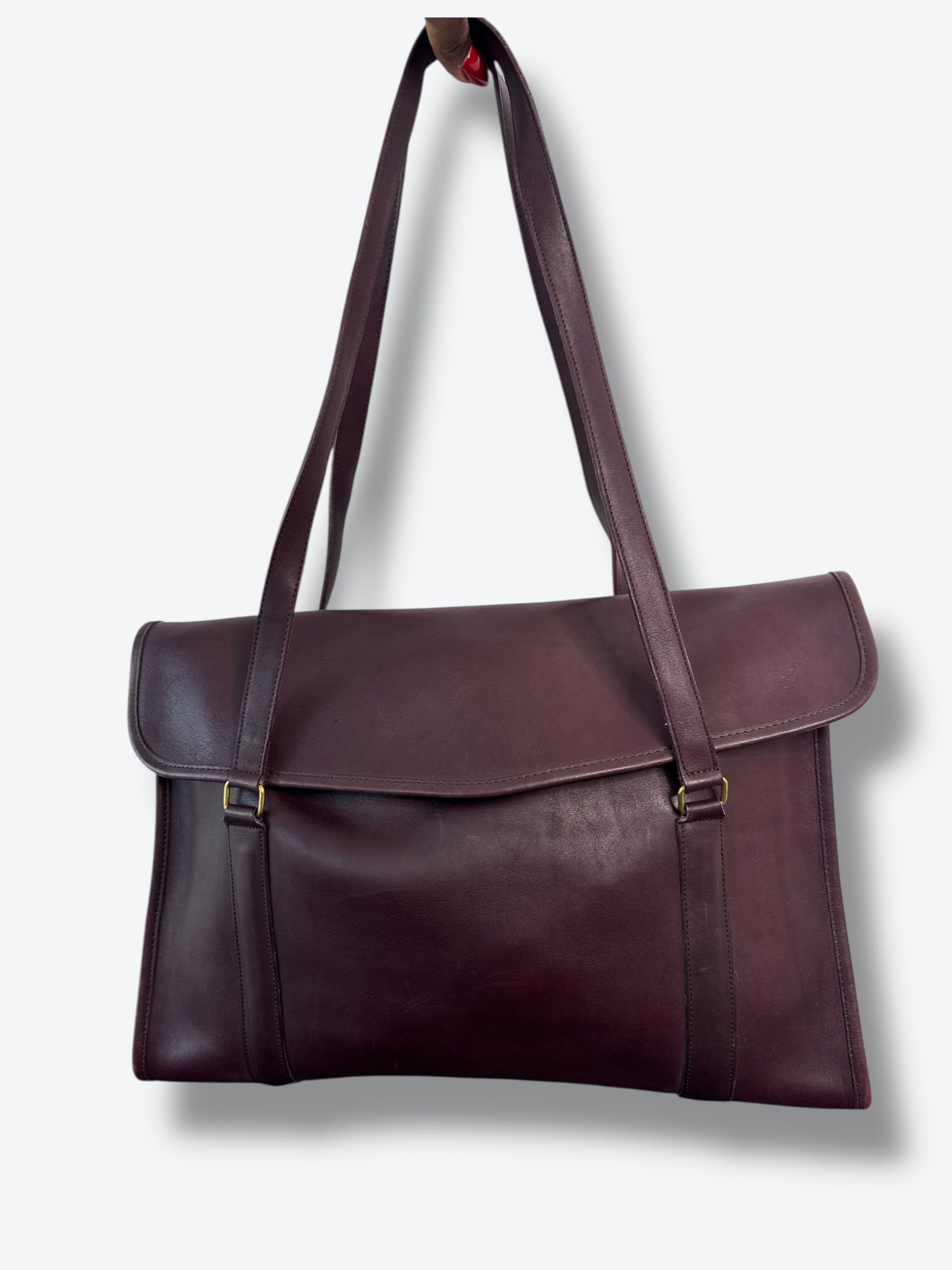 Elevate your everyday with this vintage Coach Slim Brief Tote, style No. 8623, crafted in the late 1970s–1980s in New York City. Made from Coach’s signature glove-tanned leather in a rich oxblood hue, this structured silhouette was designed with both function and refinement in mind. The flap-over closure, dual shoulder straps, and minimal brass hardware highlight the brand’s heritage of clean, understated design. Roomy enough for work essentials, travel documents, or even a slim laptop, this is a timeless piece that transitions seamlessly from office to off-duty.