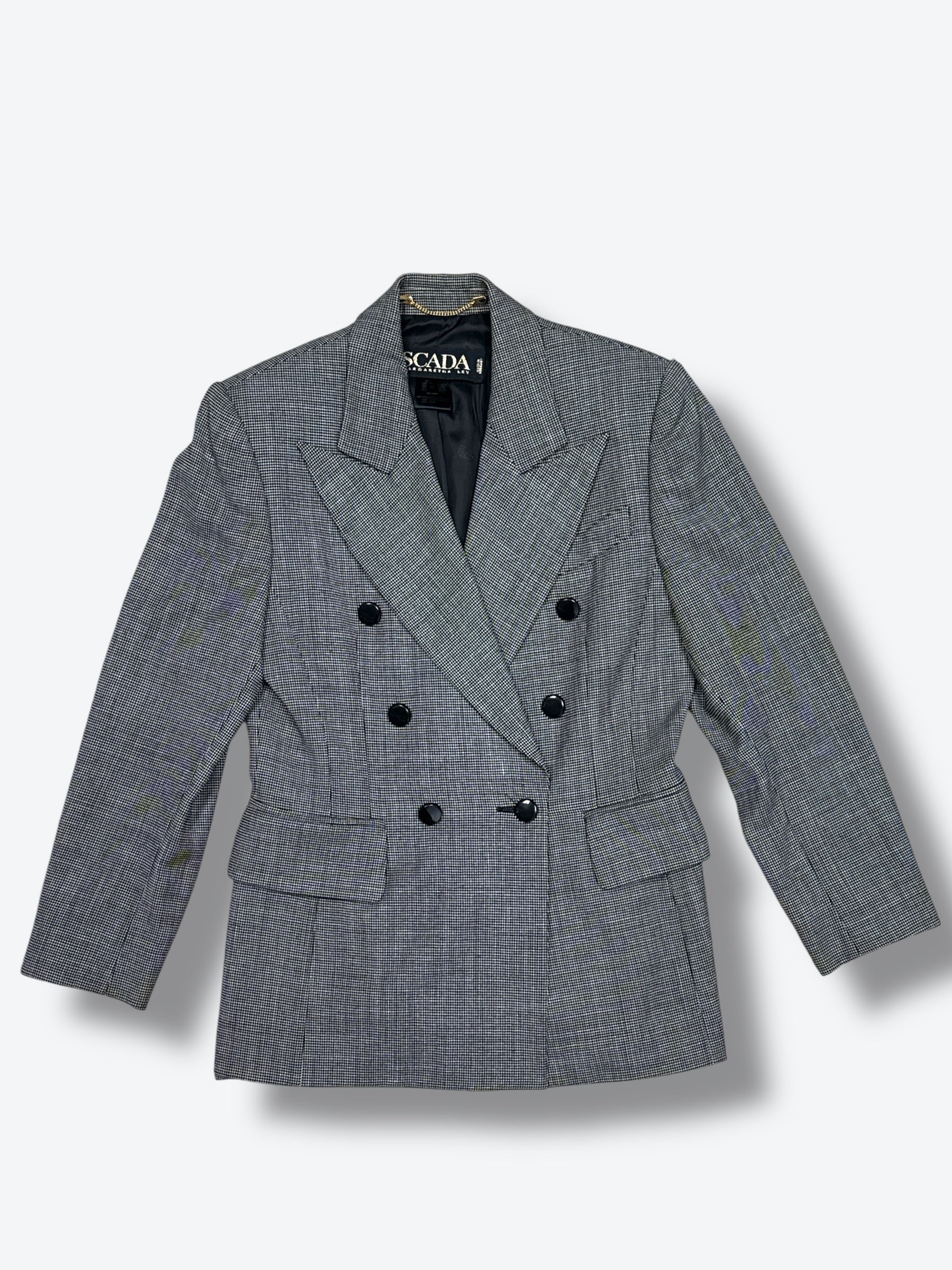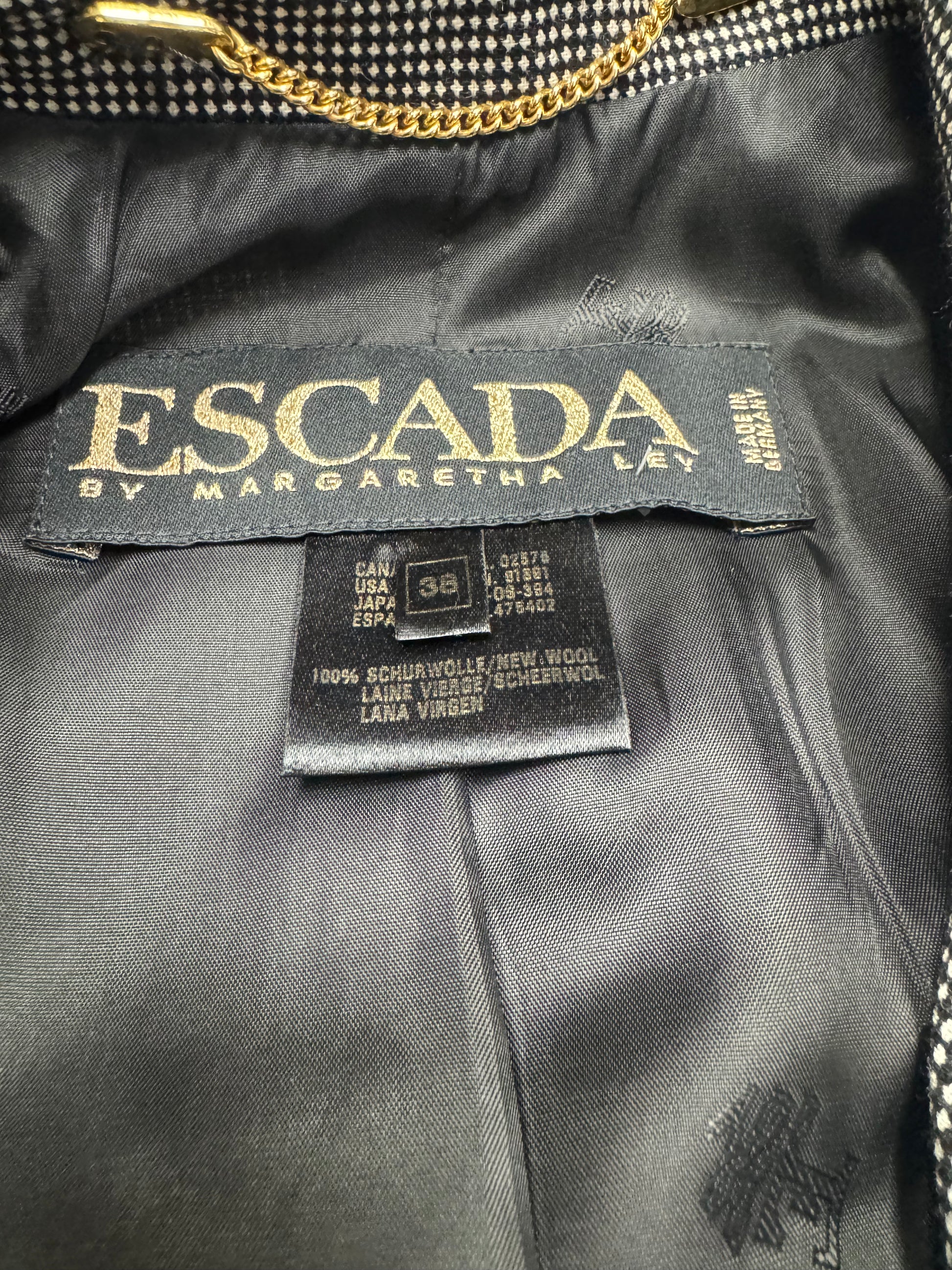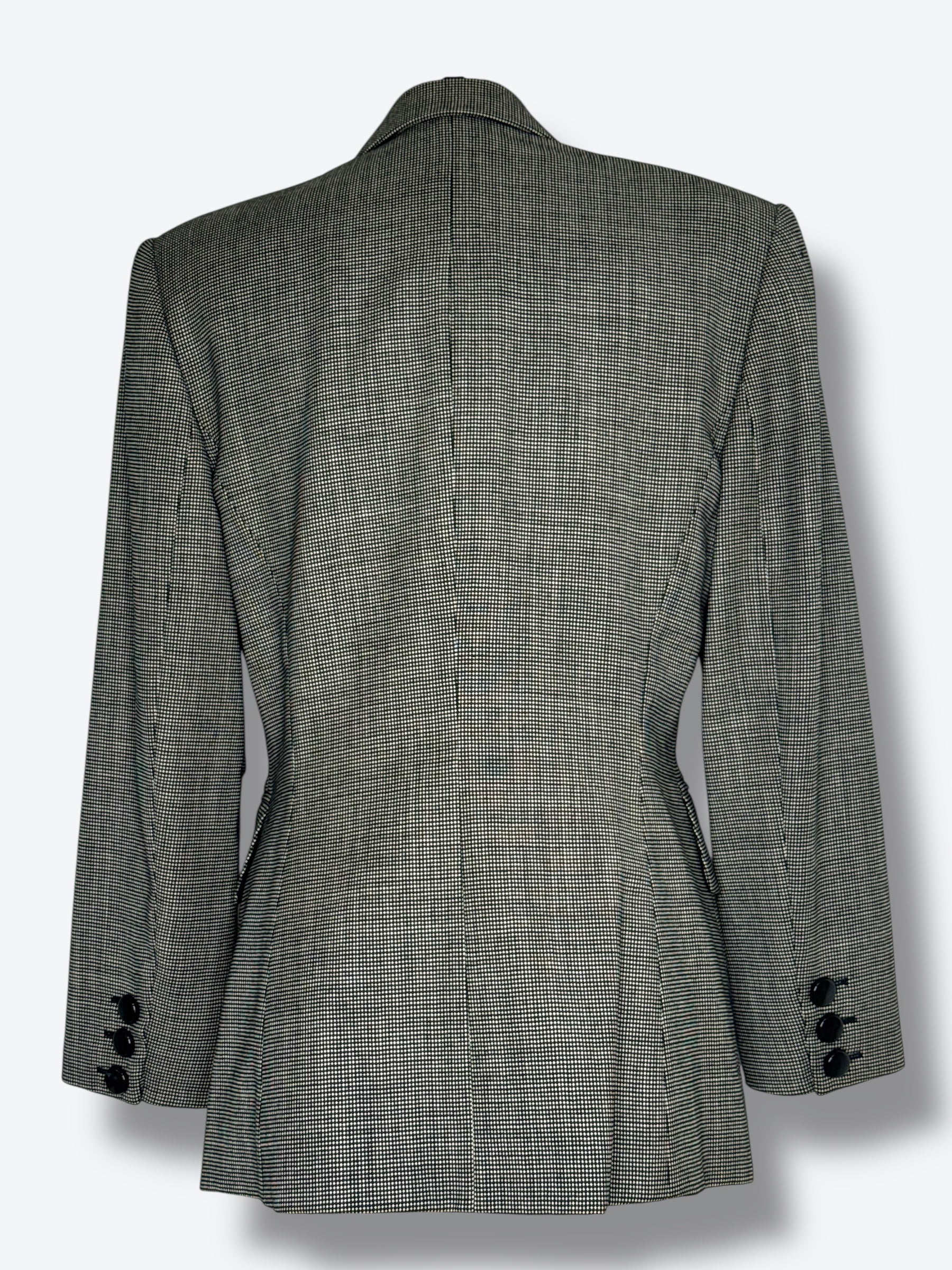 Command attention in this impeccably tailored blazer from Escada’s golden era. Designed by Margaretha Ley, this German-made piece embodies the bold sophistication of the 1980s with its strong shoulders, double-breasted closure, and precise waist tailoring. Crafted in 100% virgin wool with a timeless micro-houndstooth pattern, it’s a classic investment piece that speaks to both vintage collectors and modern minimalists.
