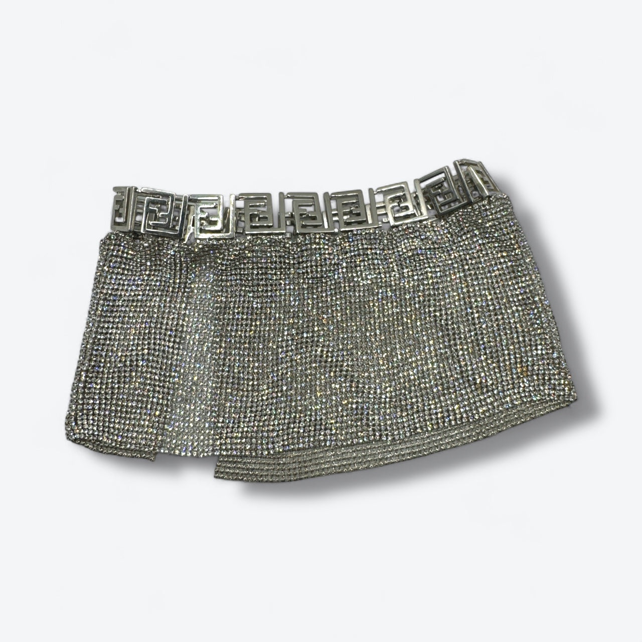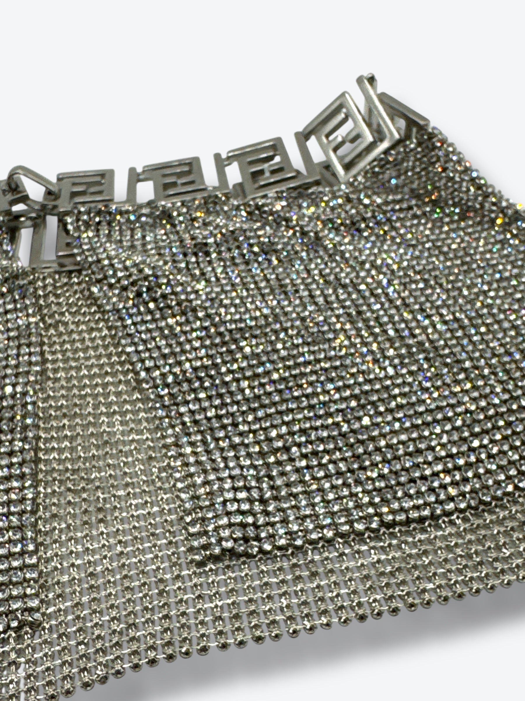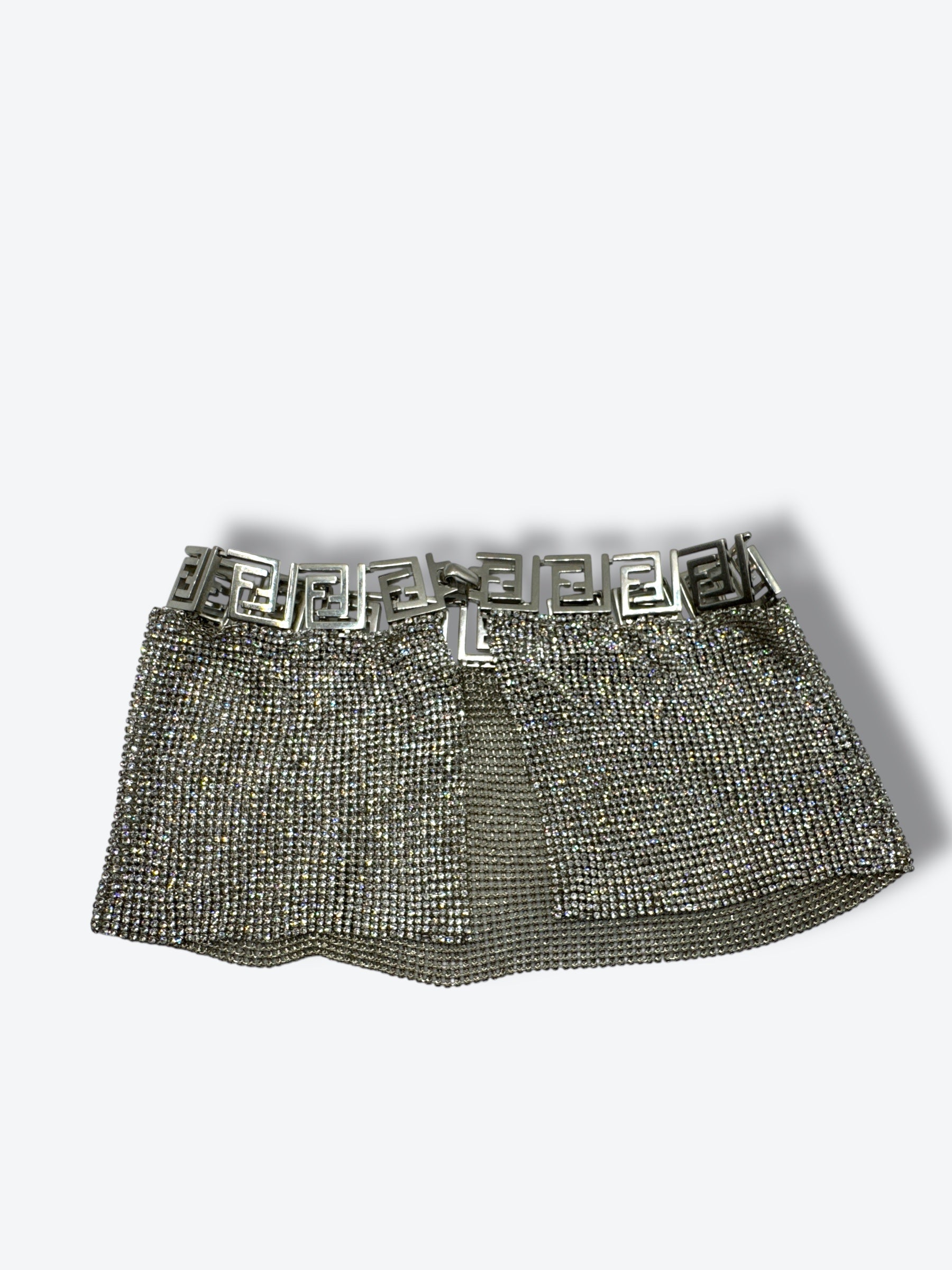This striking vintage Fendi necklace is a true statement of Italian craftsmanship and timeless luxury. Featuring a sculptural multi-strand mesh design in silver-tone metal, the piece is anchored by a bold Greca-pattern choker collar—an iconic Fendi motif that symbolizes the brand’s fusion of geometry and opulence. The draped silhouette gracefully contours the neckline, adding movement and dimension to any ensemble. Perfectly weighted, this collectible necklace exemplifies Fendi’s signature balance between architectural form and sensual elegance.