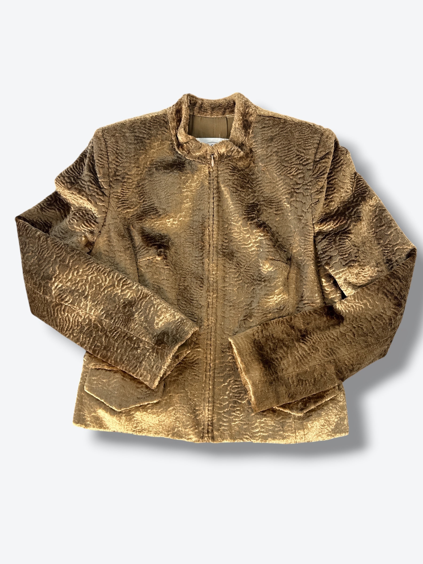This elegant evening jacket by Oscar de la Renta’s diffusion line blends opulent texture with timeless tailoring. Made in the USA of imported fabric, the piece features a lustrous golden velvet with an astrakhan-inspired texture, a structured cropped silhouette, and a zip-front closure for modern ease. Two decorative flap pockets add subtle detail while the standing collar emphasizes the clean, refined lines. A chic layering piece that carries the glamour of the 90s into today’s wardrobe.