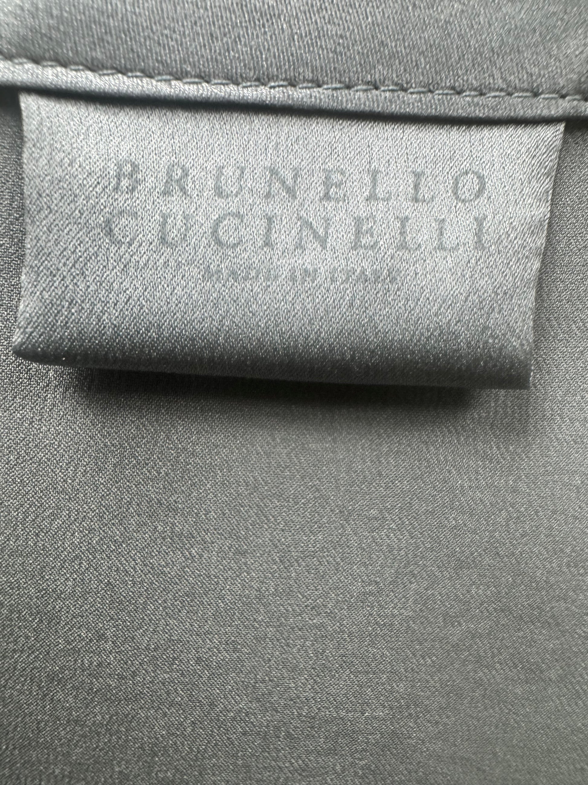 Understated luxury at its finest. This authentic Brunello Cucinelli silk charmeuse tank captures the brand’s signature elegance with its fluid drape and subtle sheen. Made in Italy, the piece features a soft V-neckline and minimalist silhouette that transitions seamlessly from day to evening. The pale ice-blue hue offers a refined, modern touch—perfect for pairing with tailored trousers, leather pants, or layered under a blazer for an effortlessly elevated look.