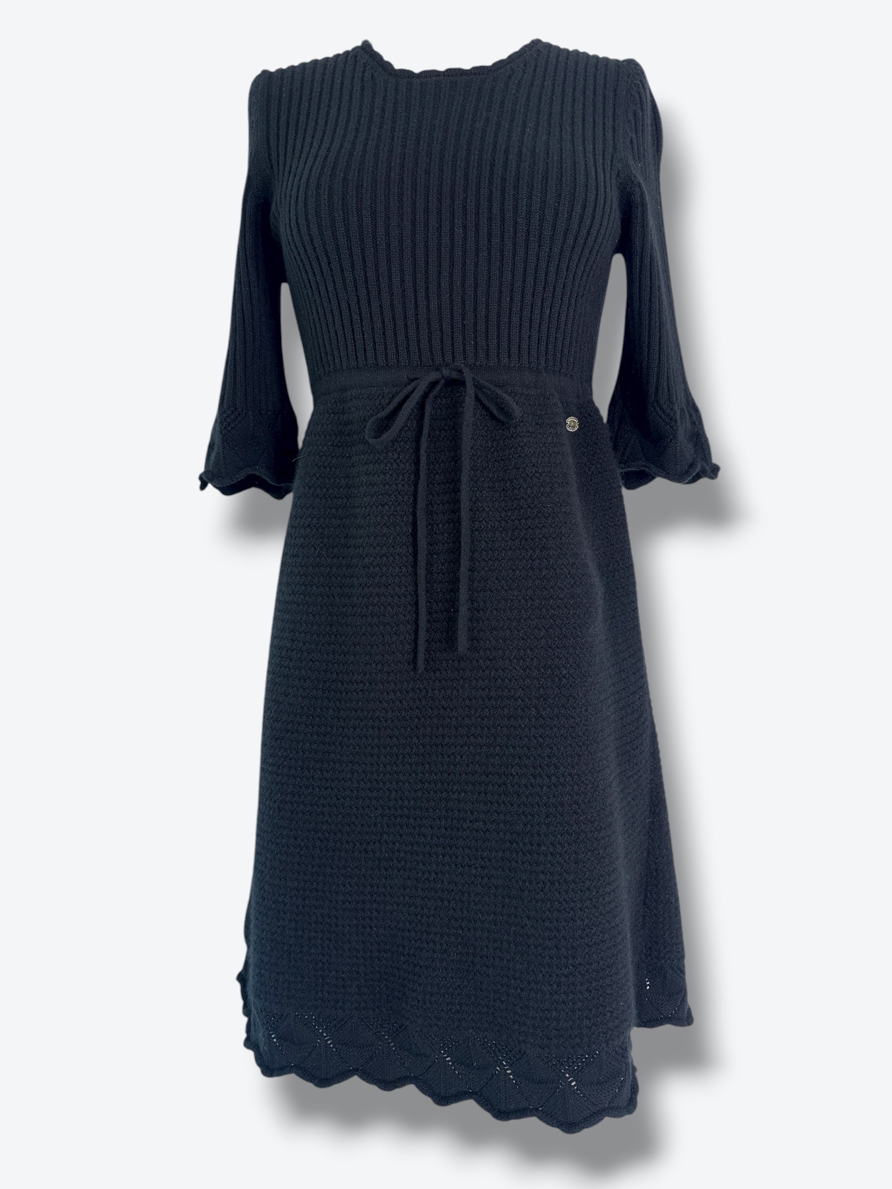 Elevate your wardrobe with this timeless Chanel knit dress from the 08A (Fall 2008) collection, crafted in Italy. Designed with effortless sophistication, this piece features a ribbed knit bodice, a flattering waist tie for definition, and a softly flared skirt with scalloped hem detailing. The ¾-length sleeves add an elegant, transitional touch, making it perfect for both daytime polish and evening refinement.