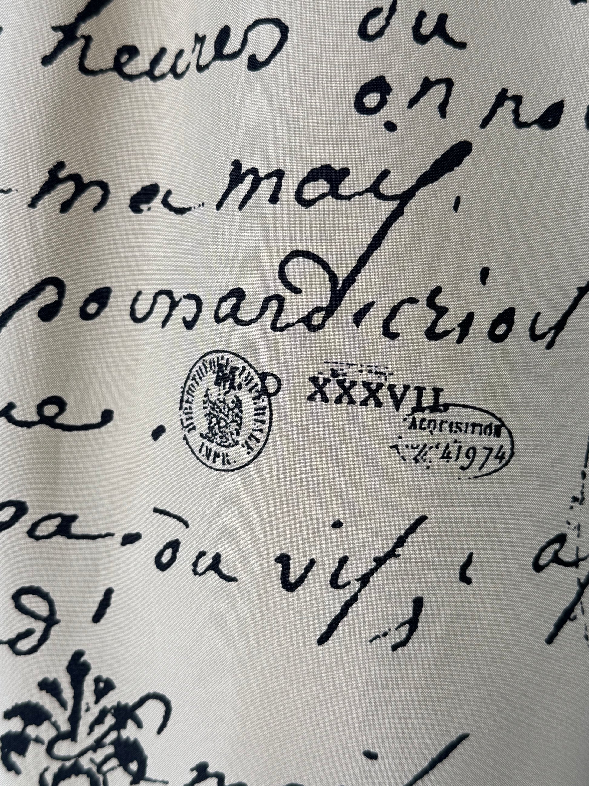 Style Tip: Let the blouse take center stage by pairing it with sleek black trousers or a leather pencil skirt for a chic, editorial-ready outfit. For a more relaxed vibe, tuck it into high-waisted jeans and add a structured blazer. Accessorize with minimal jewelry—think small gold hoops or a delicate chain—to let the handwritten script print shine. This piece is versatile enough to move from a gallery opening to an evening dinner with effortless sophistication.