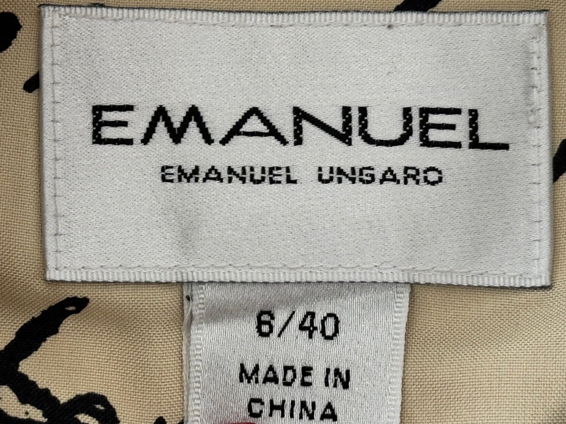 This Emanuel Ungaro “Emanuel” line blouse features a striking allover script print in black on a neutral beige background, evoking the look of handwritten letters and vintage stamps. Crafted with a button-down front, classic collar, and long sleeves with buttoned cuffs, the shirt blends timeless tailoring with a bold artistic print. The design channels Ungaro’s signature flair for combining elegance with expressive, conversational motifs, making it a statement piece for collectors and style enthusiasts alike.