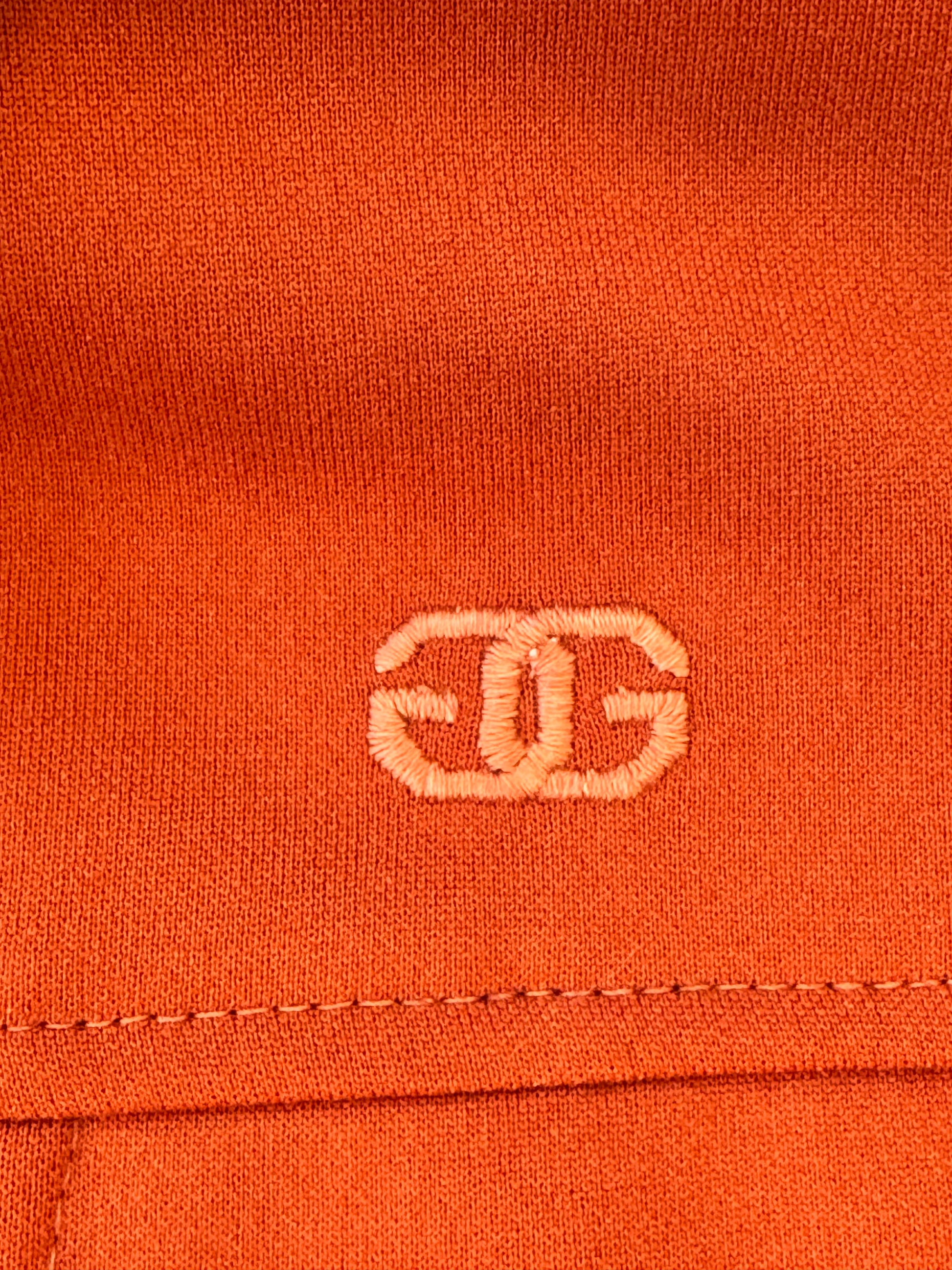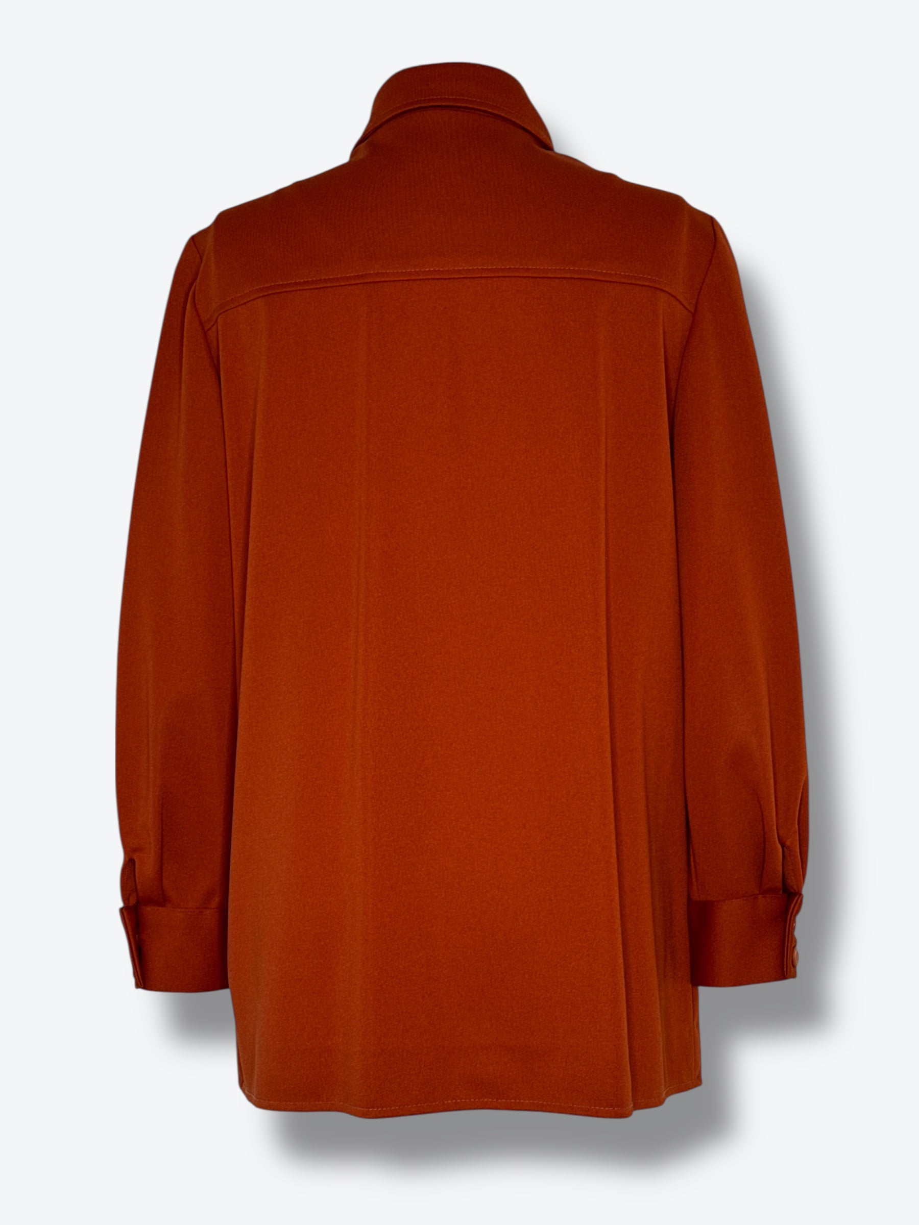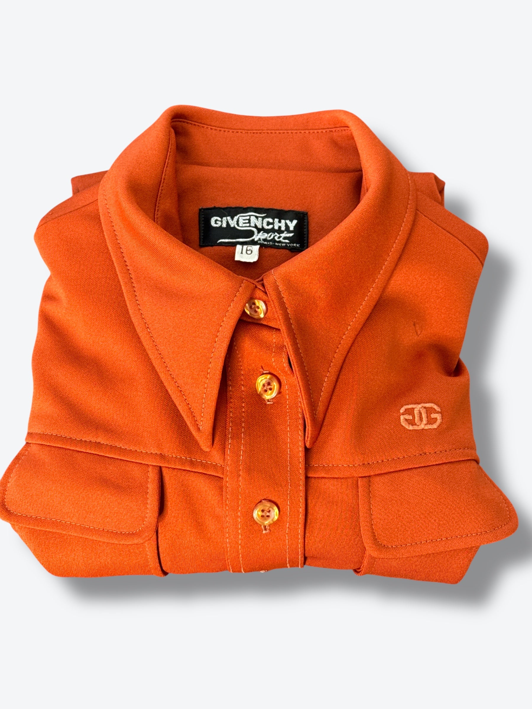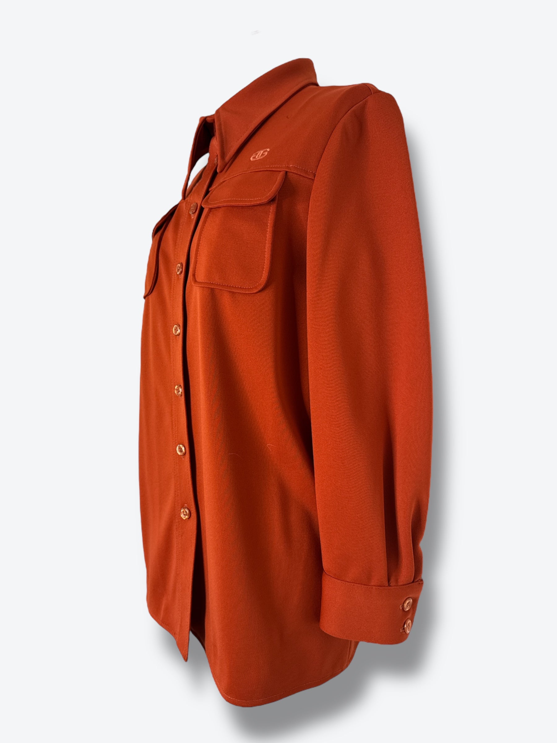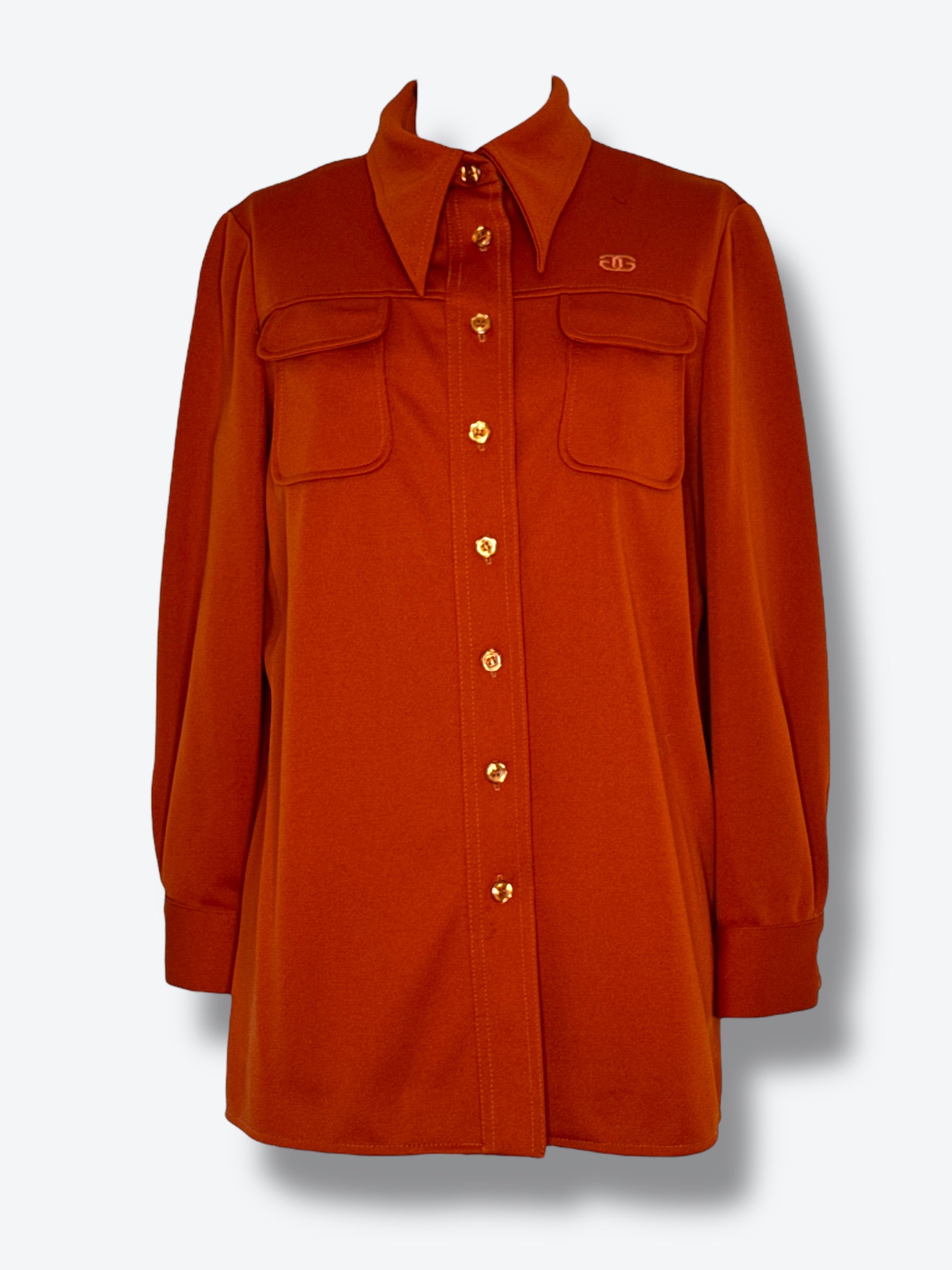 Step into retro sophistication with this vintage rust-orange button-down blouse. Crafted in a rich, autumnal hue, the shirt features bold gold-tone buttons, two structured flap pockets at the chest, and a sharp collar that nods to 1970s tailoring. The fabric drapes effortlessly, while the subtle embroidered emblem above the pocket adds a touch of refinement. Its long sleeves with cuffed wrists bring structure, making this blouse a versatile piece that transitions seamlessly from day to night.