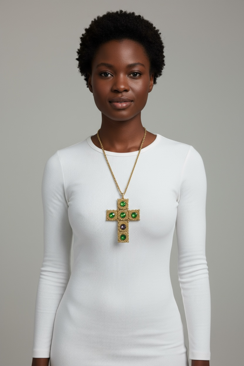 A statement of divine glamour, this vintage Maltese cross pendant necklace captures the bold artistry of 1980s fashion. Crafted in richly textured gold-tone metal, the oversized cross features luminous green cabochon stones accented by a single deep amethyst center, adding regal depth and dimension. Suspended from a substantial rope chain, the piece embodies the opulent, Byzantine-inspired aesthetic made famous by couture houses like Chanel and Yves Saint Laurent during the era.