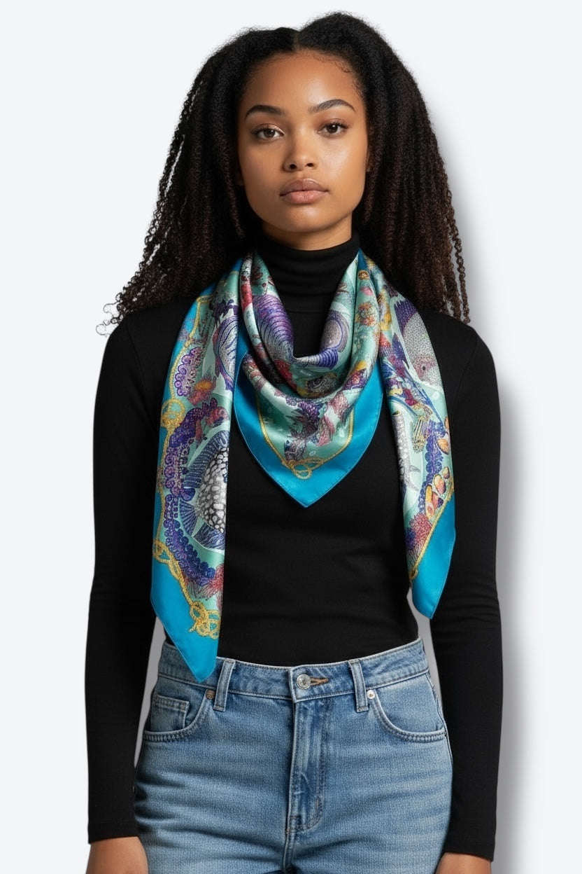 Dive into luxury with Hermès’ iconic Les Poissons carré. Bursting with color and detail, this silk masterpiece features four majestic tropical fish framed by coral reefs, seashells, and a golden rope border. Designed by Christine Henry in 1992, it’s a wearable work of art that brings oceanic elegance to any look. Collectible, covetable, and undeniably chic.