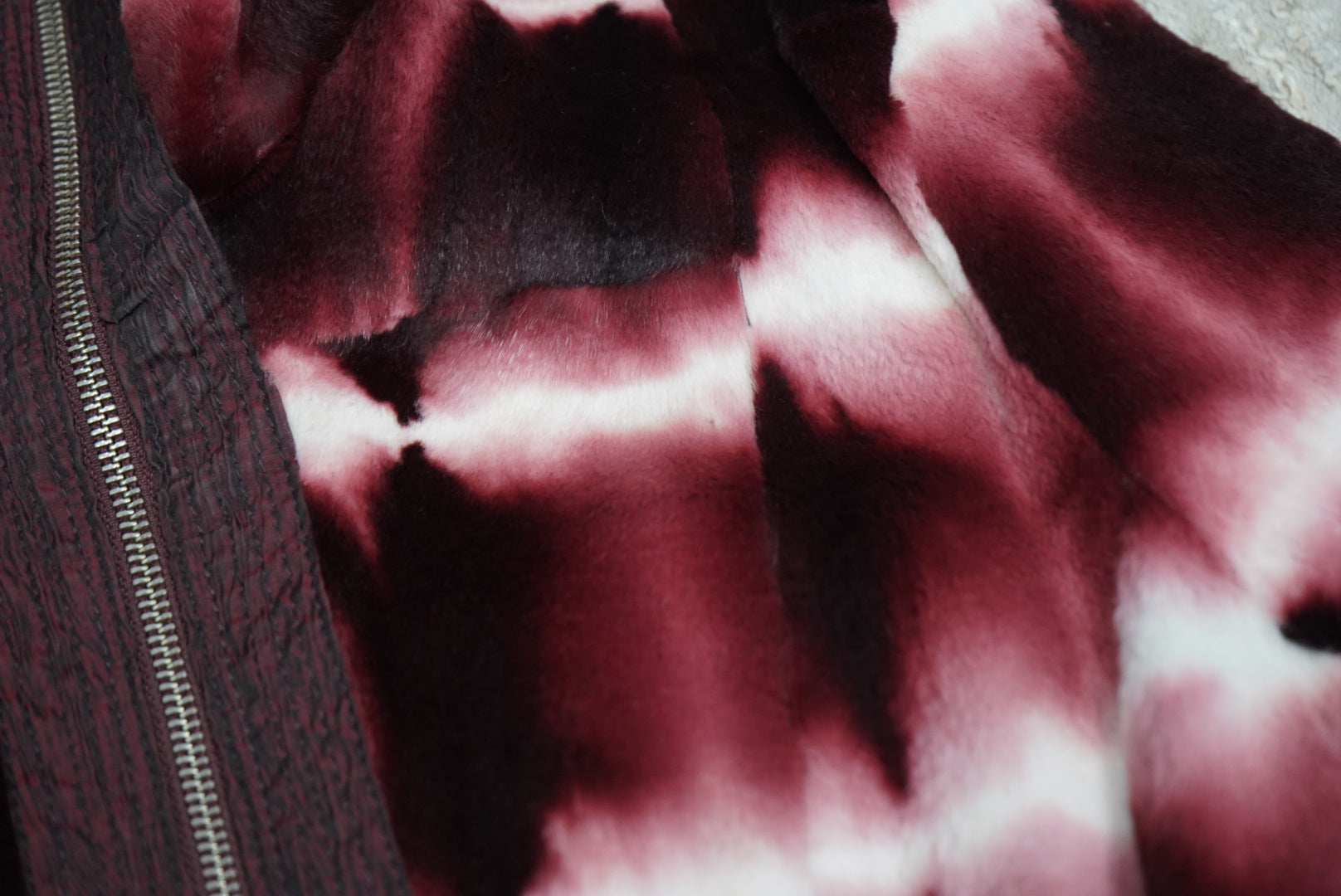 A striking Y2K-era reversible zip-front jacket featuring a rich burgundy tie-dye exterior and a clean, tonal reverse for two distinct looks in one. Designed with a high stand collar, full zip closure, and a sculpted belted waist, this piece merges sporty functionality with fashion-forward tailoring. The saturated wine hues and flattering silhouette make it a versatile statement layer that transitions seamlessly from day to night.