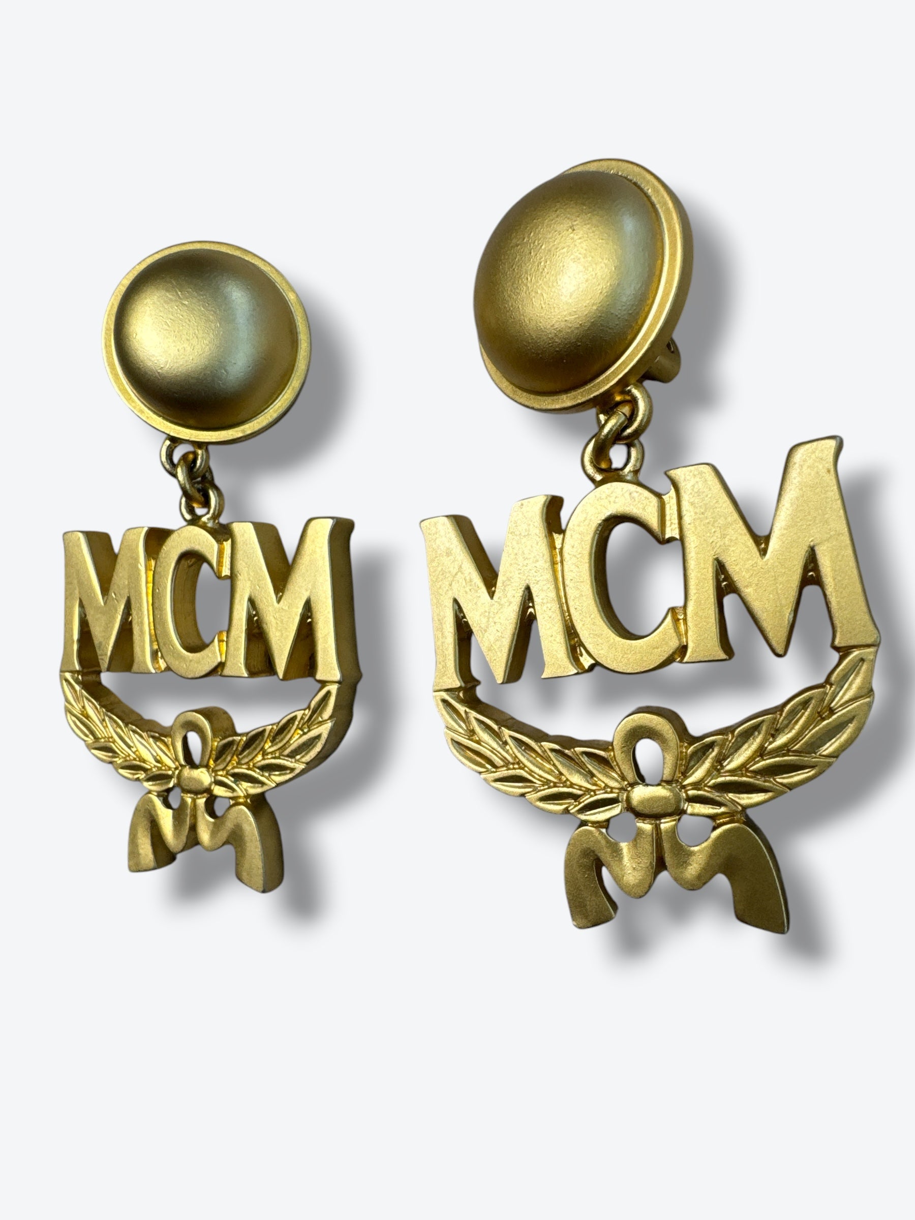 - Details: Clip-on backs, laurel wreath and bow motif, bold MCM logo