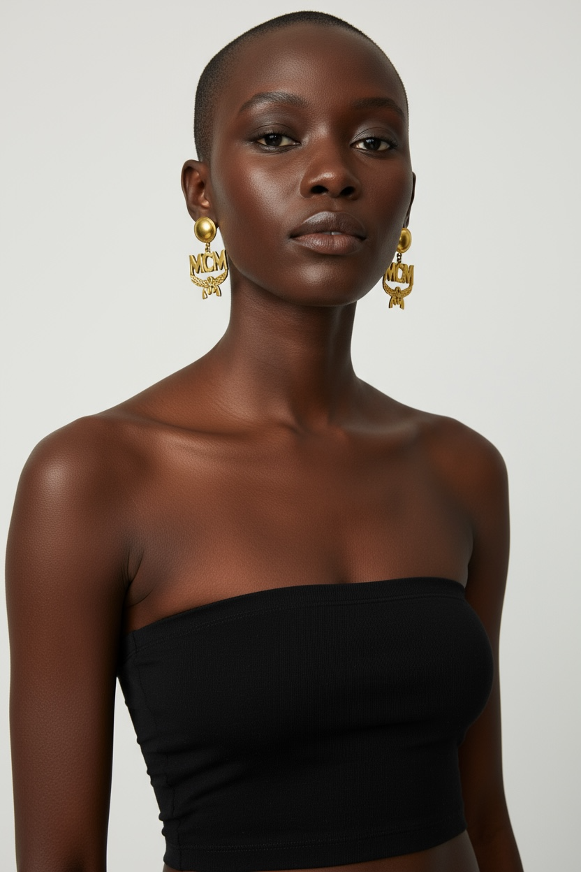 These bold statement earrings from MCM feature the brand’s signature logo and laurel wreath motif, accented by a ribbon detail. Crafted in a matte gold-tone finish, the earrings are designed with large round studs and clip-on backs, embodying the oversized, logo-forward jewelry trend of the 1980s and early 1990s. A rare and collectible accessory that captures the height of MCM’s vintage luxury aesthetic.
