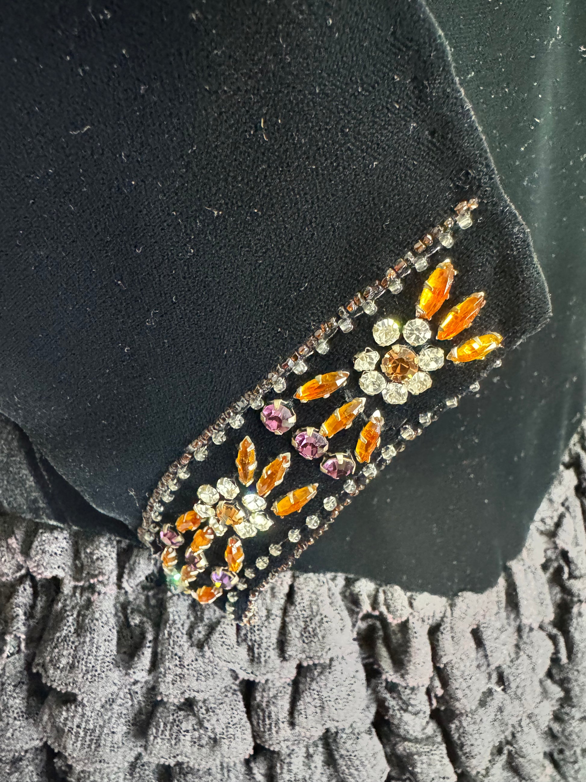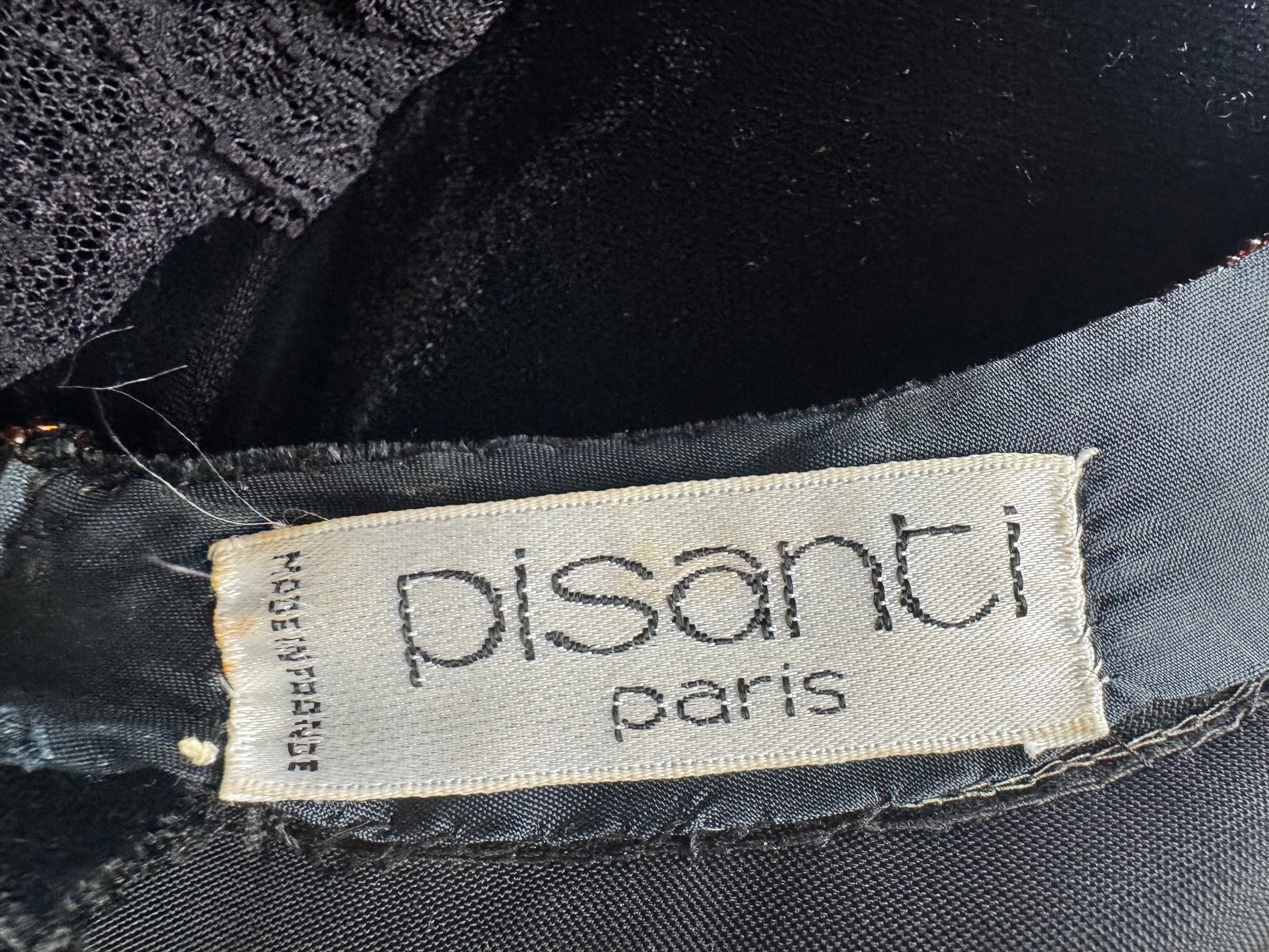A rare and dramatic vintage gown from Pisanti Paris, designed for maximum couture presence. This striking black dress features a plush velvet bodice with a plunging V-neckline, framed by hand-applied gold and crystal embellishments that catch the light beautifully. The textured lace ruffle sleeves and skirt create volume, movement, and undeniable drama, giving this dress a true runway feel. The silhouette is romantic yet powerful — a statement piece meant for a woman who commands a room.