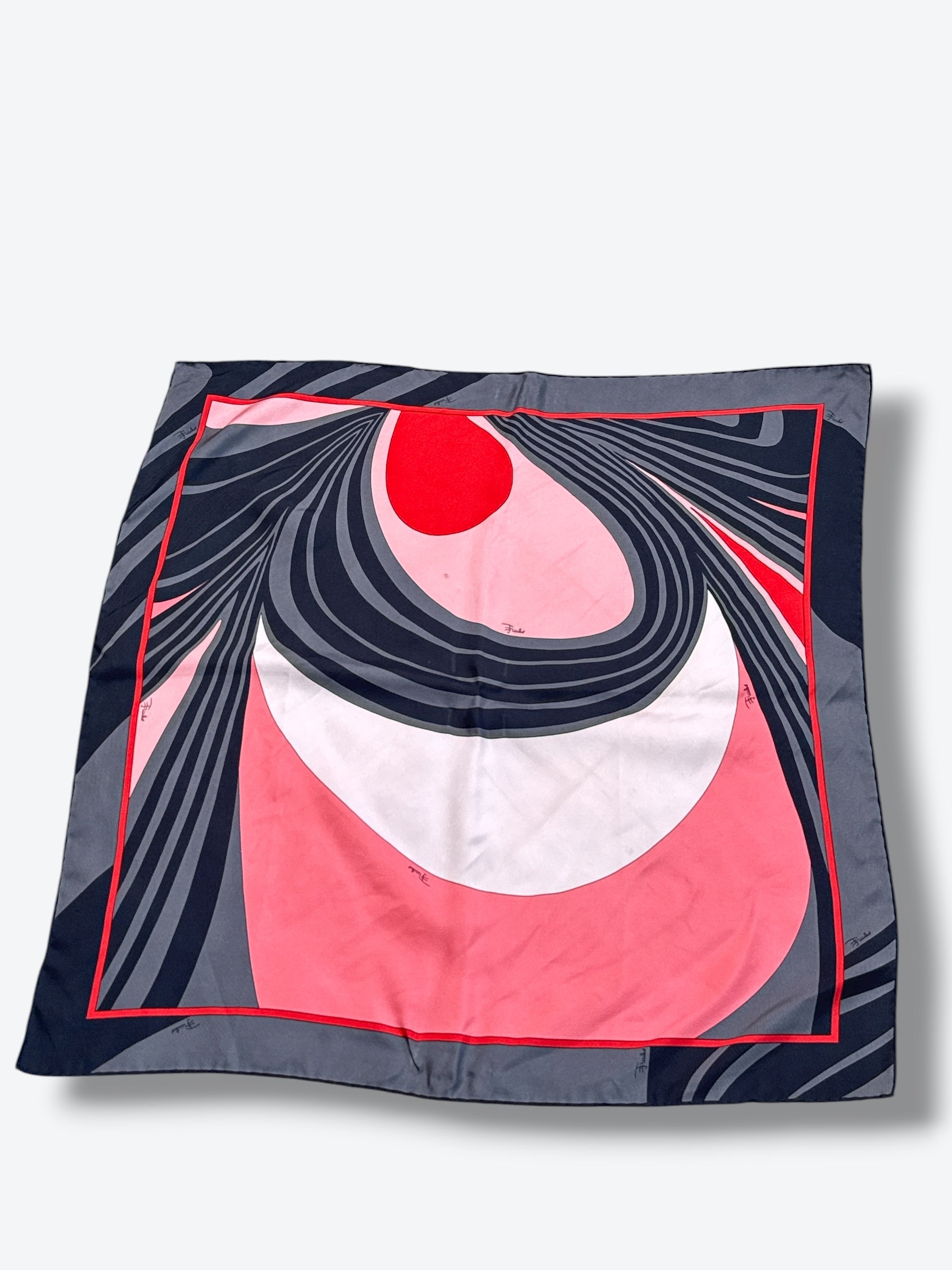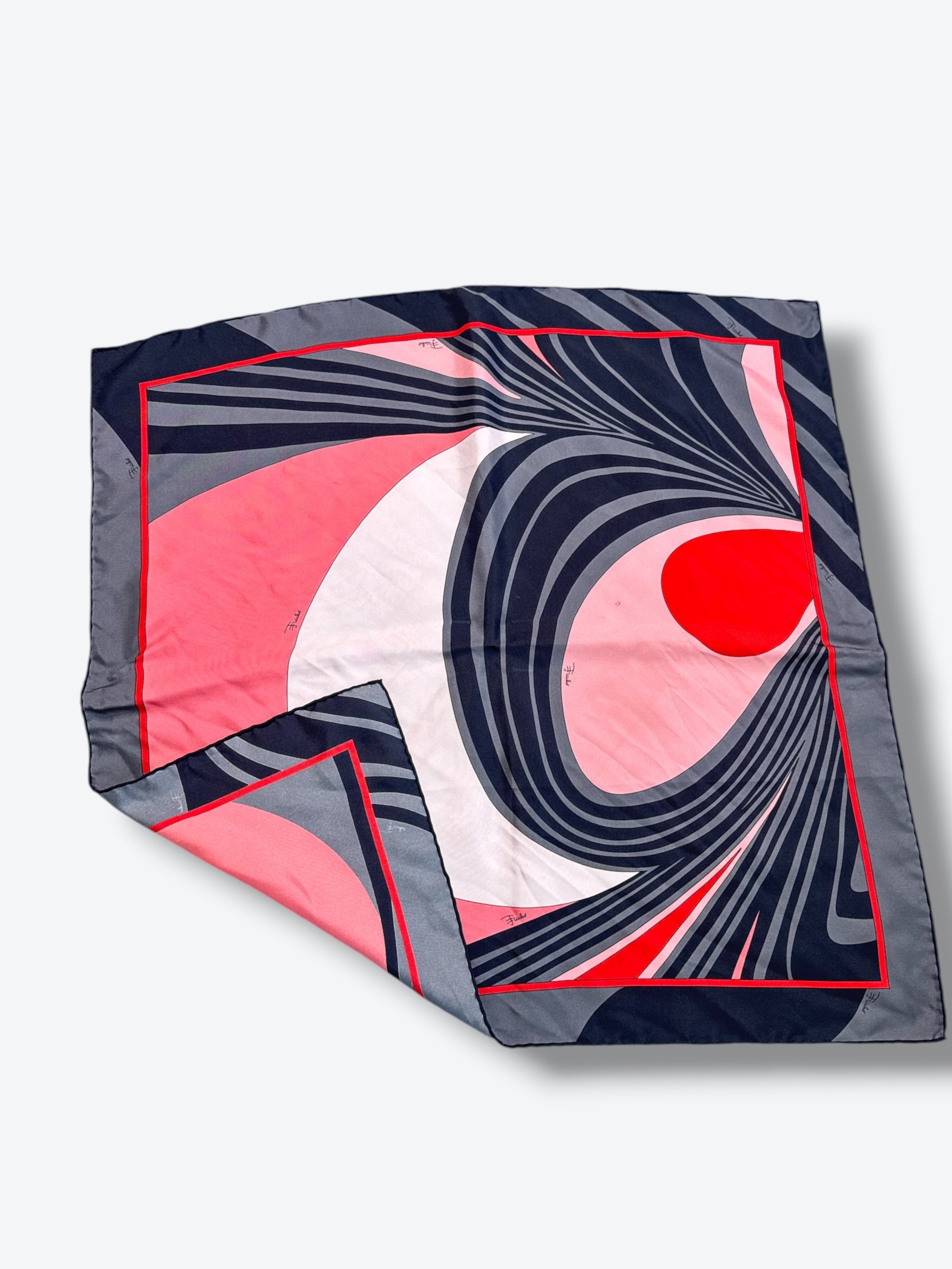An iconic Pucci statement piece, this silk scarf features a mesmerizing swirl motif in coral pink, gray, navy, and red, framed with a bold border. The hand-rolled edges and scattered “Emilio” signatures mark its authenticity. Perfect for collectors and lovers of Italian fashion heritage.