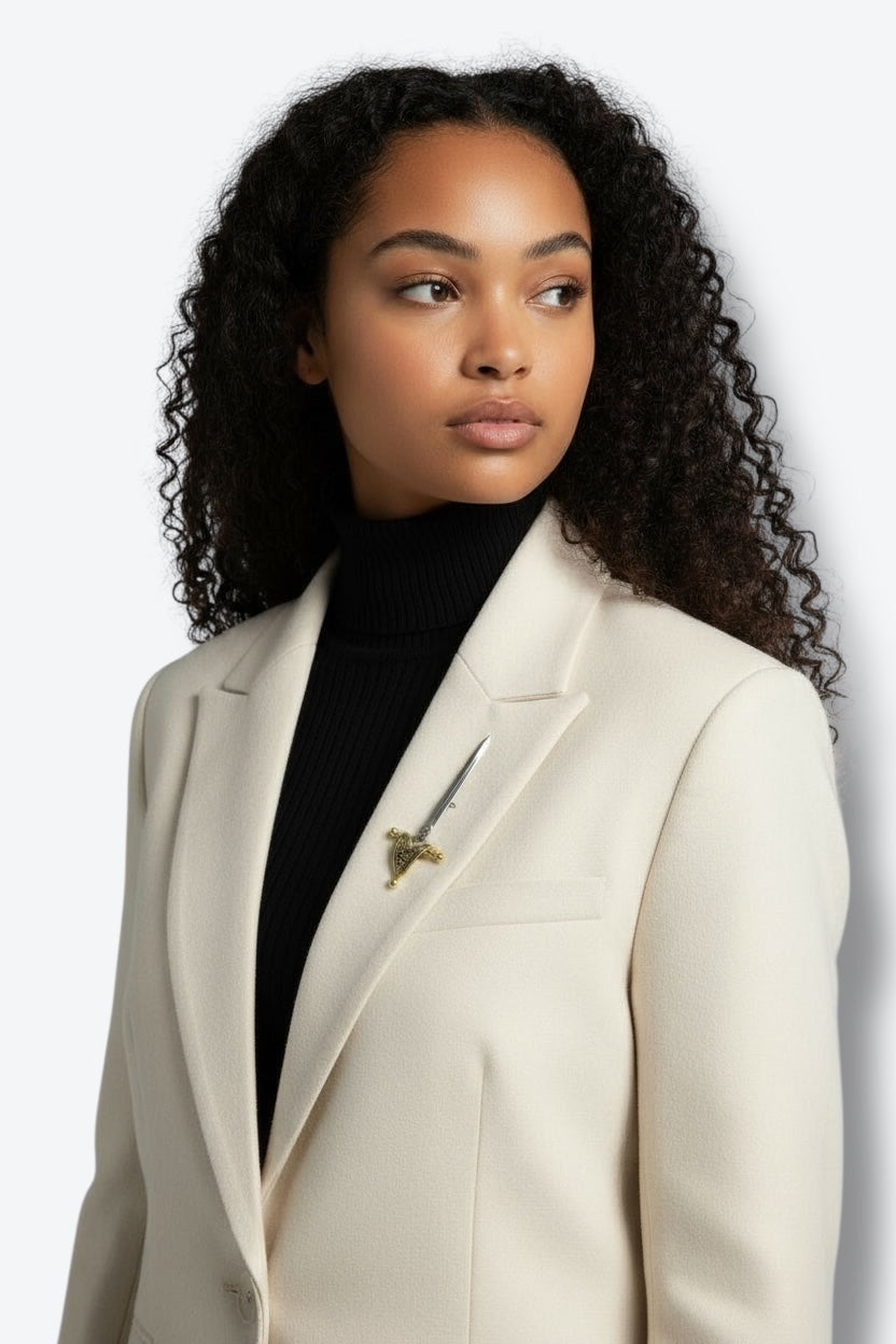 Style Tip: Pin this piece on a tailored blazer or structured coat to add a touch of edge and sophistication. It’s the perfect statement for anyone channeling vintage warrior energy—balanced, bold, and endlessly chic.