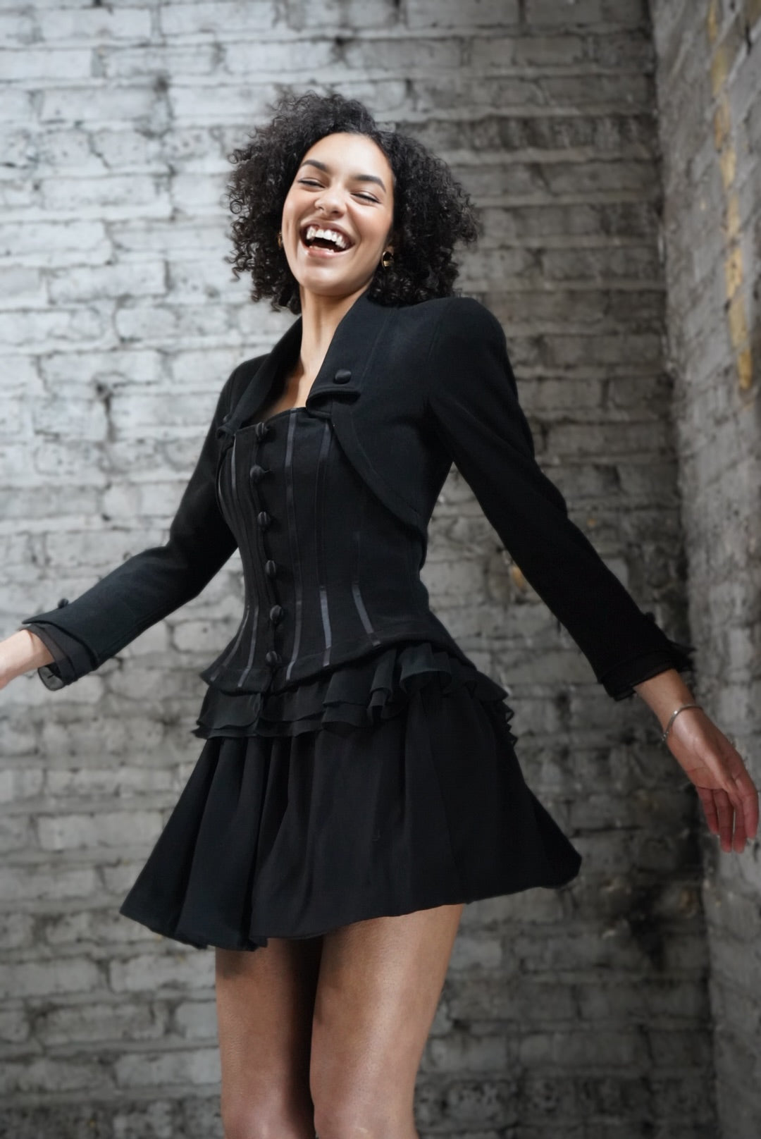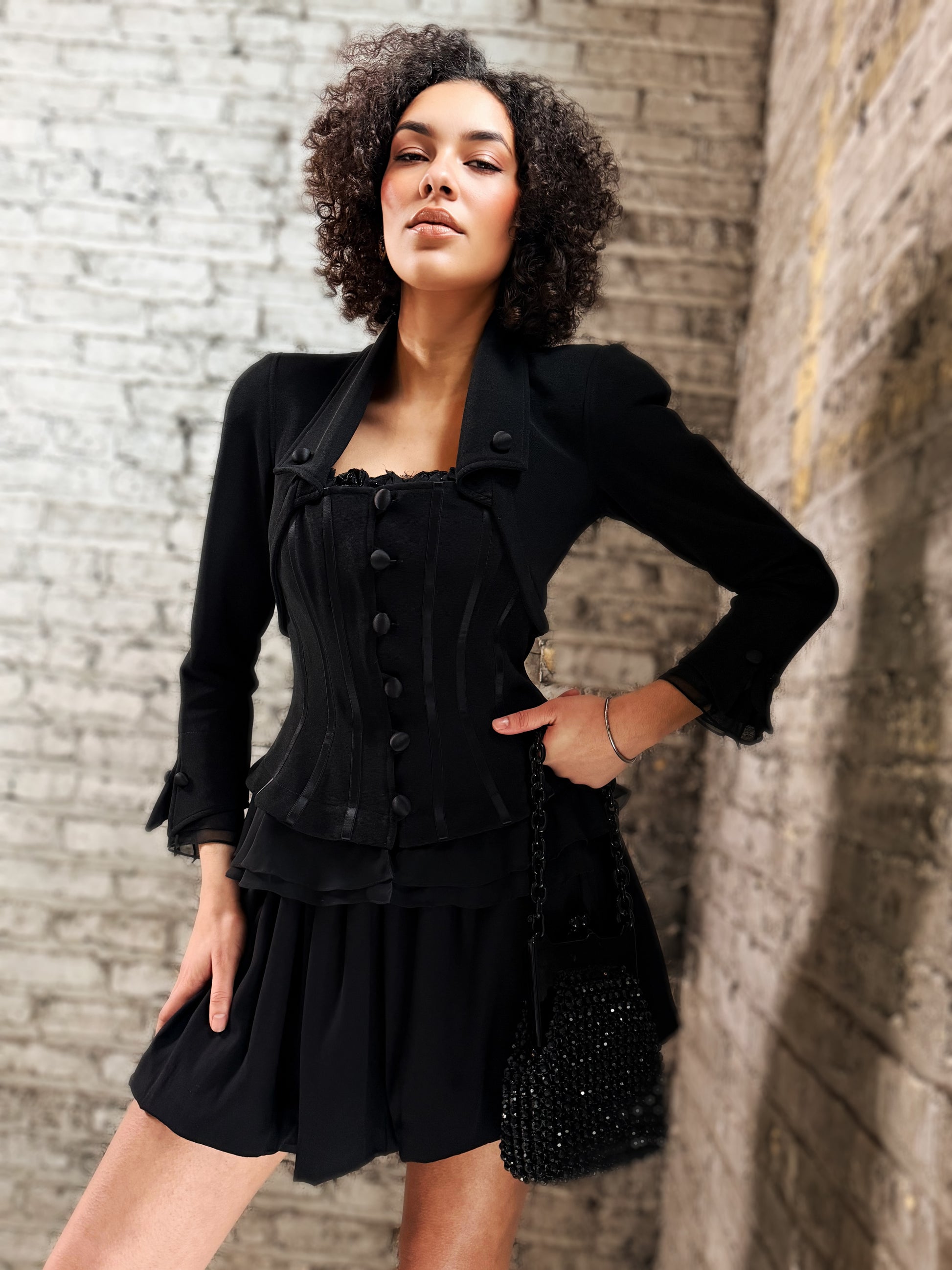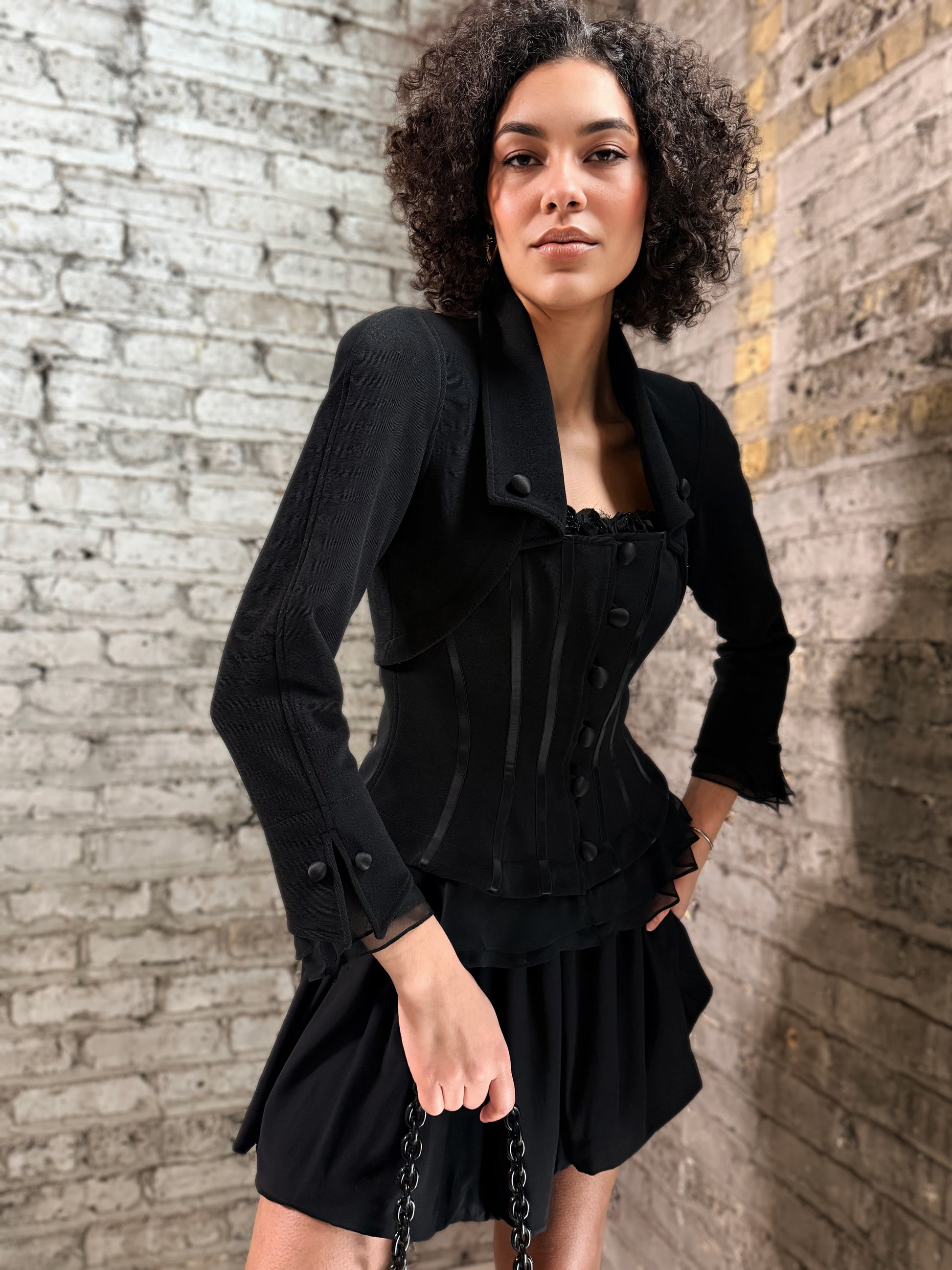 A power piece with a playful edge, this Y2K-era blazer by Tadashi Shoji is all about sculpted drama. Designed with a corset-inspired bodice, vertical seaming, and a flared peplum hem, it cinches the waist while creating a striking hourglass silhouette. The cropped blazer proportions and structured shoulders nod to early-2000s glamour with runway-level polish. Wear it as a statement top or layered over sheer tights for a bold, fashion-forward moment. This is vintage Tadashi at its most confident.