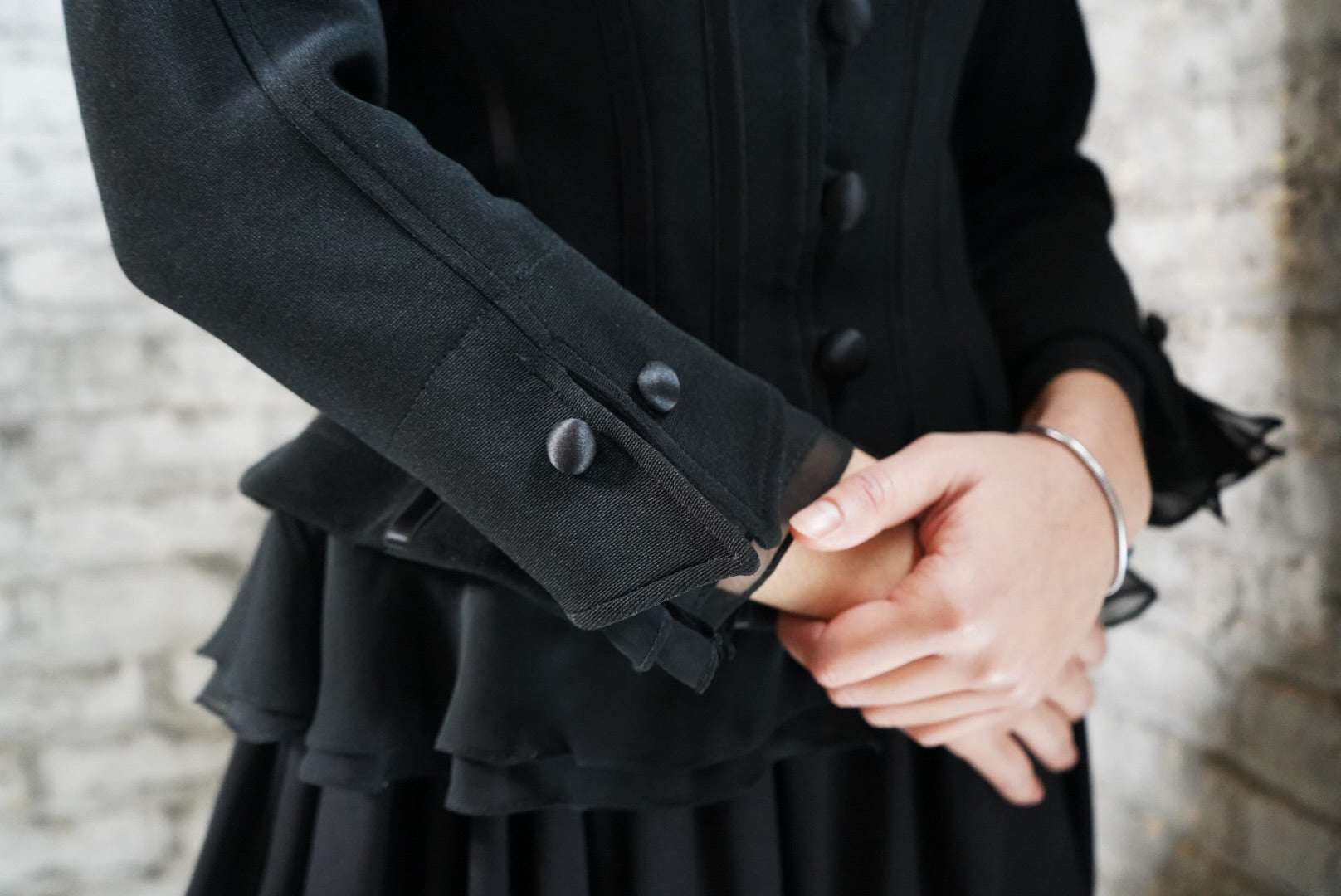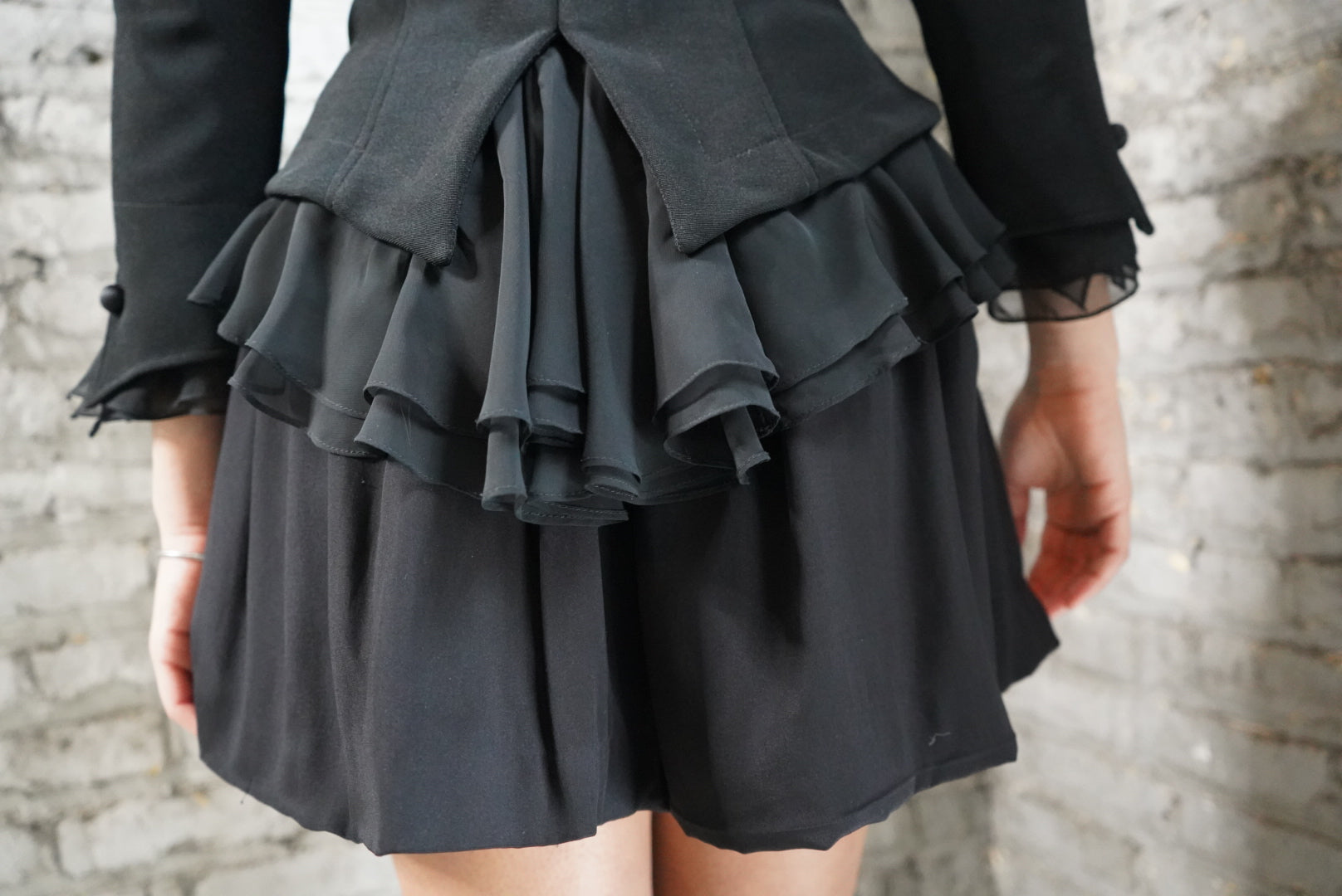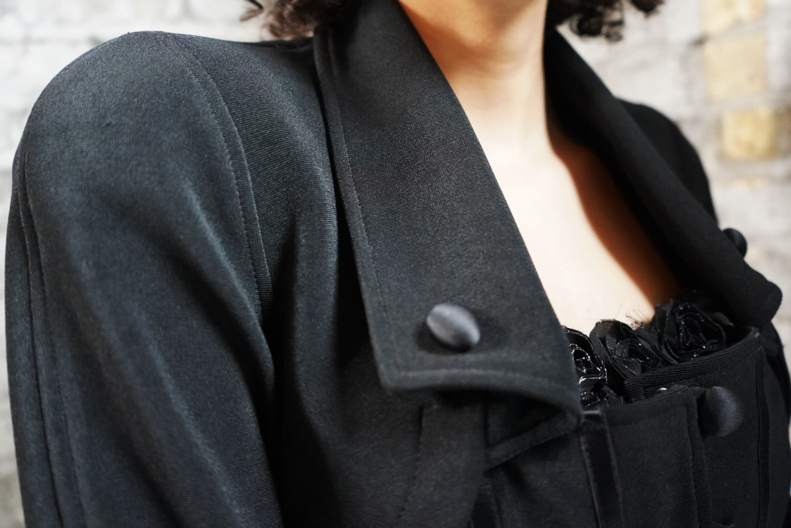 A power piece with a playful edge, this Y2K-era blazer by Tadashi Shoji is all about sculpted drama. Designed with a corset-inspired bodice, vertical seaming, and a flared peplum hem, it cinches the waist while creating a striking hourglass silhouette. The cropped blazer proportions and structured shoulders nod to early-2000s glamour with runway-level polish. Wear it as a statement top or layered over sheer tights for a bold, fashion-forward moment. This is vintage Tadashi at its most confident.