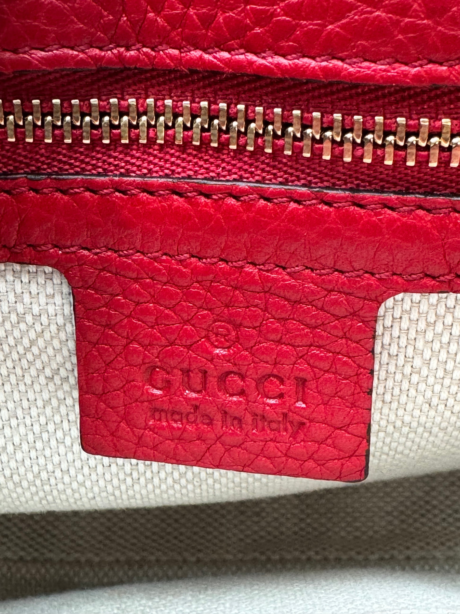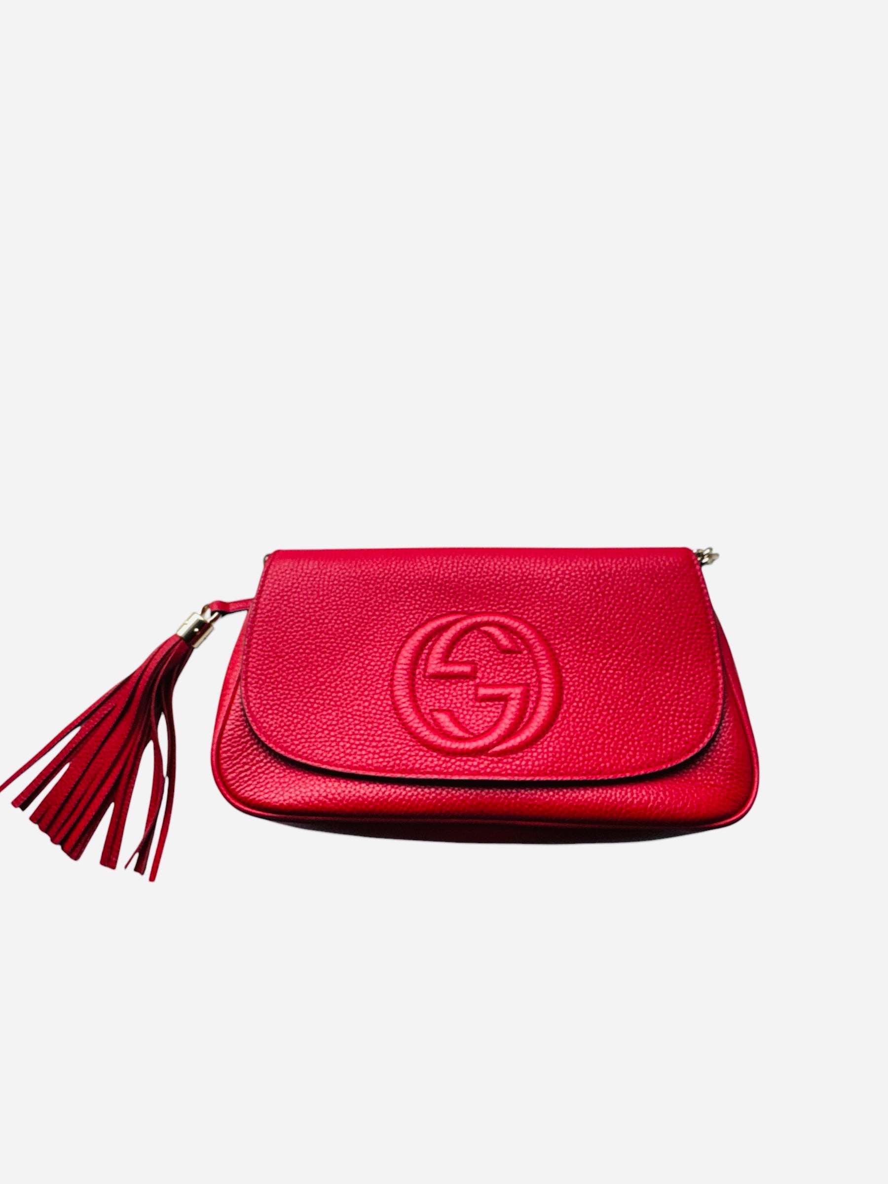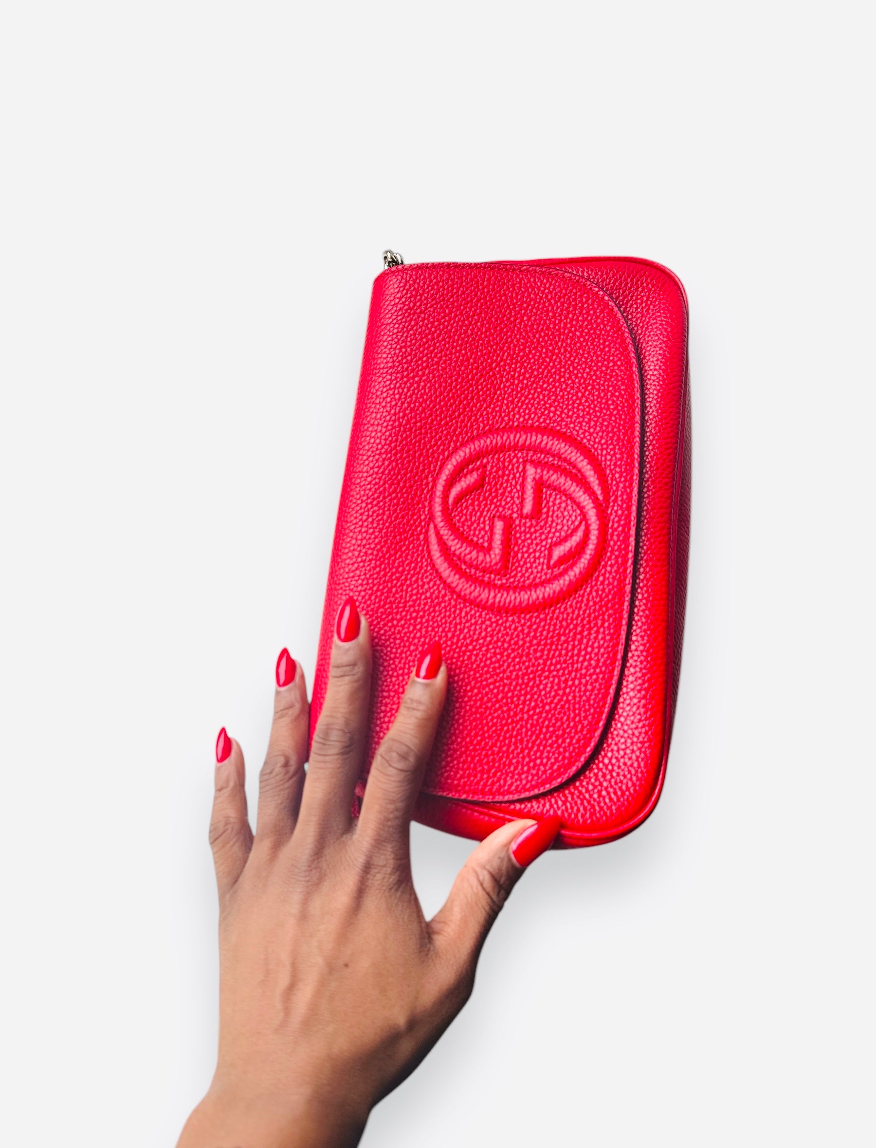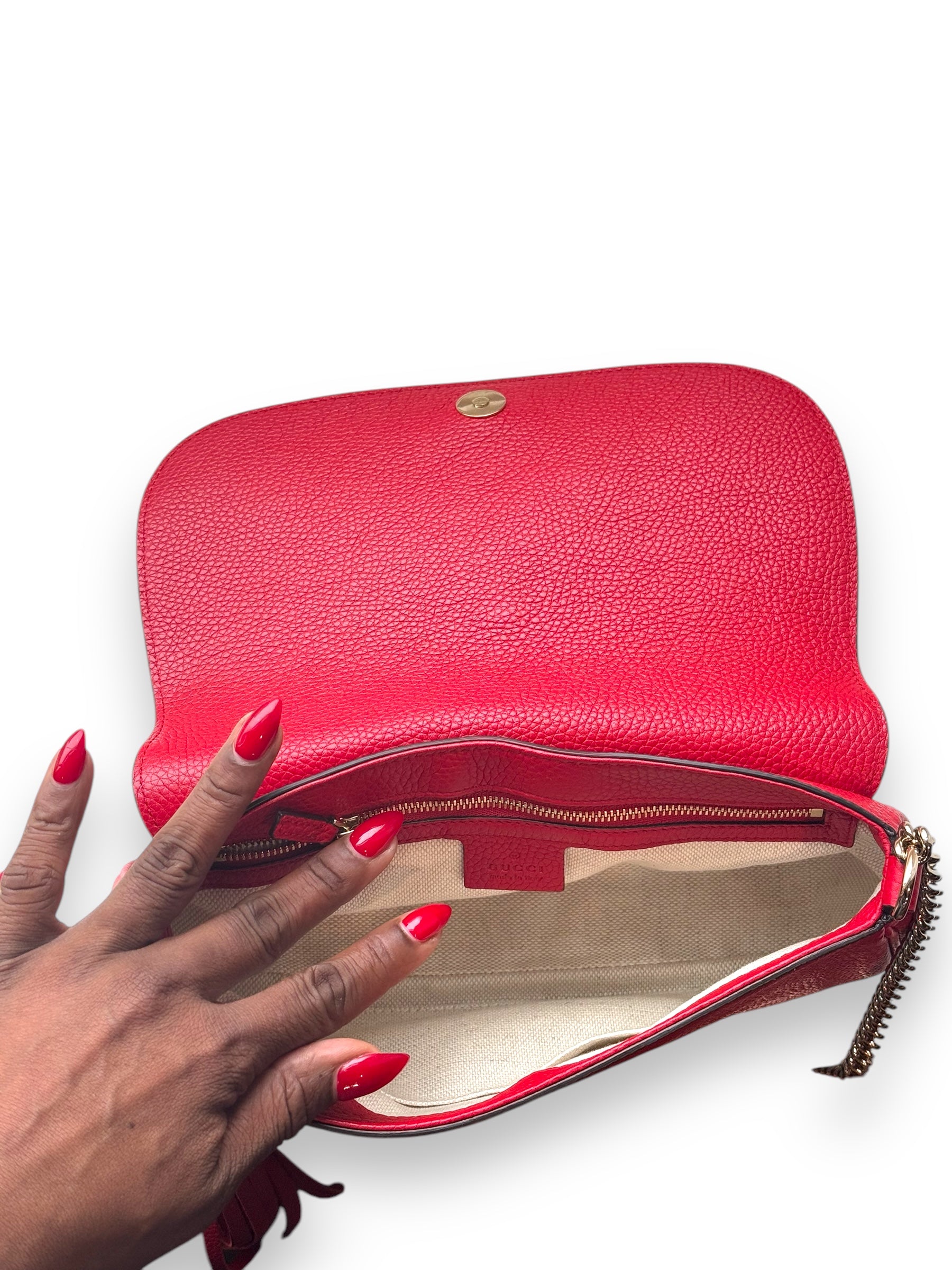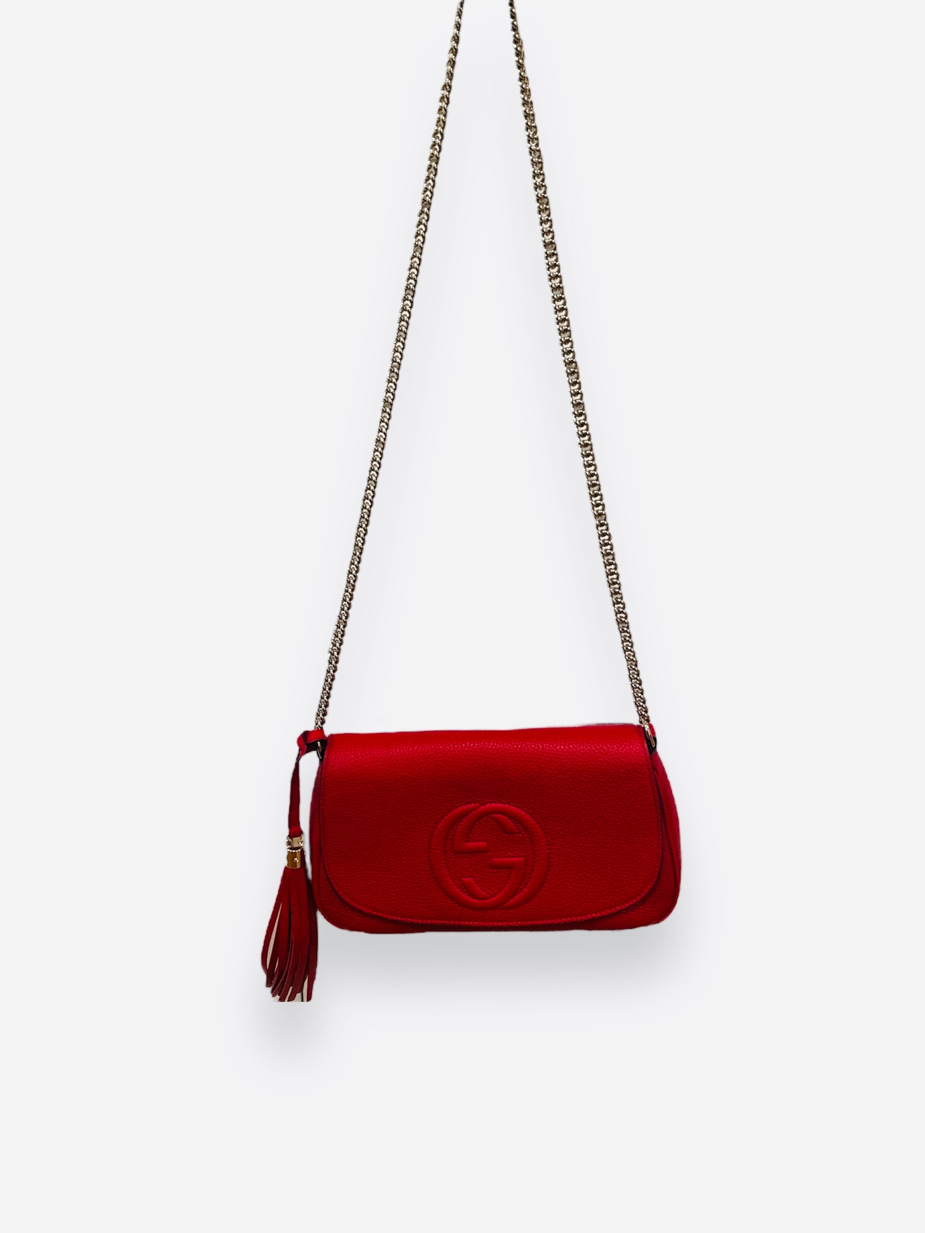 Indulge in luxury with the Trend: Gucci Disco Gold Chain Bag. This sexy red crossbody bag features a stunning gold chain that adds a touch of elegance to any outfit. Perfectly sized to fit your cell phone, carry all your essentials in style. Elevate your look with this exclusive and sophisticated accessory.