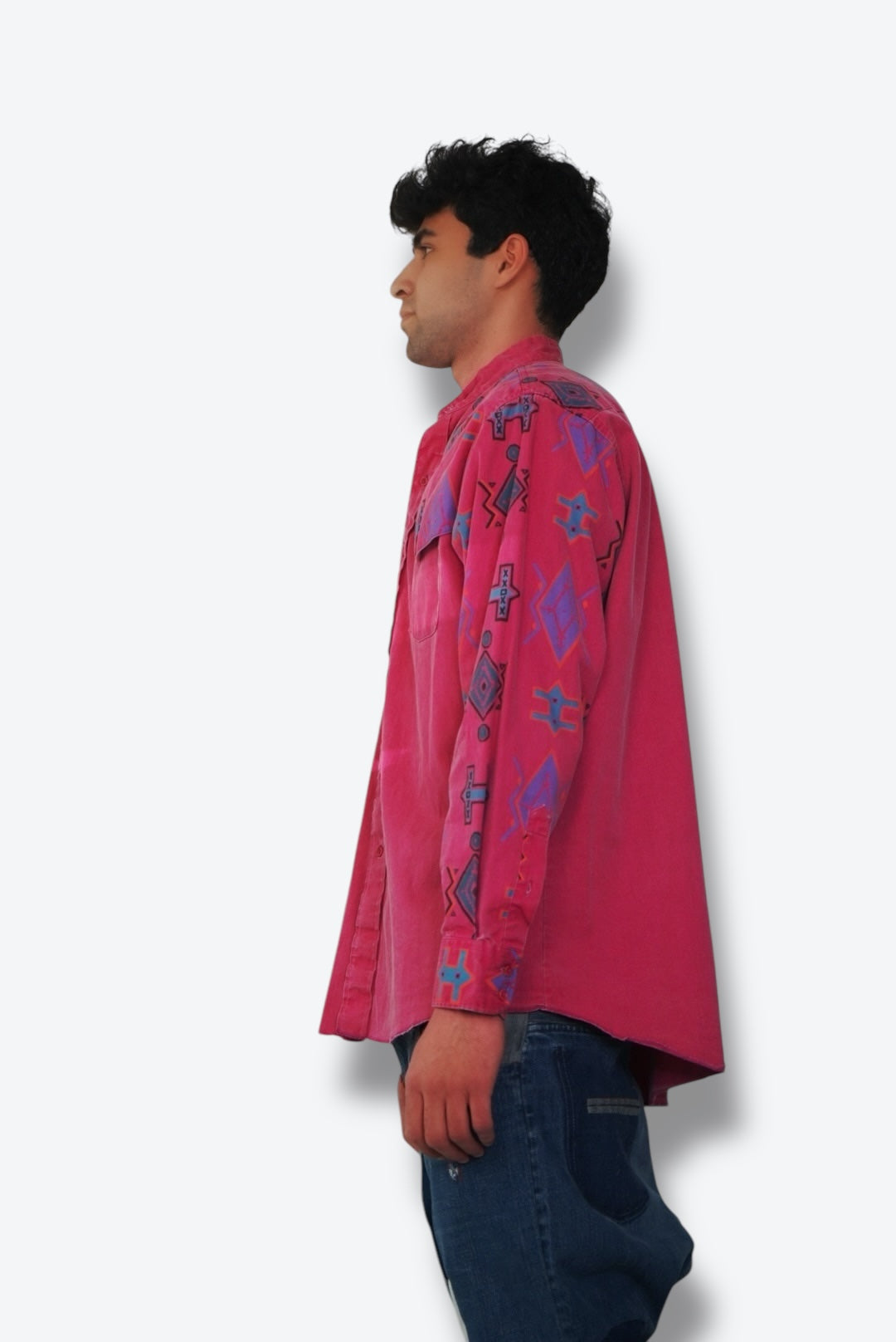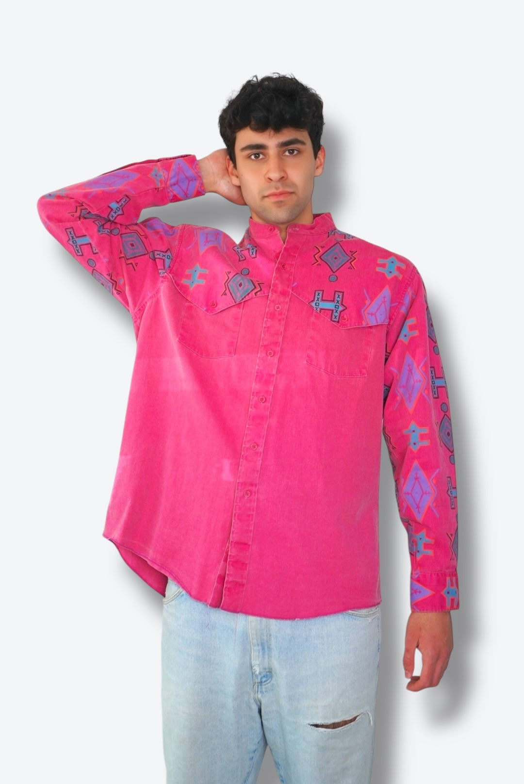 Unleash your inner rebel with our Unisex Wrangler Denim Top. Made with heavy weight cotton, this pink graffiti button top features the iconic Wrangler denim. Take your casual style to the next level with this edgy and comfortable piece.