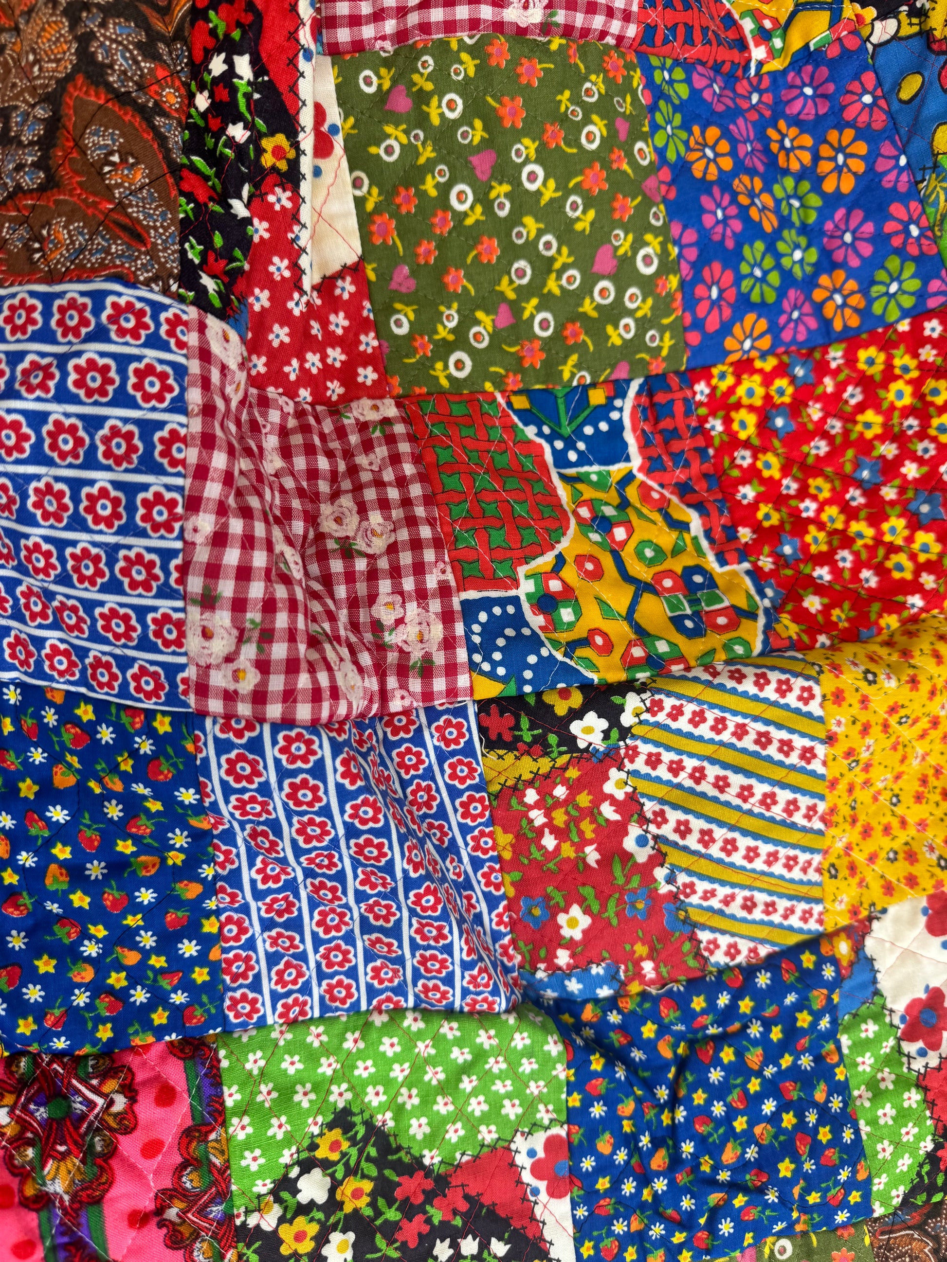 Step into vintage folk charm with this authentic 1970s handmade patchwork skirt. Crafted from vibrant calico and gingham cotton squares, this maxi-length beauty captures the essence of the boho-prairie era. Each patch tells its own story, making this one-of-a-kind skirt a true wearable piece of art.