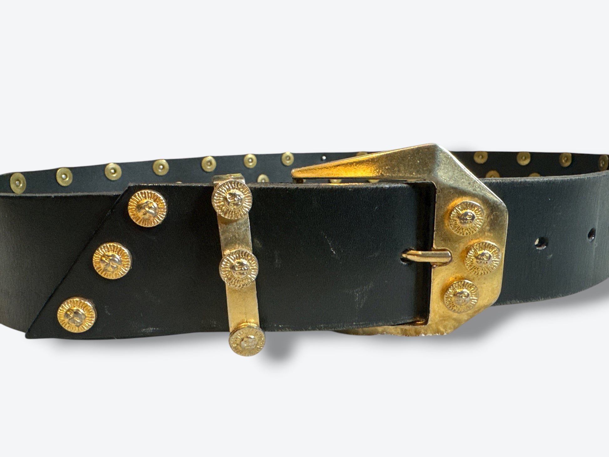 Vintage Black “Sun” Studded Leather Belt with Textured Gold Hardware