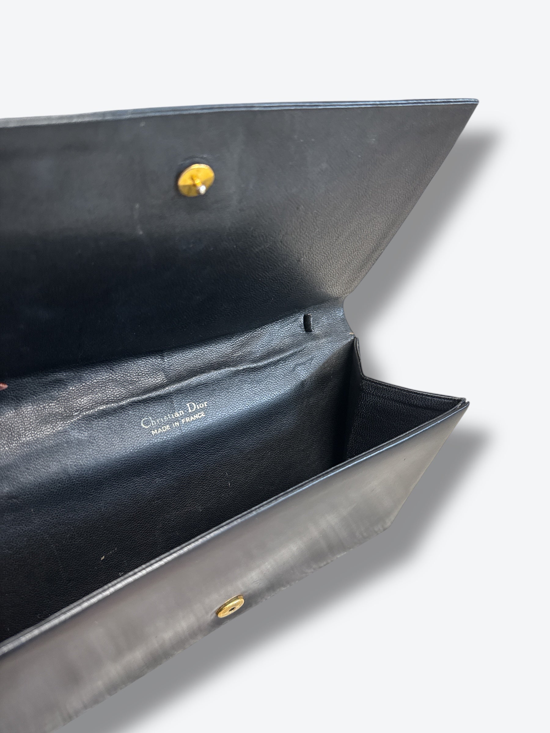 This vintage Christian Dior clutch exudes Parisian sophistication with its sleek black leather exterior and minimal silhouette. Crafted in France, it features a structured envelope design with a gold-tone Dior logo emblem at the corner and a snap closure that opens to a fully lined leather interior stamped “Christian Dior Made in France.” The clean lines and impeccable craftsmanship capture the understated luxury Dior was known for during the late 1970s to early 1980s.