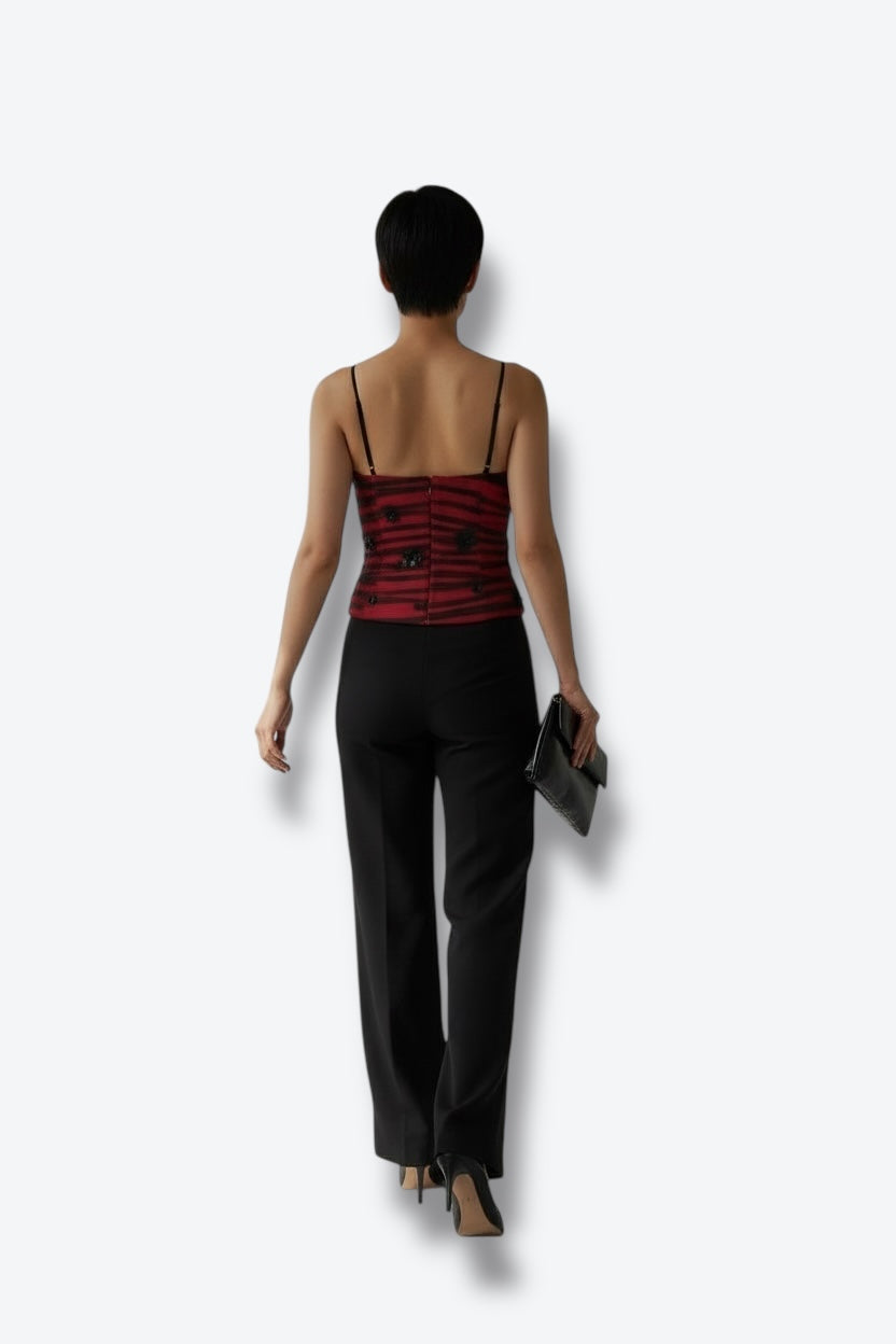 A dramatic, romantic vintage top from Kay Unger New York, featuring rich red and black horizontal striping with delicate black dimensional floral appliqués. This structured, corset-inspired silhouette offers a fitted bodice with thin spaghetti straps and boning-style seam work that creates an ultra-flattering shape.