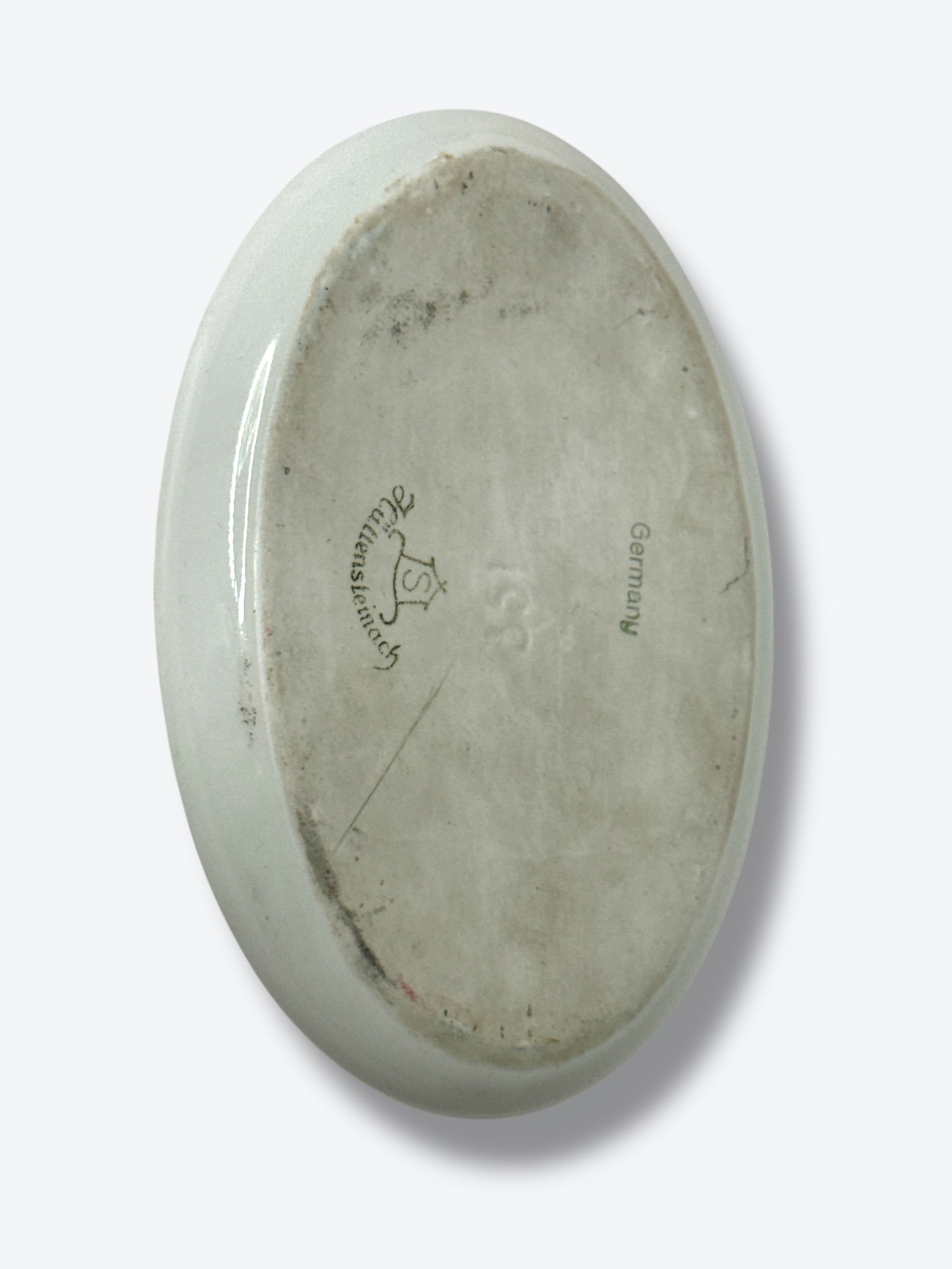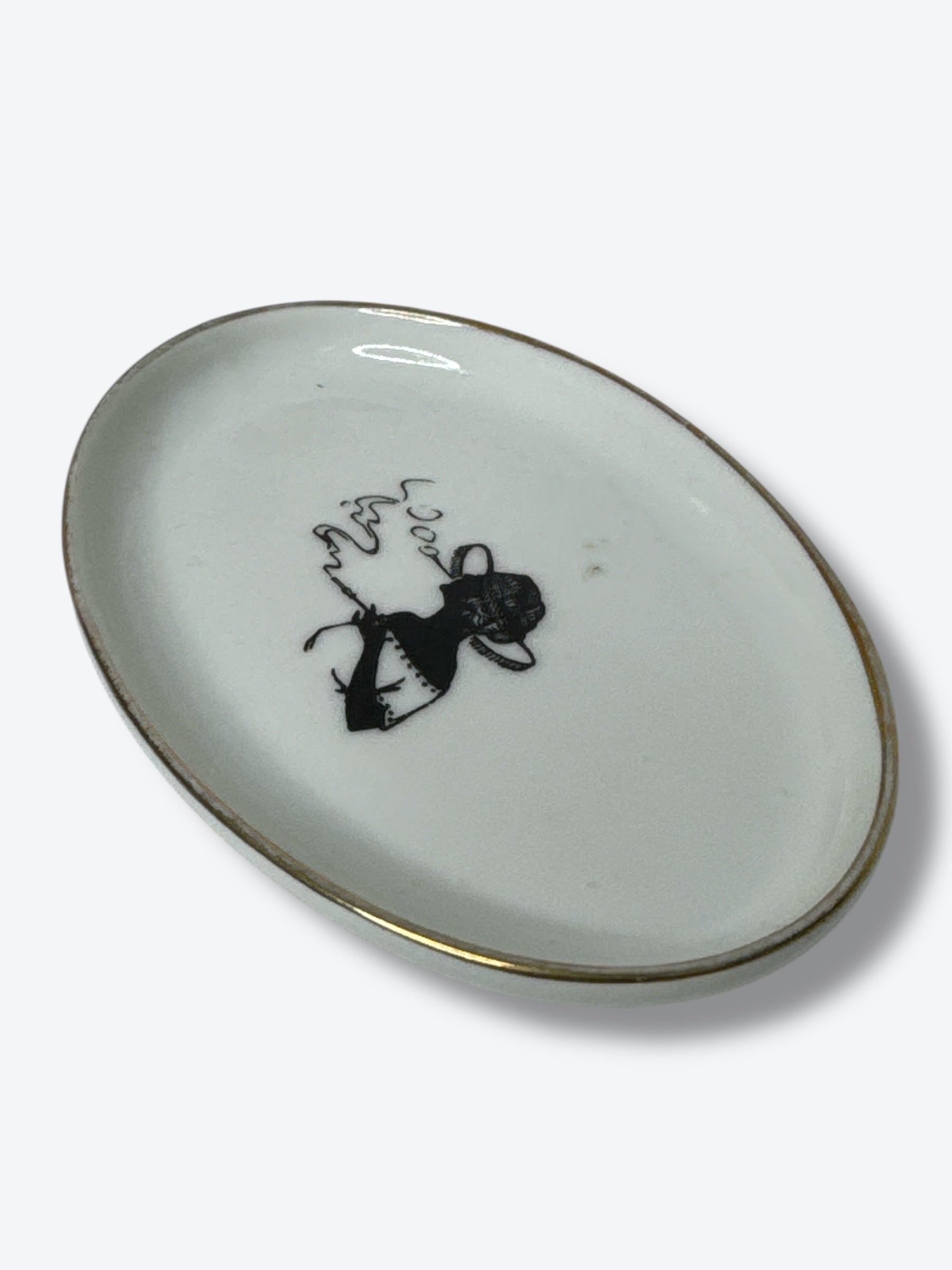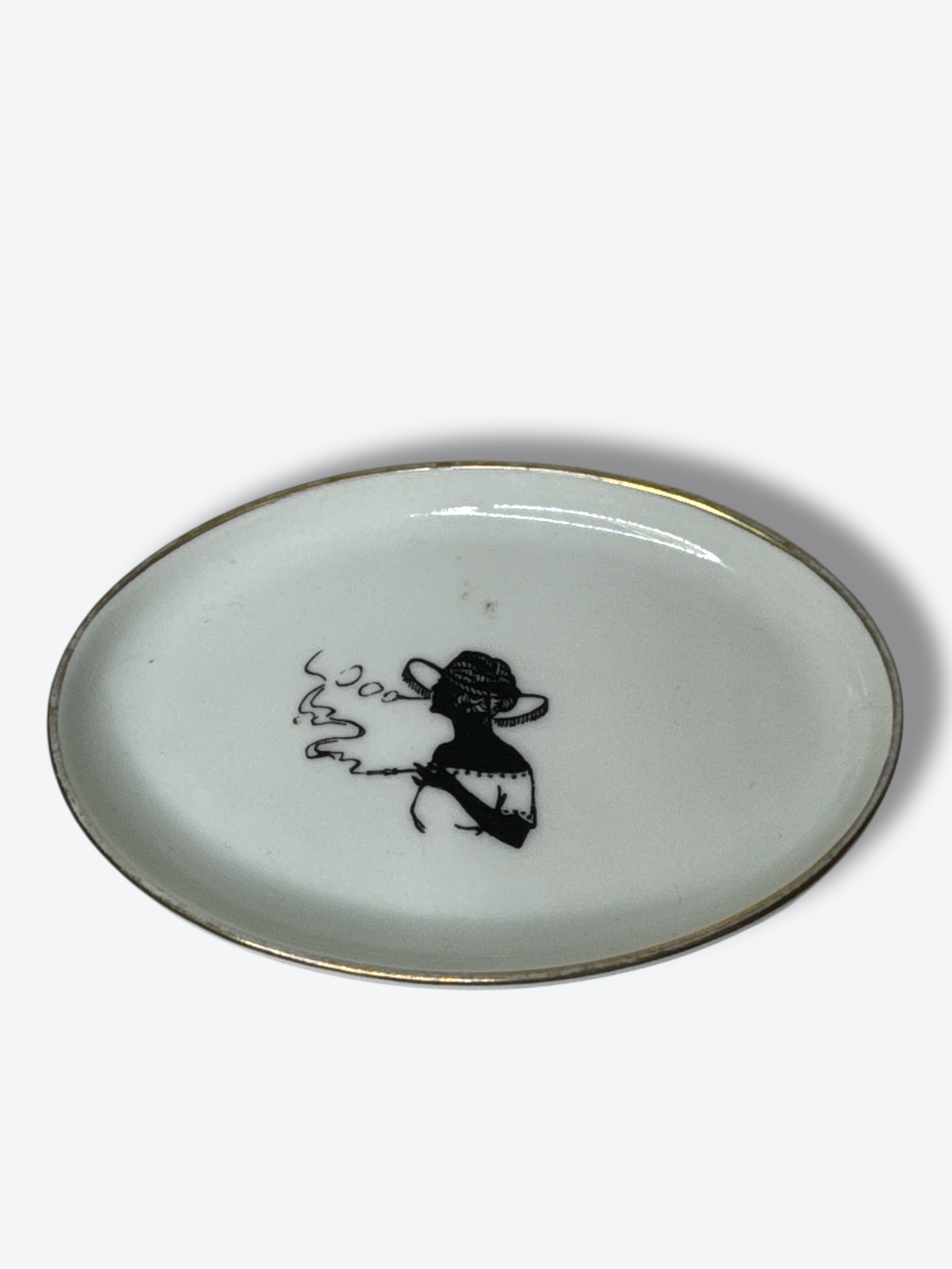 Spice up your home decor with this Vintage Made in Germany Ring/Change Plate. Featuring a fun smoking woman illustration, it's the perfect blend of quirkiness and functionality. Use it as a decorative plate or to hold your spare change - let this plate add character to any room!