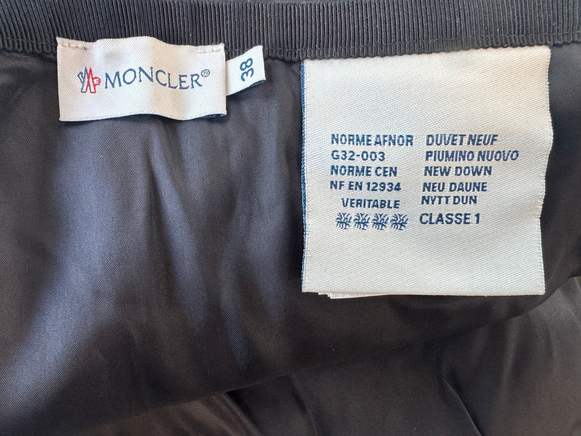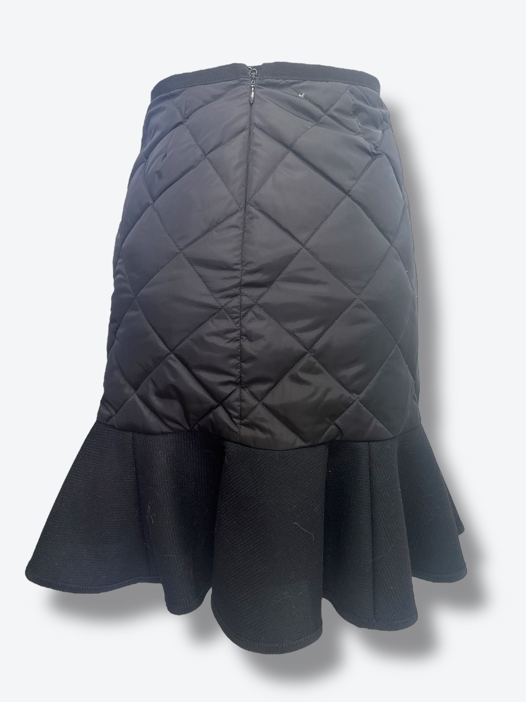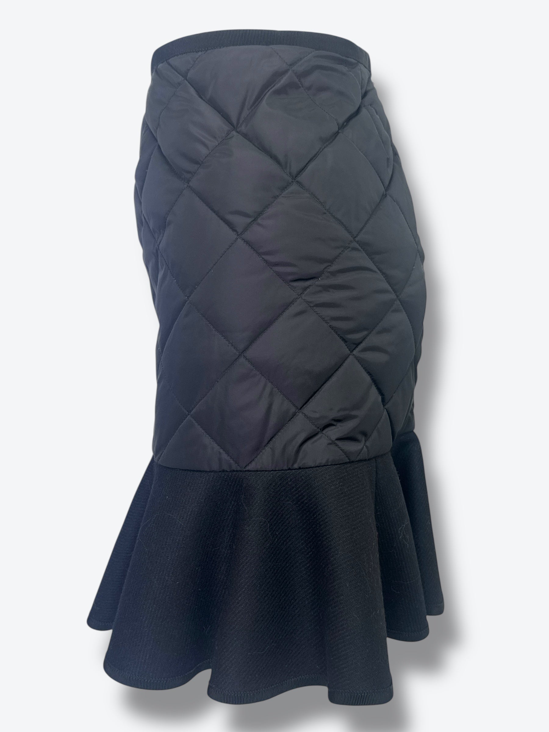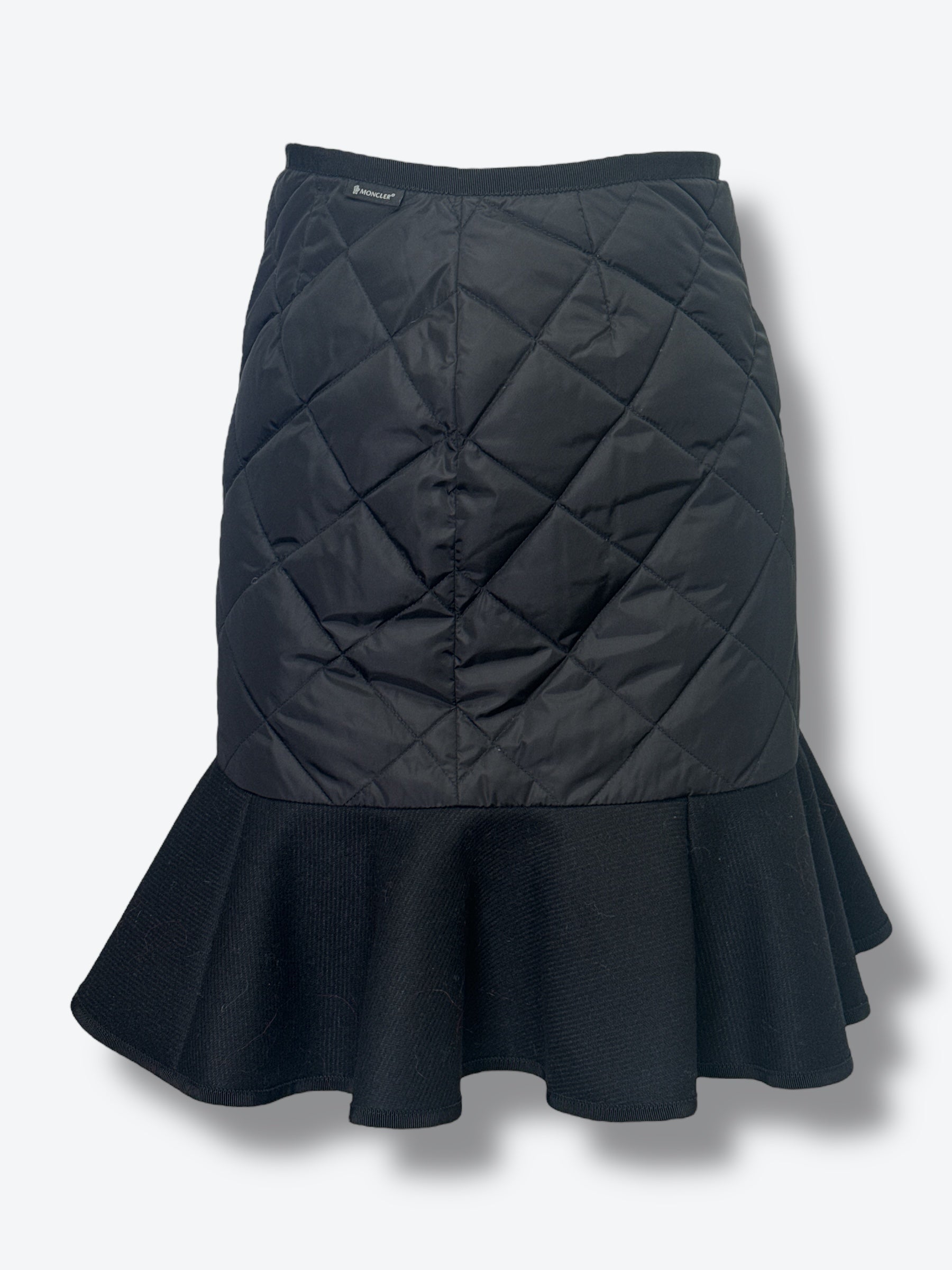 Elevate your winter wardrobe with this statement skirt from Moncler, where sporty functionality meets feminine flair. Crafted with the brand’s signature quilted nylon, the skirt features a sleek, diamond-stitched upper that hugs the hips, contrasted by a structured flounce hem that adds volume and movement. An elastic waistband ensures effortless wear, while the flared rib-knit bottom lends cozy sophistication. Ideal for après-ski styling or city chic layering, this piece brings warmth, texture, and modern elegance to cold-weather dressing.