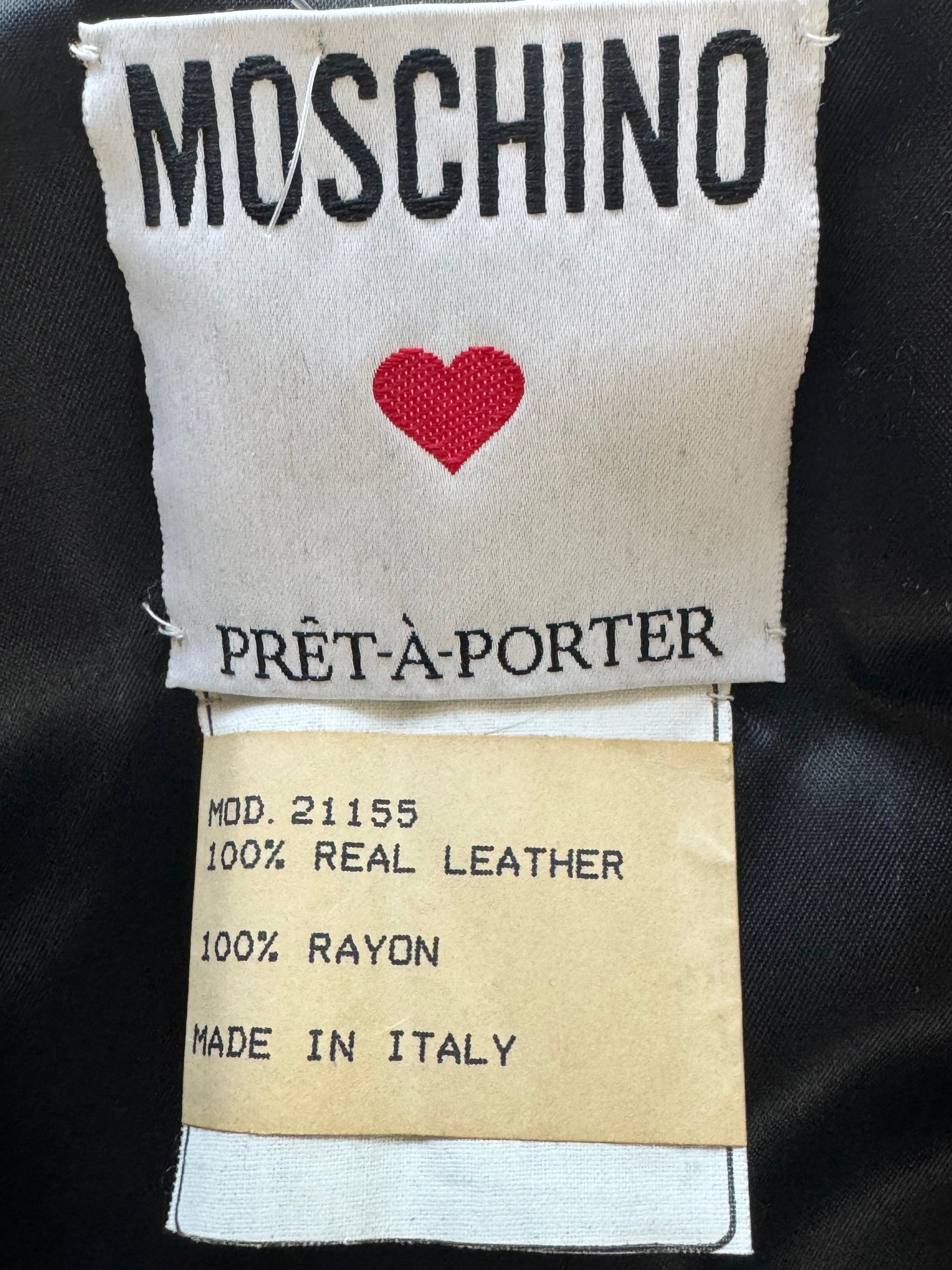 The iconic red heart label from Moschino’s Prêt-à-Porter line, designed under the direction of Franco Moschino, makes this a highly collectible piece that blends edge, elegance, and irony—a true hallmark of the brand’s golden era.